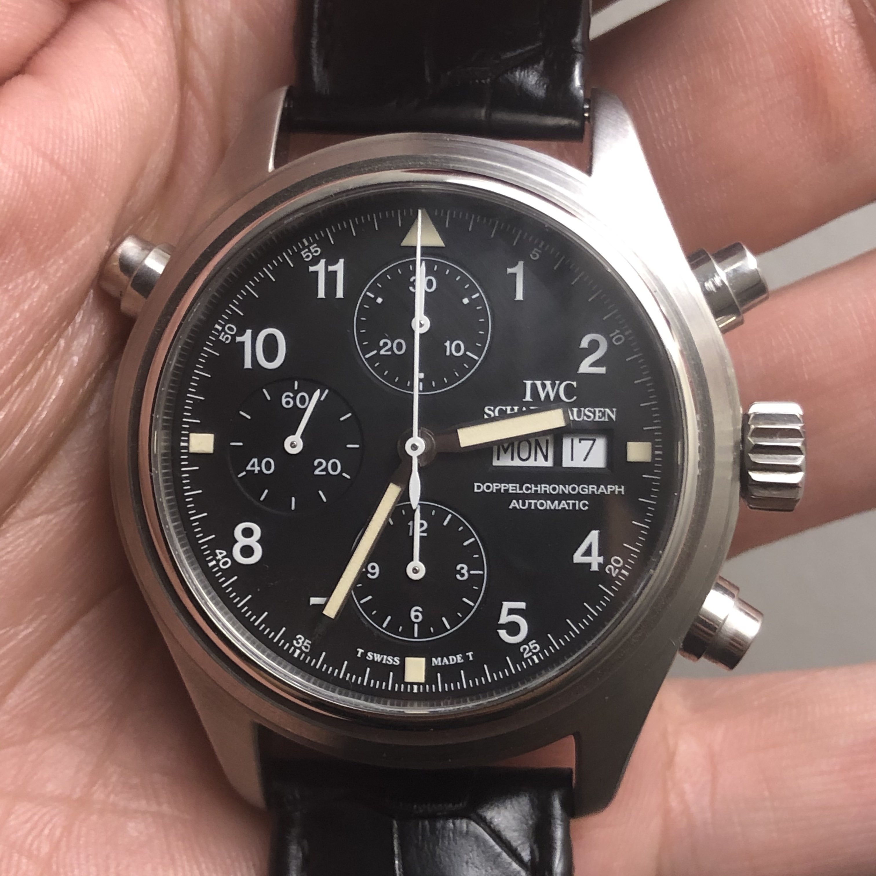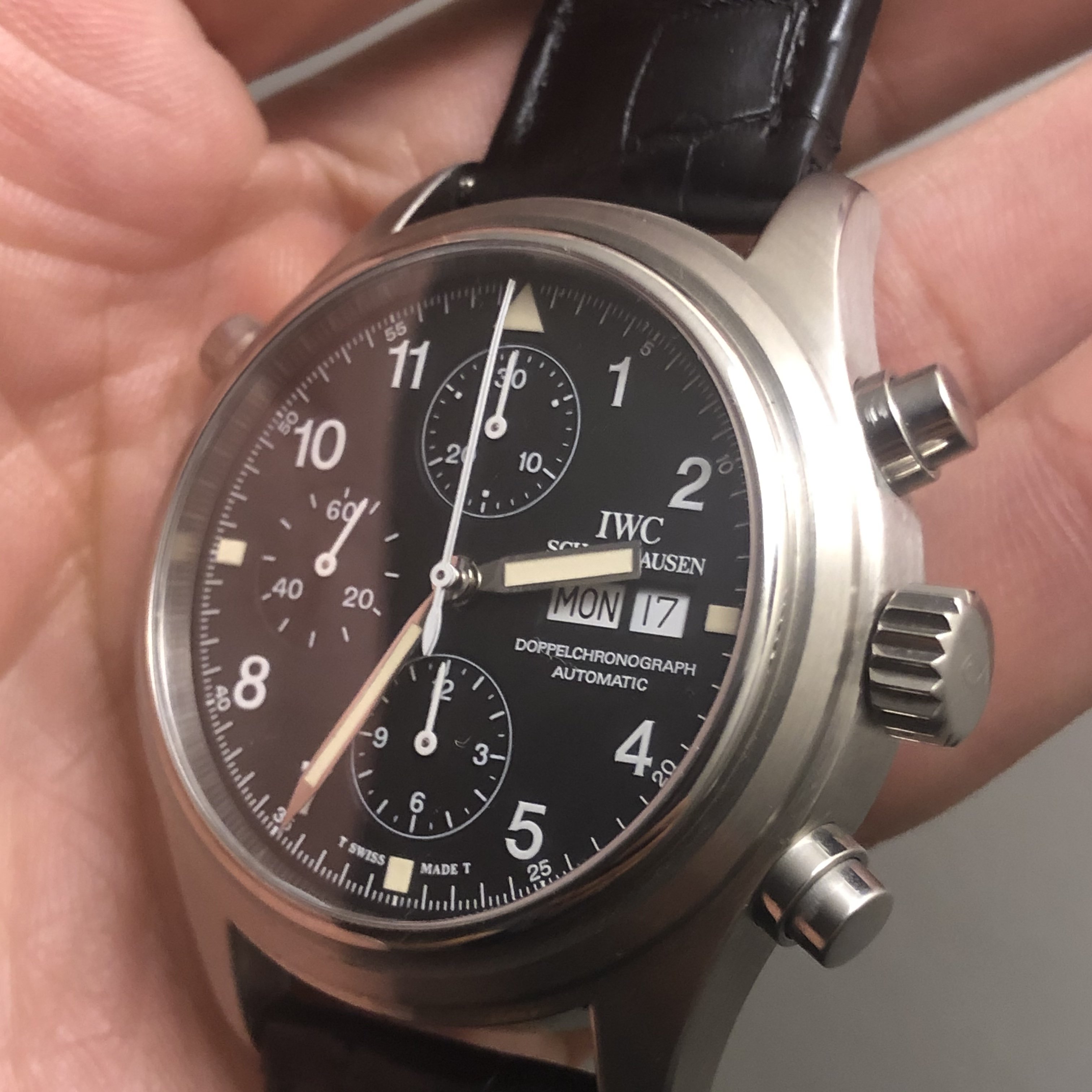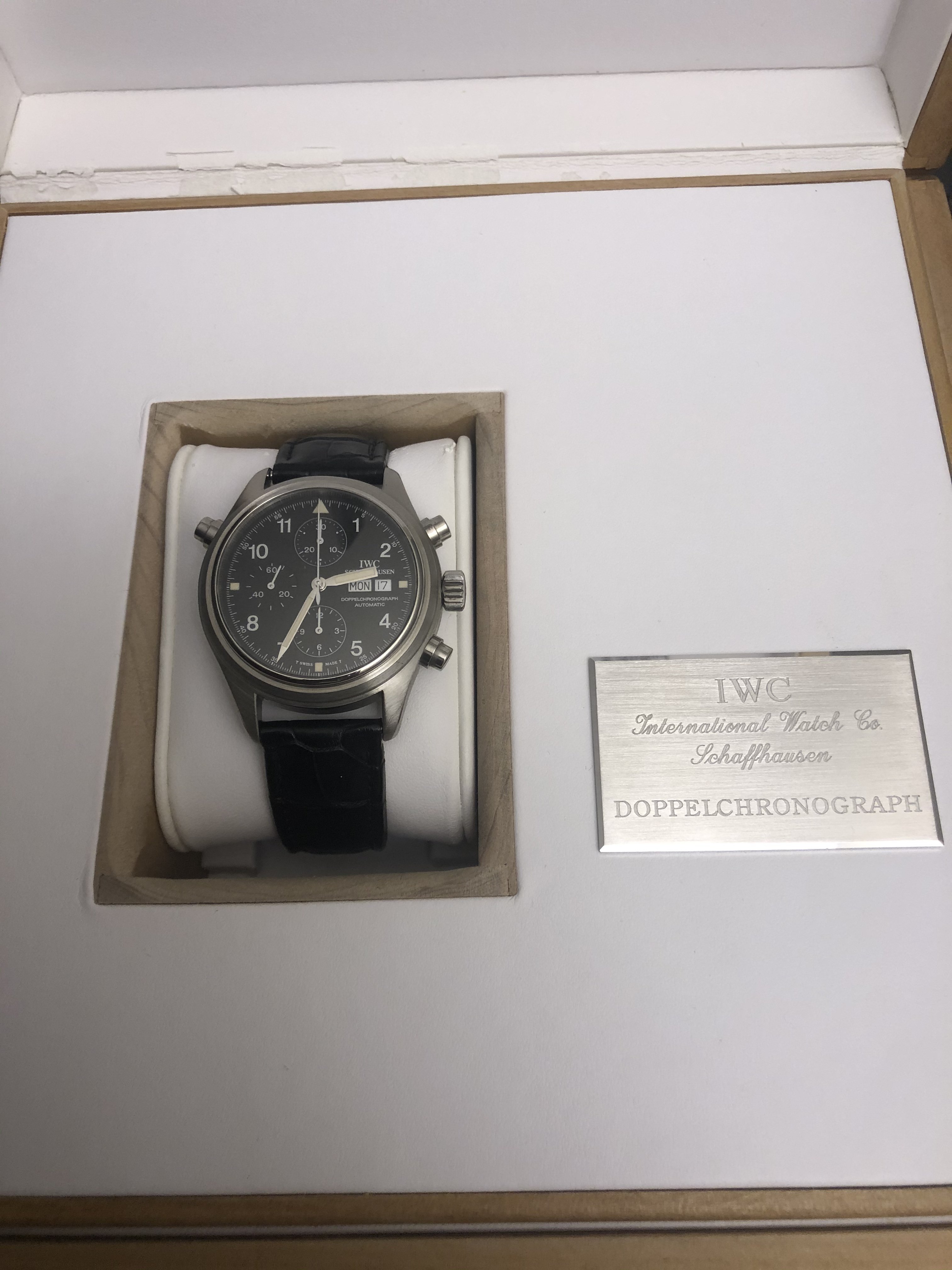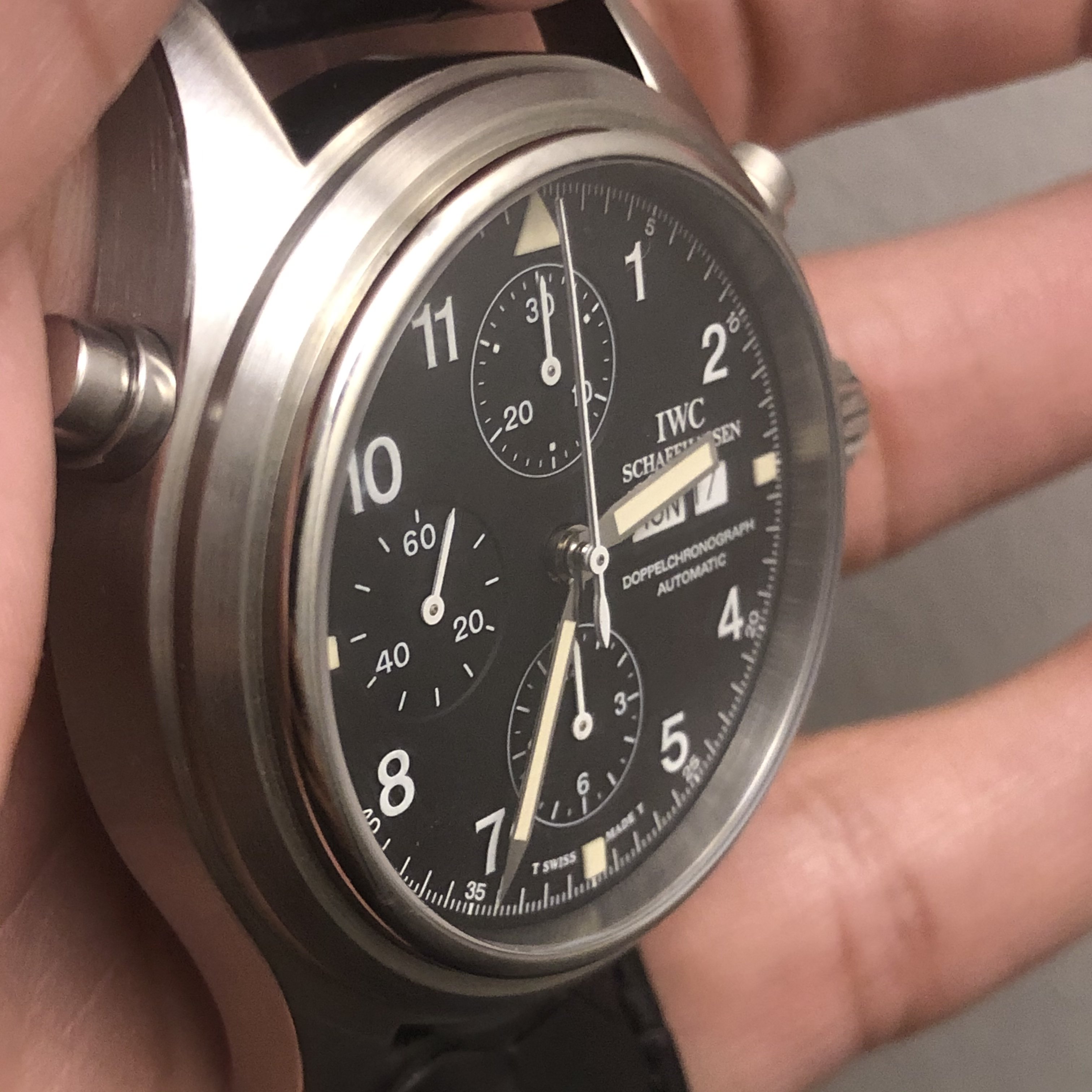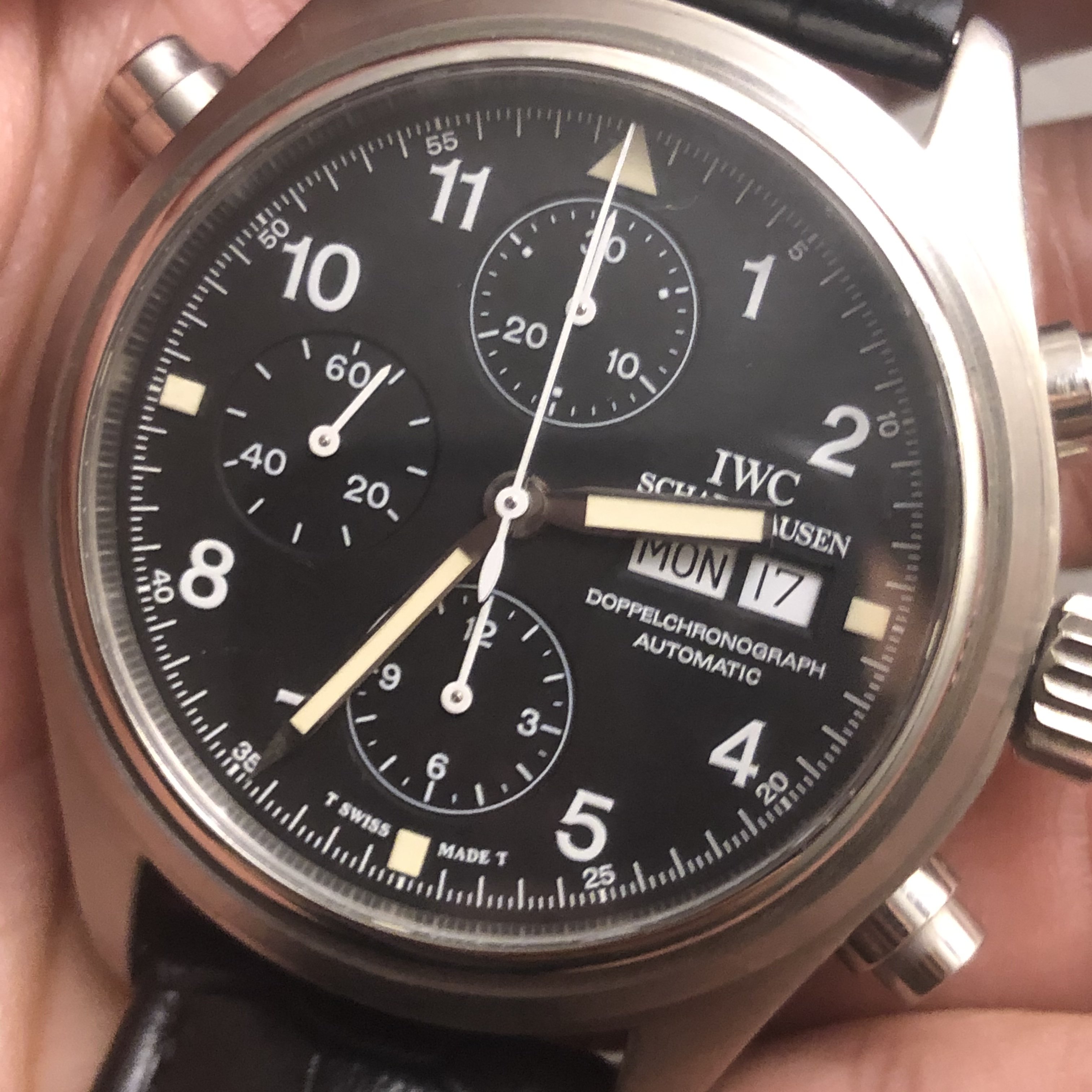 ·Hello forum member. I have for sale A tritium 3713 in beautiful condition. All components are factory original. Photos of actual watch. Silver-tone stainless steel case with a black leather strap. Fixed silver-tone stainless steel bezel. Black dial with silver-tone hands and Arabic numeral hour markers. Minute markers around the outer rim. Dial Type: Analog. Tritium hands and markers. Day of the week and date display at the 3 o'clock position in German. Chronograph has a scratch resistant sapphire crystal. Screw down crown. Solid case back. Round case shape, case size: 42 mm, case thickness: 16 mm. Band width: 20 mm. Water resistant at 60 meters / 200 feet. Movement functions perfectly. split seconds function works flawlessly. Chronograph function resets and starts as it should. Watch comes with its original inner/outer box. It also has to original paperwork. This beautiful 3713 is a complete set. My asking price is 4475usd or best offer. If you need extra pictures or have extra questions feel free to email/dm me.