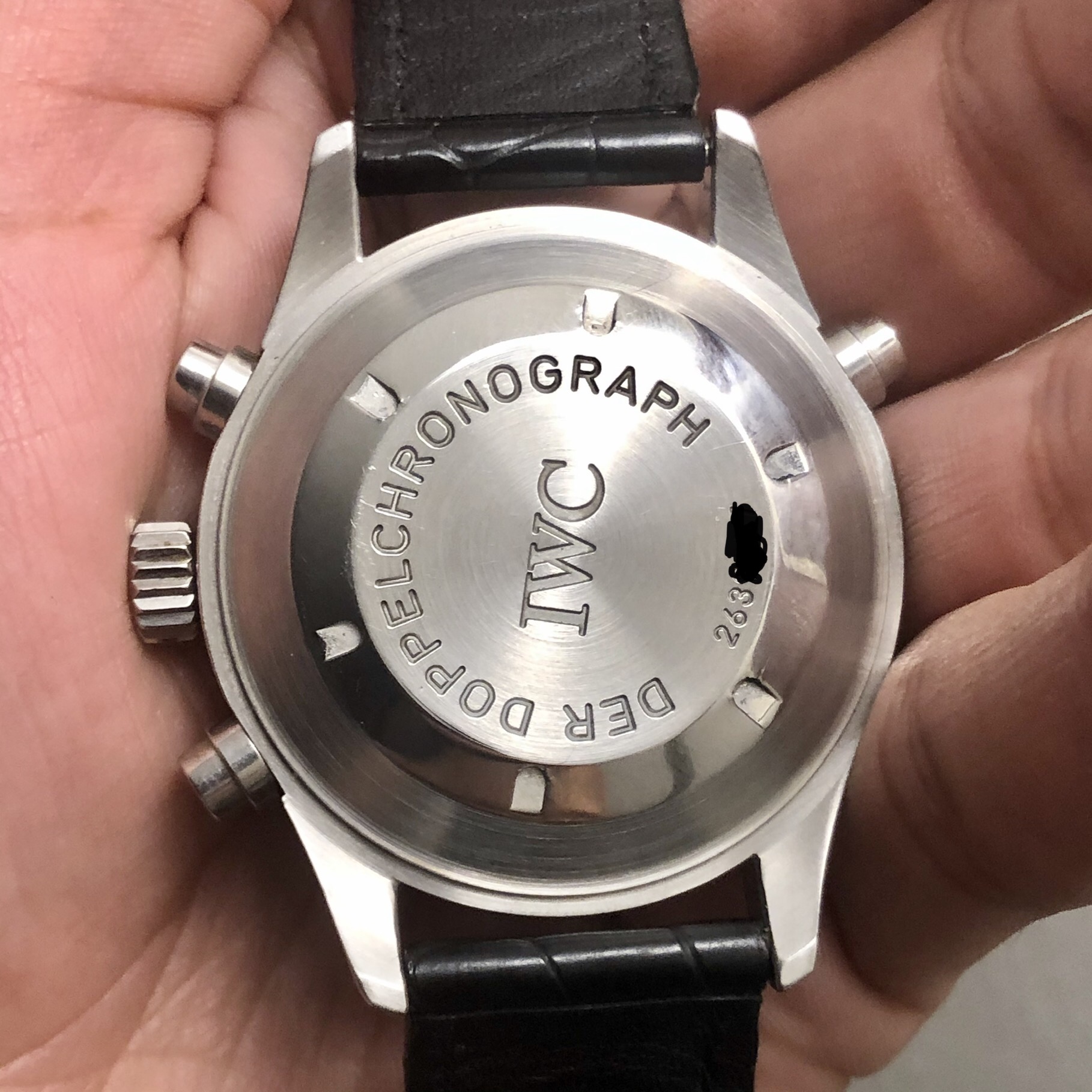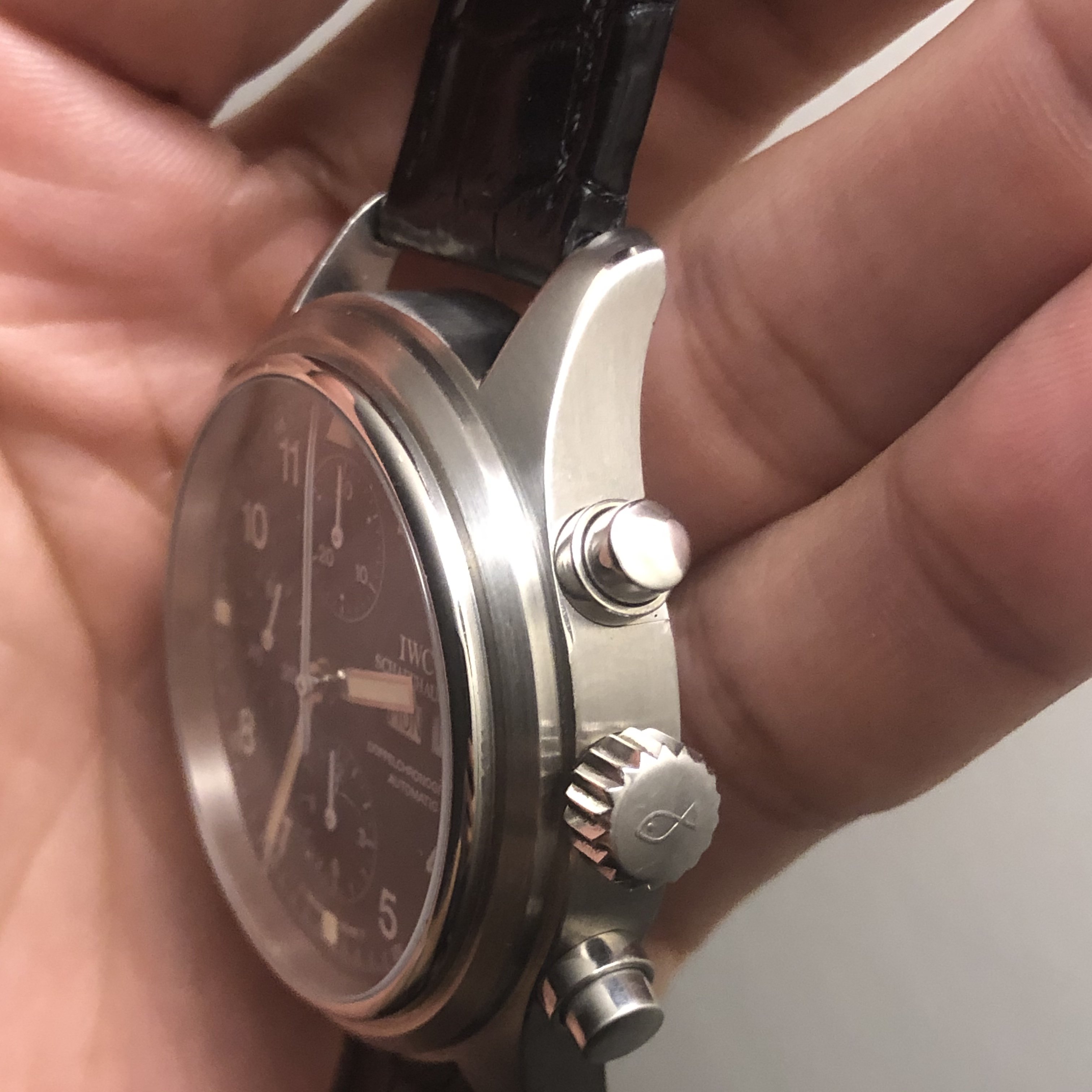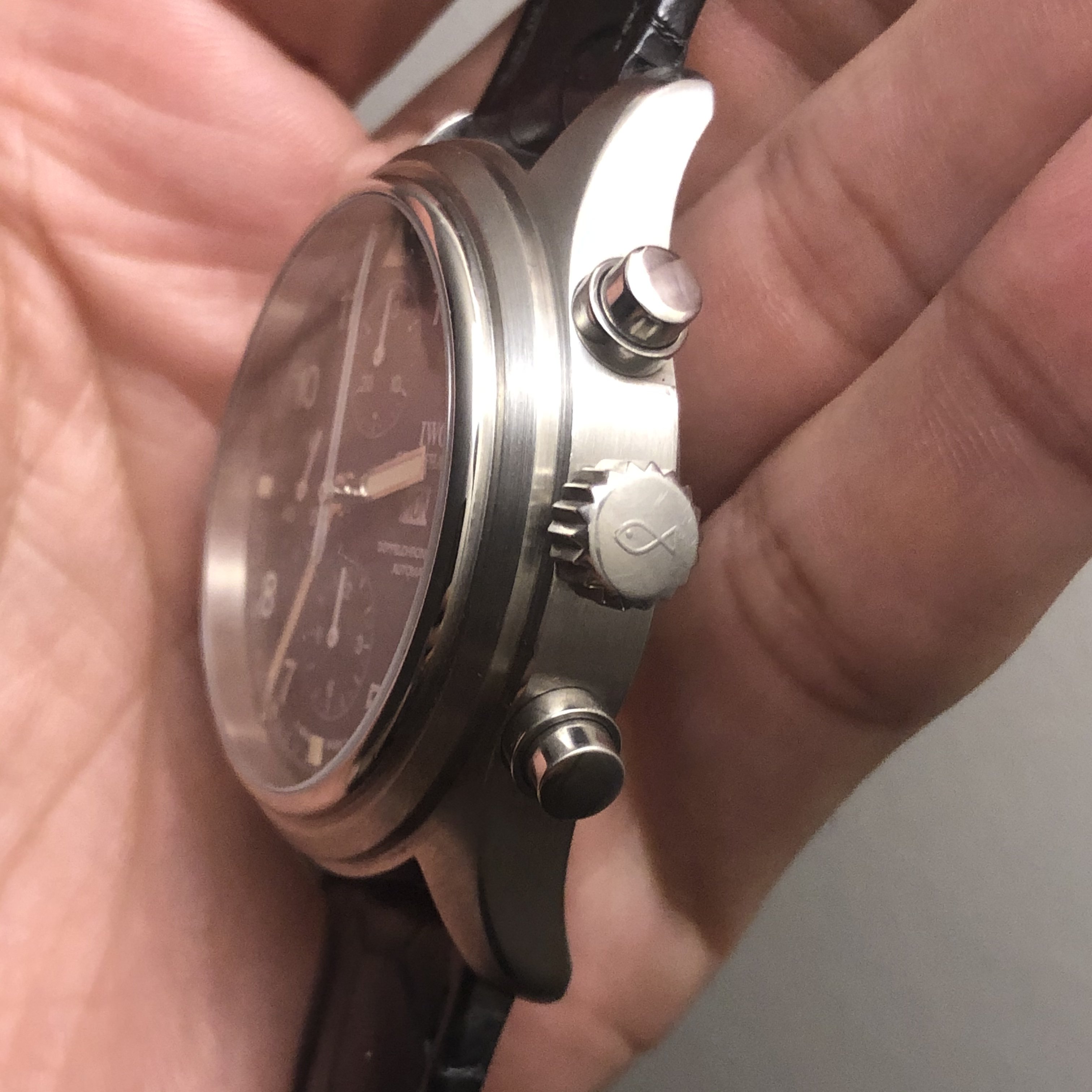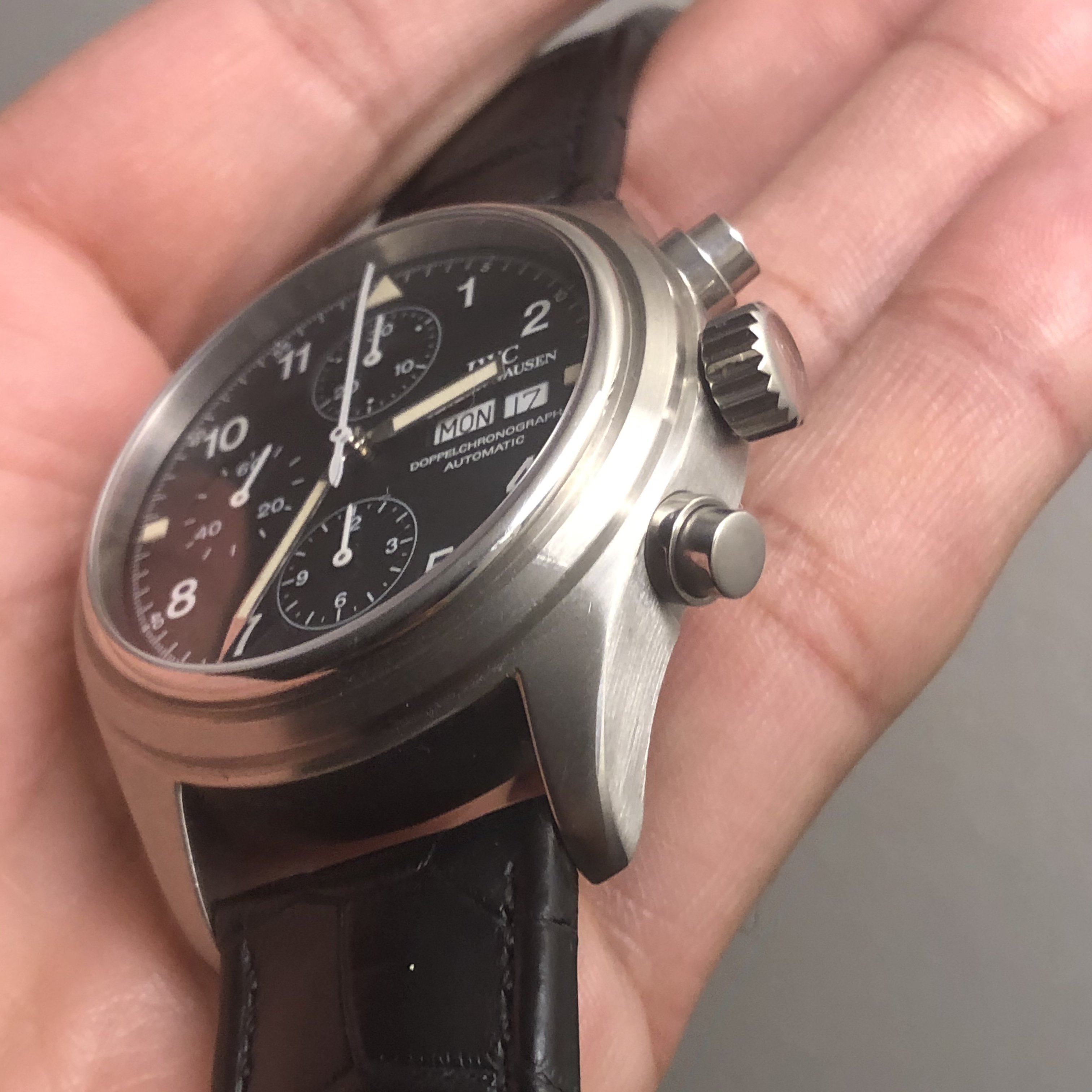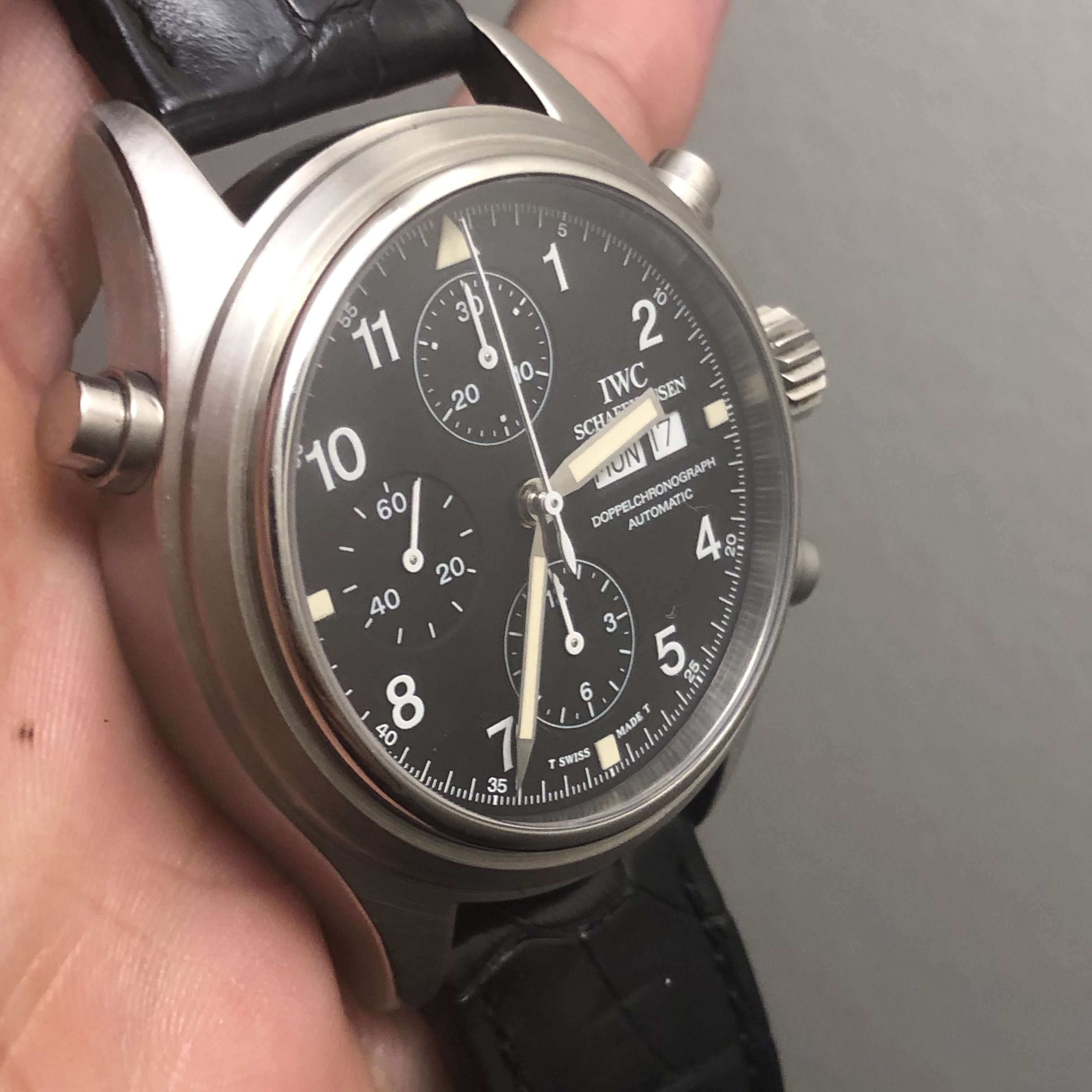 ·Hello forum member. I have for sale A tritium 3713 in beautiful condition. All components are factory original. Photos of actual watch. Silver-tone stainless steel case with a black leather strap. Fixed silver-tone stainless steel bezel. Black dial with silver-tone hands and Arabic numeral hour markers. Minute markers around the outer rim. Dial Type: Analog. Tritium hands and markers. Day of the week and date display at the 3 o'clock position in German. Chronograph has a scratch resistant sapphire crystal. Screw down crown. Solid case back. Round case shape, case size: 42 mm, case thickness: 16 mm. Band width: 20 mm. Water resistant at 60 meters / 200 feet. Movement functions perfectly. split seconds function works flawlessly. Chronograph function resets and starts as it should. Watch comes with its original inner/outer box. It also has to original paperwork. This beautiful 3713 is a complete set. My asking price is 4475usd or best offer. If you need extra pictures or have extra questions feel free to email/dm me.