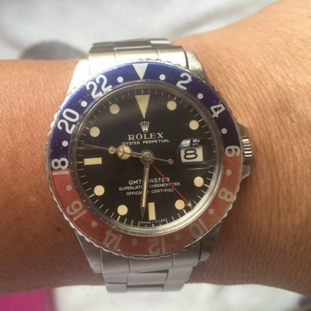 ·A friend of mine who has 2 Rolex GMT 1675 with Fucshia bezels asked me if I want to swap my small arrow GMT 1675 for one of his plus a little cash consideration. How can I resist such a great offer so the deal was done. Happy now to have a 1967 GMT 1675 with 1.7M serial, mk1 dial and a beautiful fucshia bezel insert.