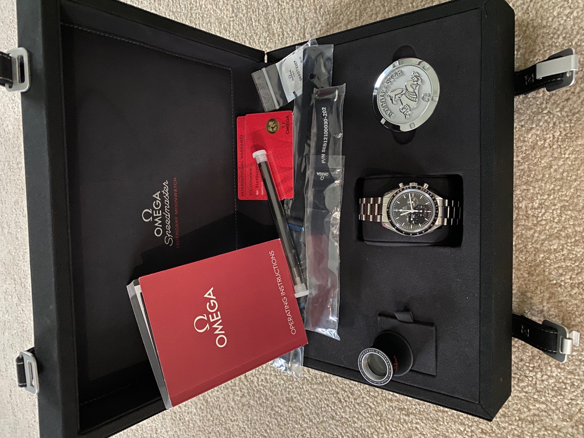 ·Consider me another satisfied customer of demollo. I am not a collector or even a watch aficionado, for that matter. I just decided, after many years of thinking about it, to treat myself to a nice watch. After much consideration, I finally settled on a Speedmaster sapphire sandwich. I went to my local AD to discover that they changed the style this year, and I was not a fan of the new, tapered bracelet. No new, old stock remained. After debating purchasing a pre-owned watch and all the risk that seemed to entail, I stumbled across a post by demollo (Darek) on this forum. Buying a luxury item from overseas seemed equally fraught with risk, but I read so many positive reviews on demollo spanning several years that I decided to take a chance, and could not be more pleased. The communication was fantastic, the shipping handled with extraordinary care, and the watch and entire kit, including, of the utmost importance to me, the completed warranty card, were exactly as advertised. Picture below. Darek shipped the watch on a Monday from Eastern Europe, and I had it in my hands in the eastern United States that Friday. If anyone is nervous about entering into a transaction with demollo, rest assured that you will not regret it.
