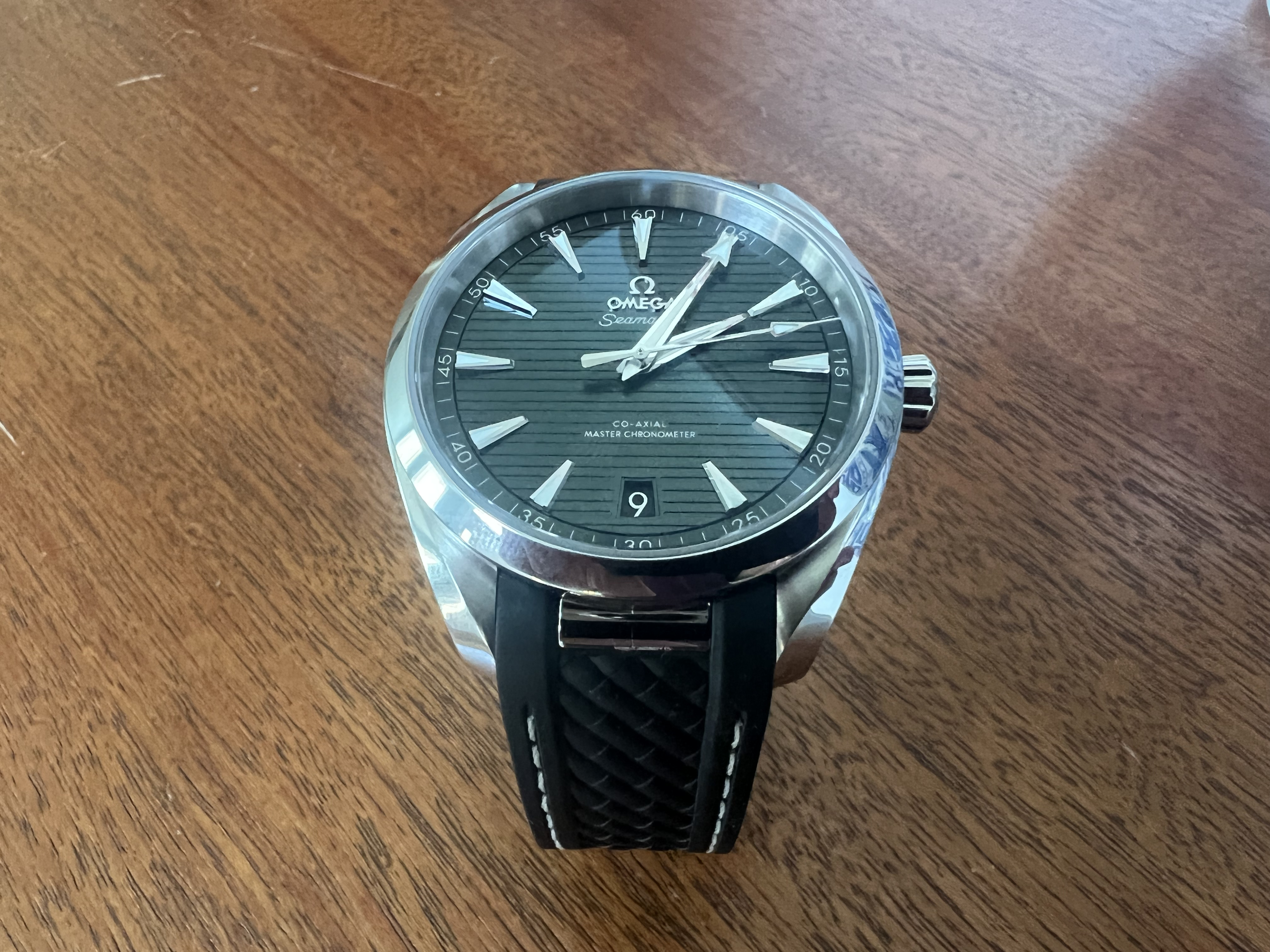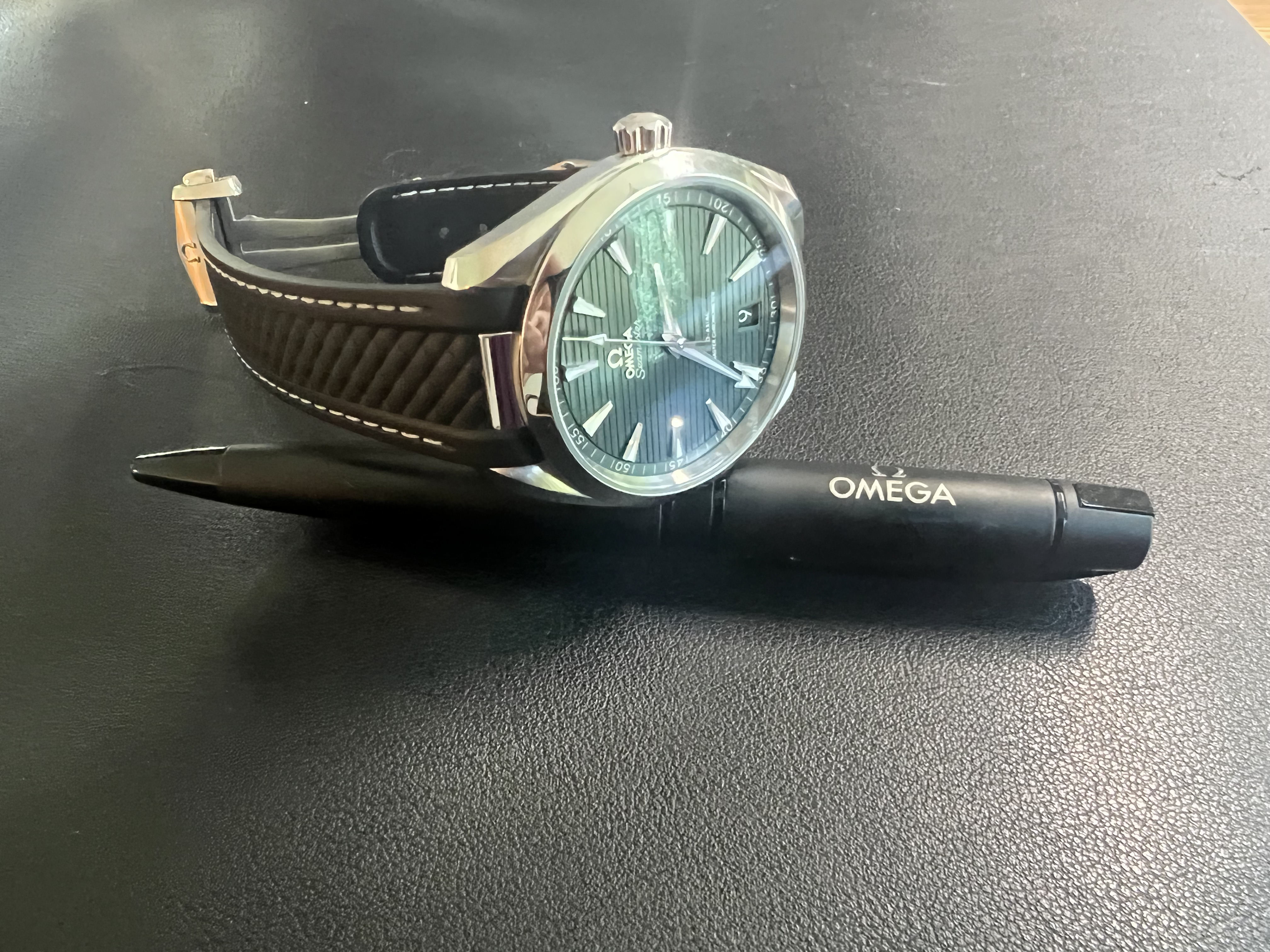 ·I have never really liked the bracelet on my AT and have decided to get the OEM rubber strap. I'm leaning towards the black version but I'm also considering the grey since in certain lighting conditions the dial will look grey. I've made a lame attempt at making some pictures that are attached. I took the originals from the Omega site.
