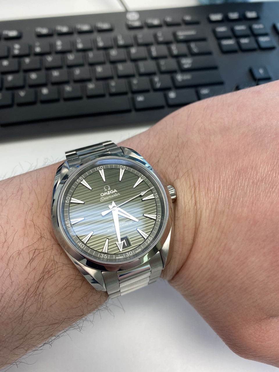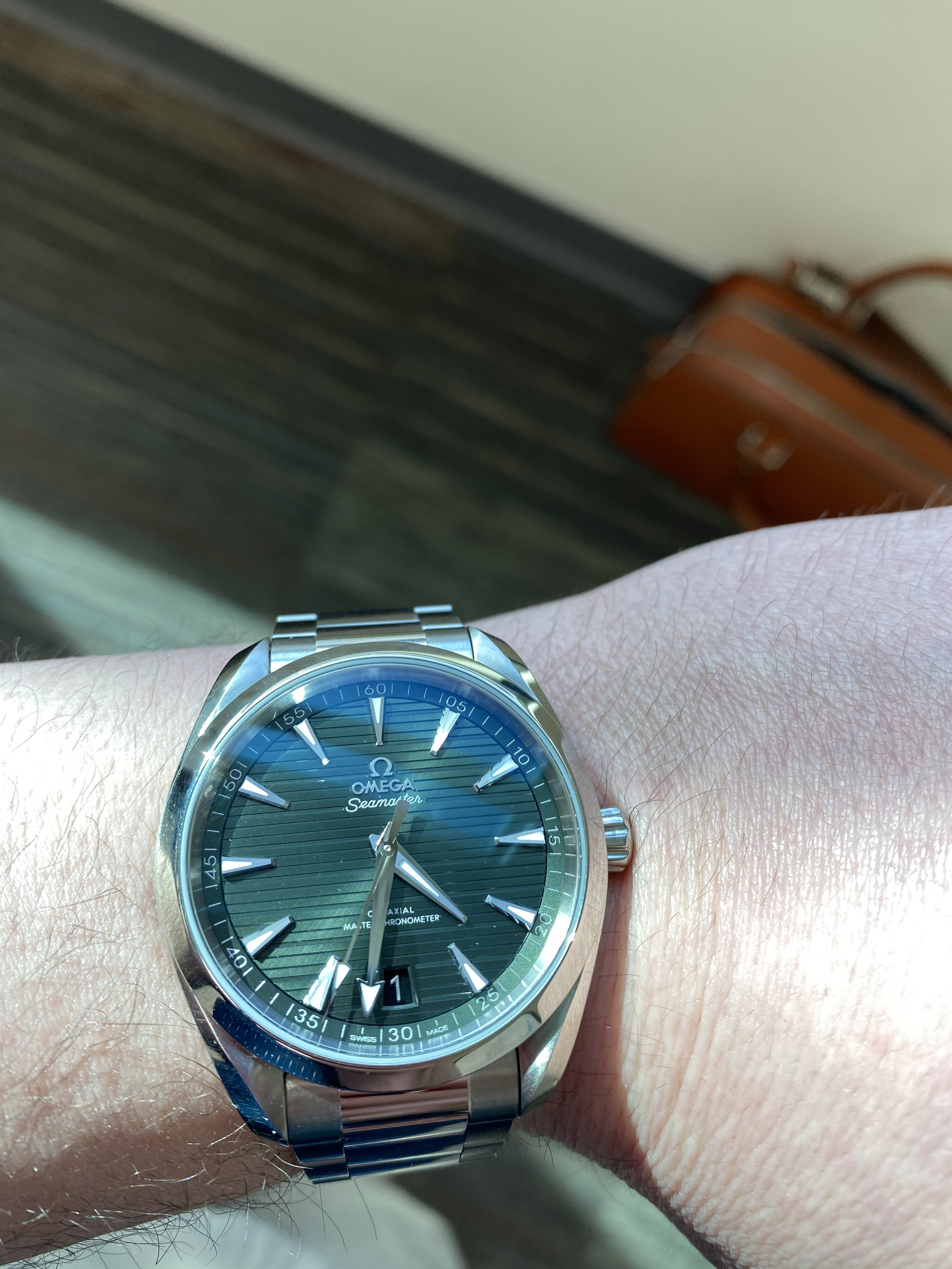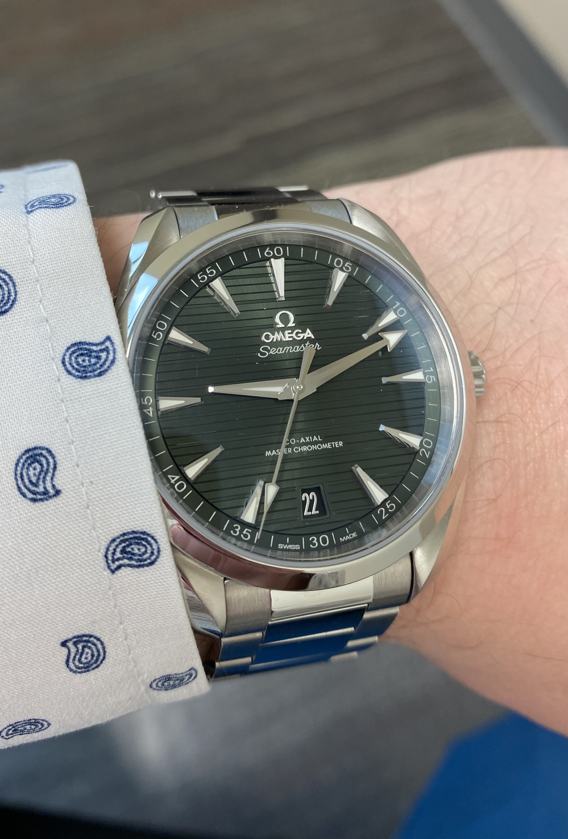 With the above out of the way, I had a plethora of options out there. I've had my eye on the Aqua Terra for years; however, the pre 2018 version lacked ideal case symmetry for me with the 'crown guards' protruding from the crown-side of the case which destroyed the case design for me. Insert the current version we now have - SYMMETRY!!! Oh...and my favourite colour is green...it's getting better... My concern prior to seeing the wrist in the metal was the green dial and the watch's ability to fit comfortably under a dress cuff. I'm happy to report that, in my opinion, both were outstanding. Now, let's dive deeper on some of the aspects of the watch.
