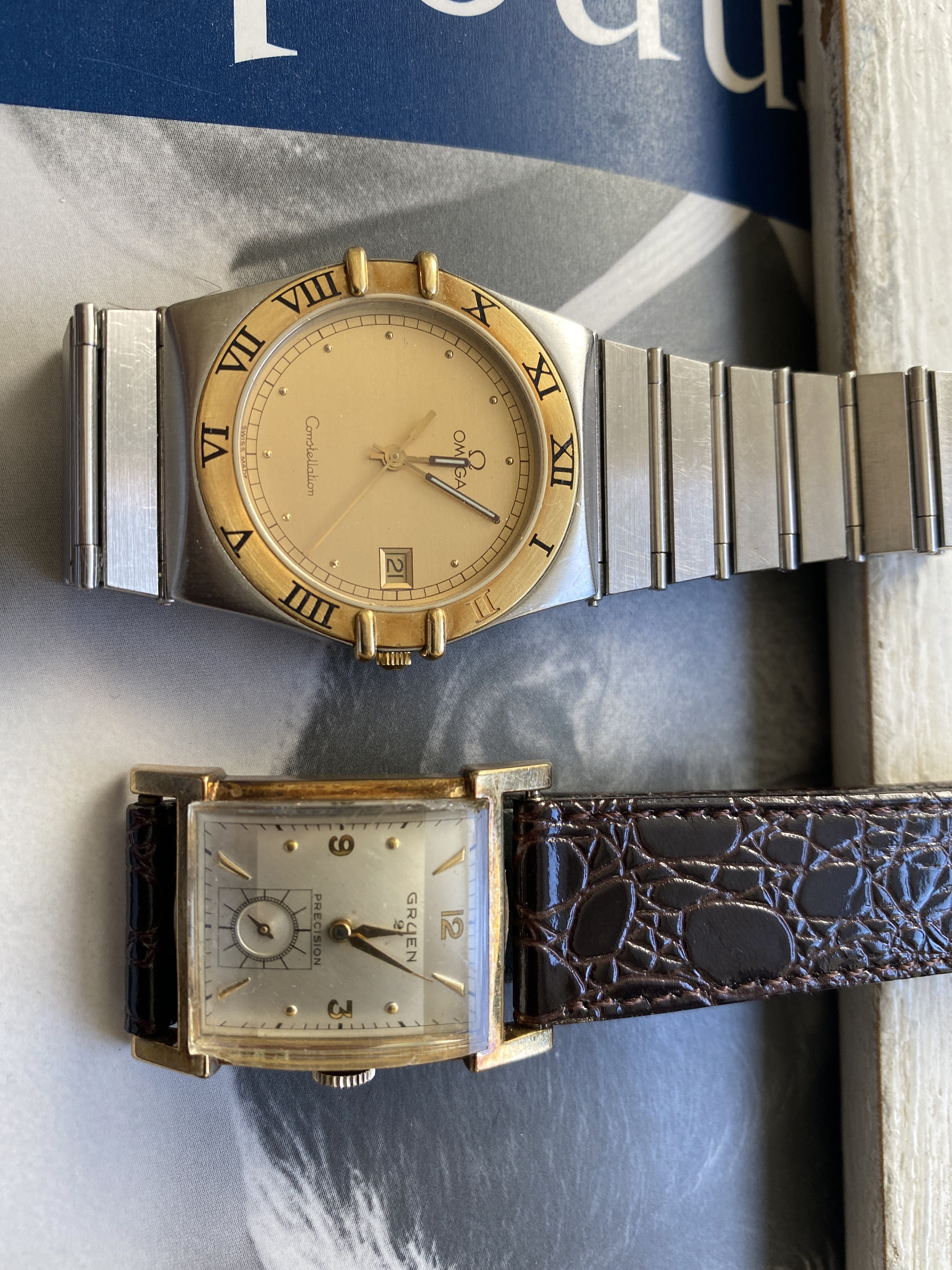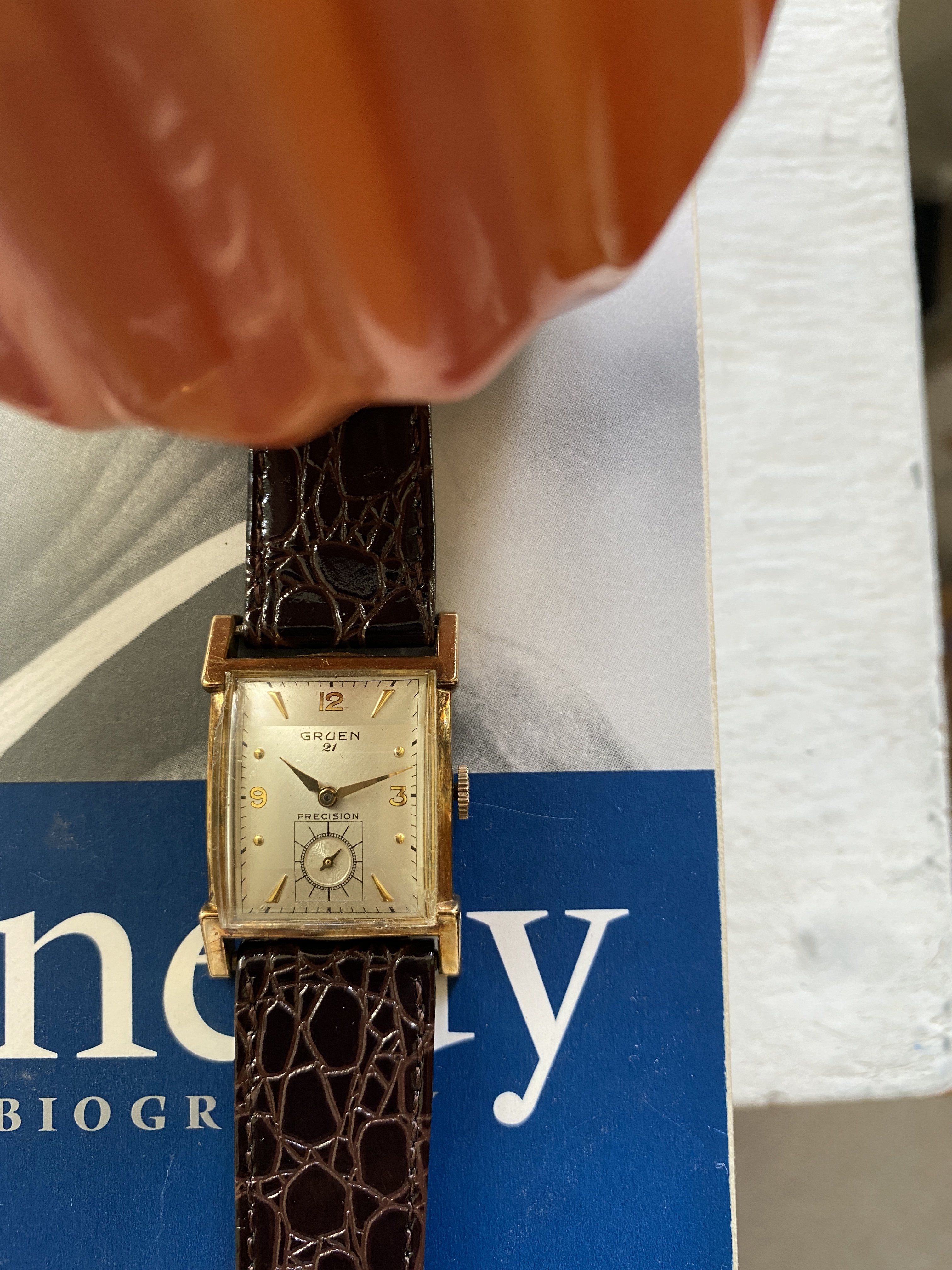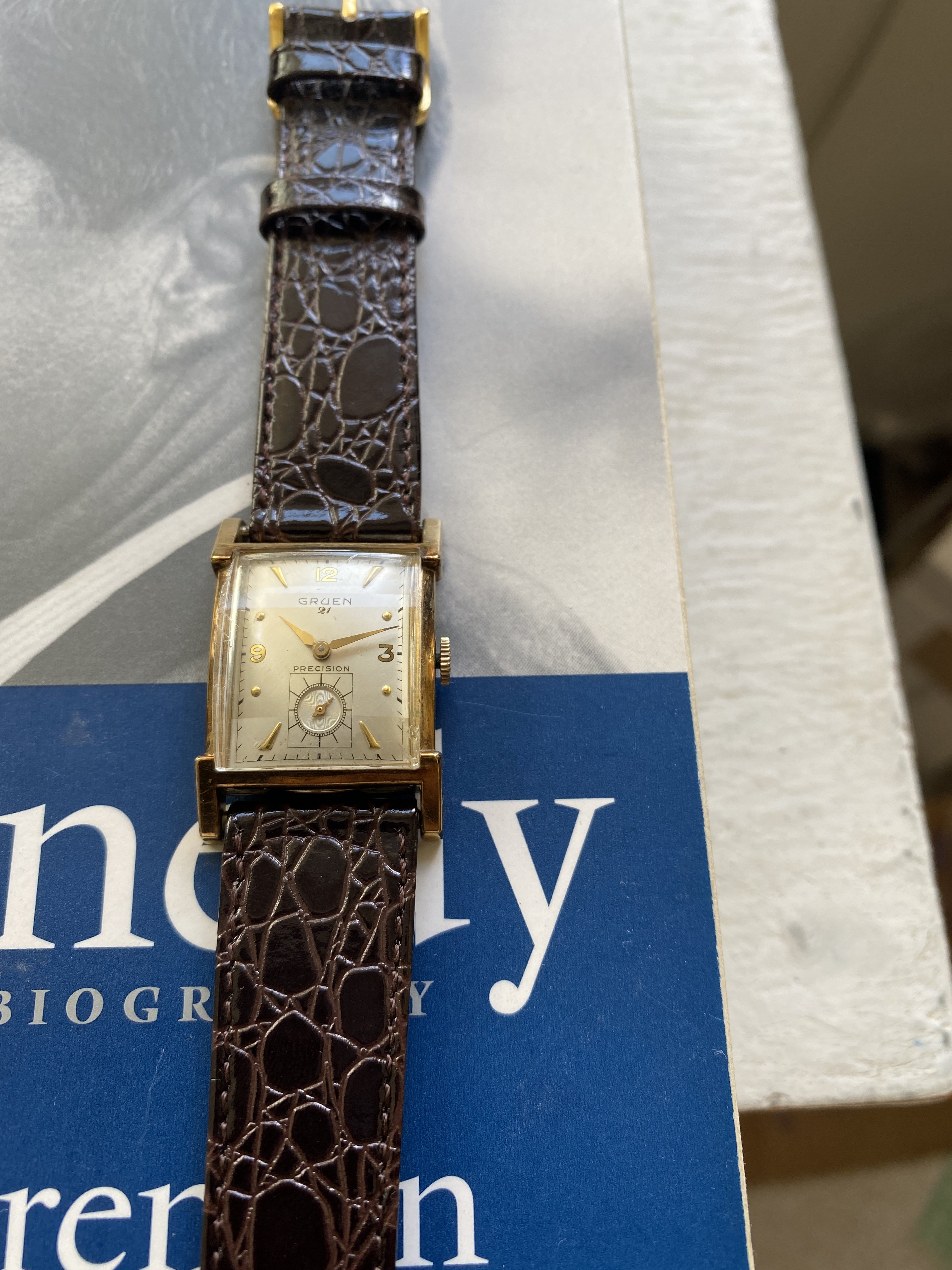 ·I have for sale a Gruen 21 precision. This is a classic Art Deco design. I haven't worn it as long as I have had it - about 20 years. However, looking at it gives me enormous joy. For a size comparison, I have a picture with a Constellation. The video gives the best sense of the dial and hands.