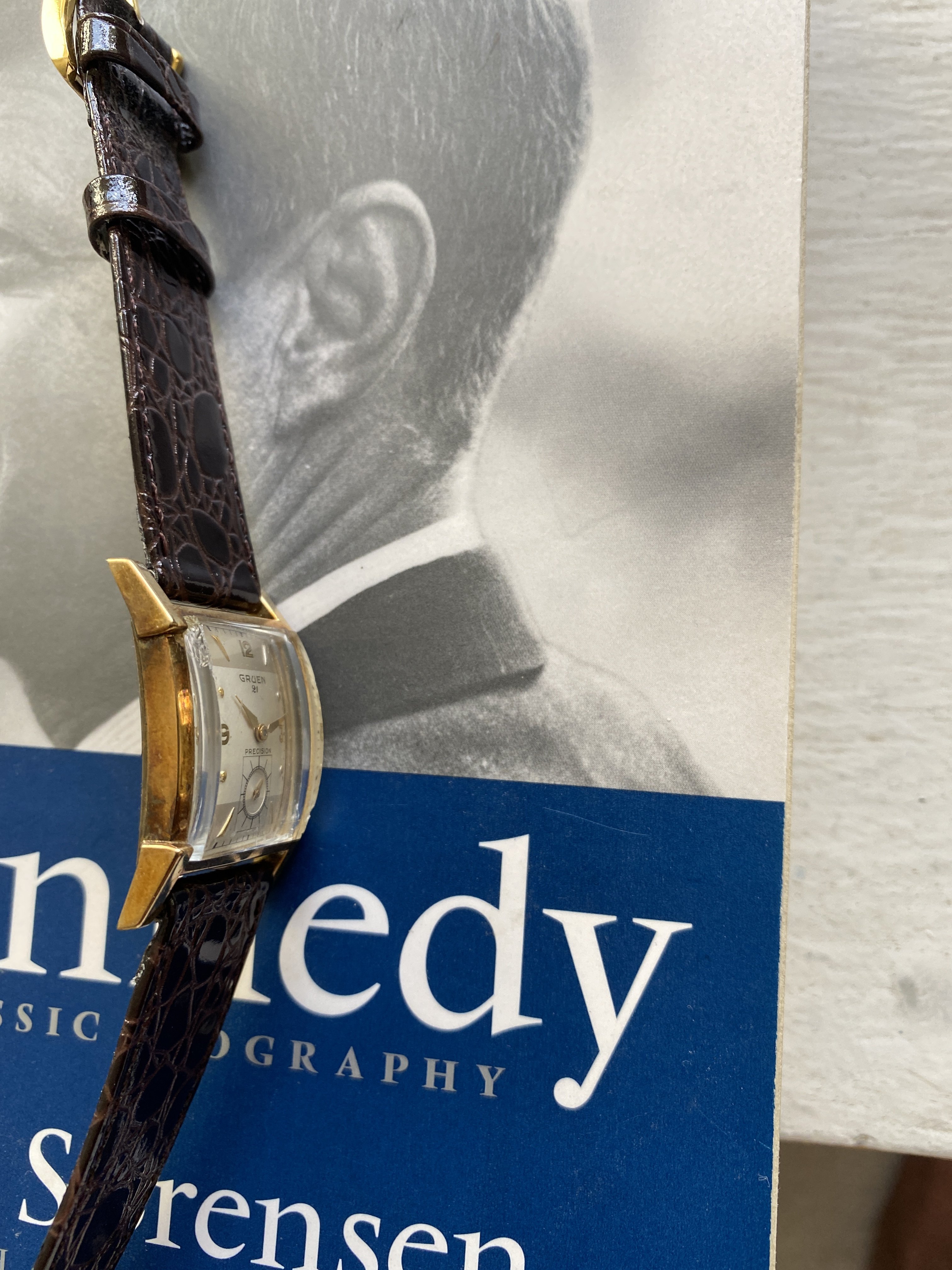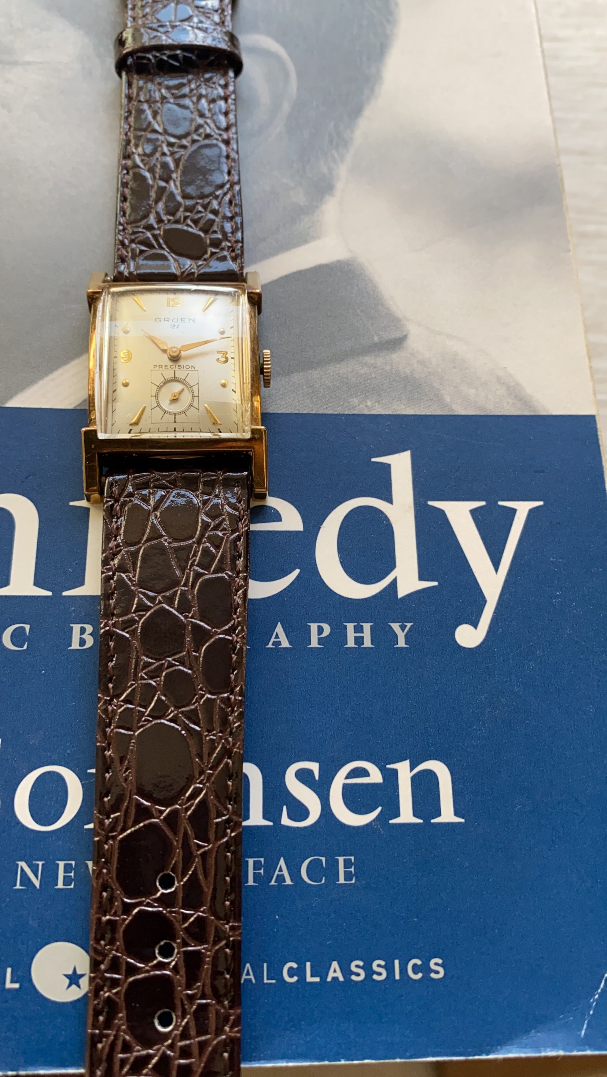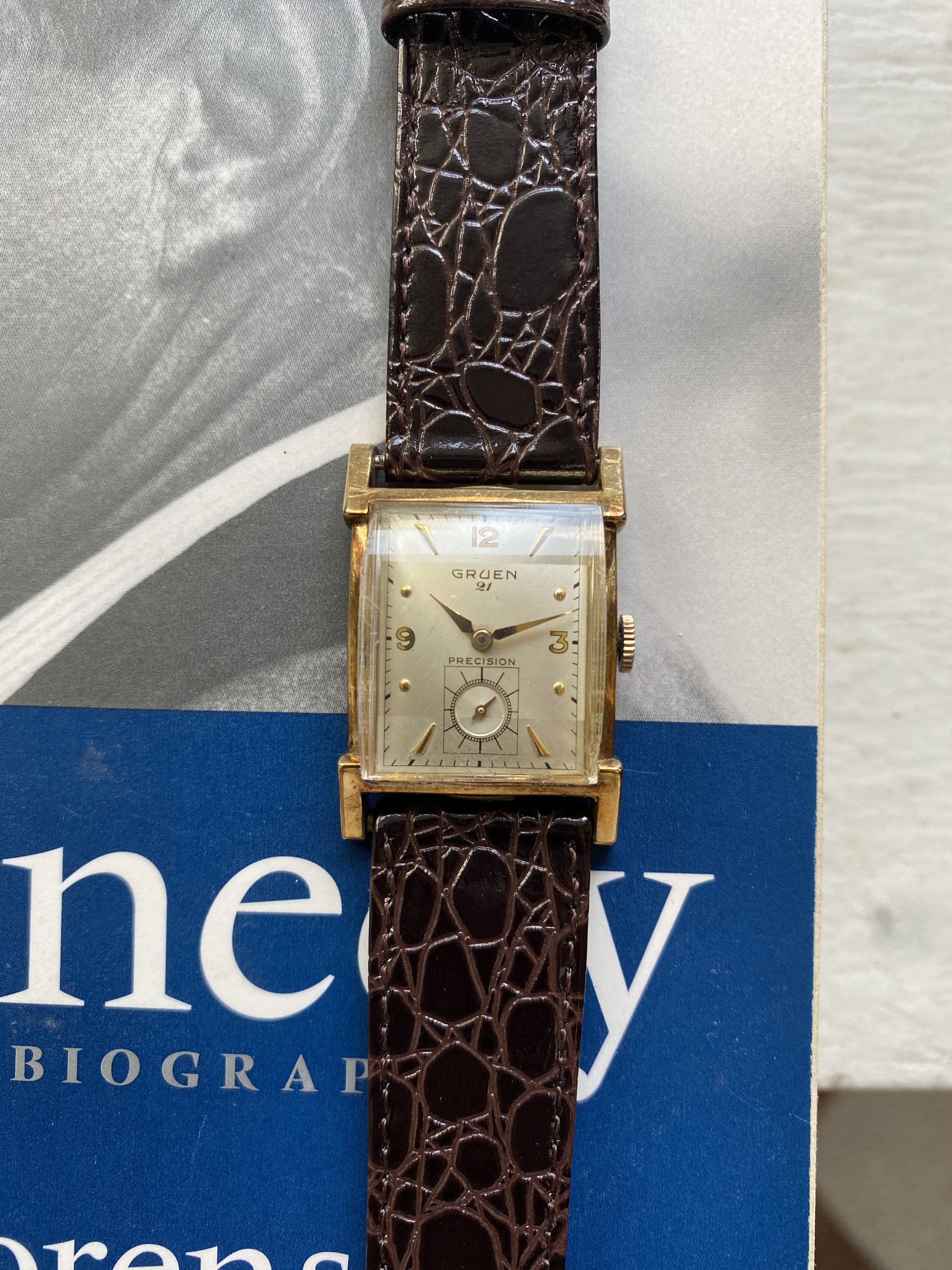 ·I have for sale a Gruen 21 precision. This is a classic Art Deco design. I haven't worn it as long as I have had it - about 20 years. However, looking at it gives me enormous joy. For a size comparison, I have a picture with a Constellation. The video gives the best sense of the dial and hands.
