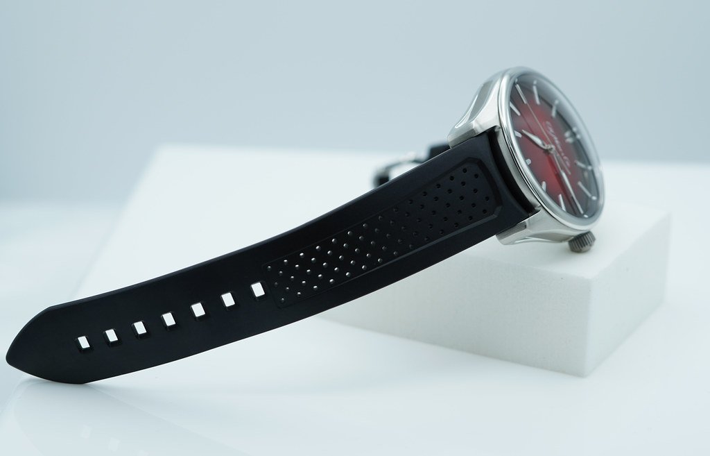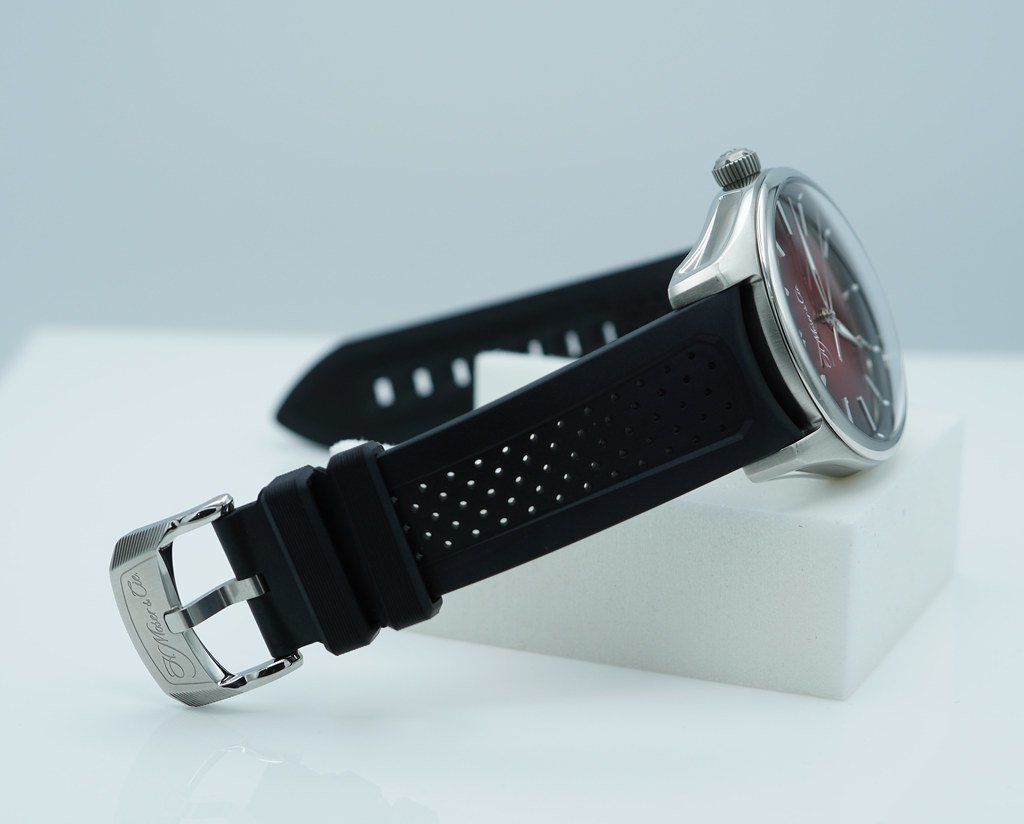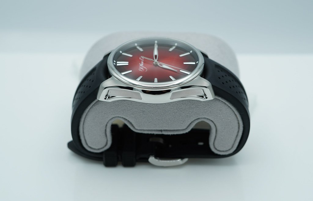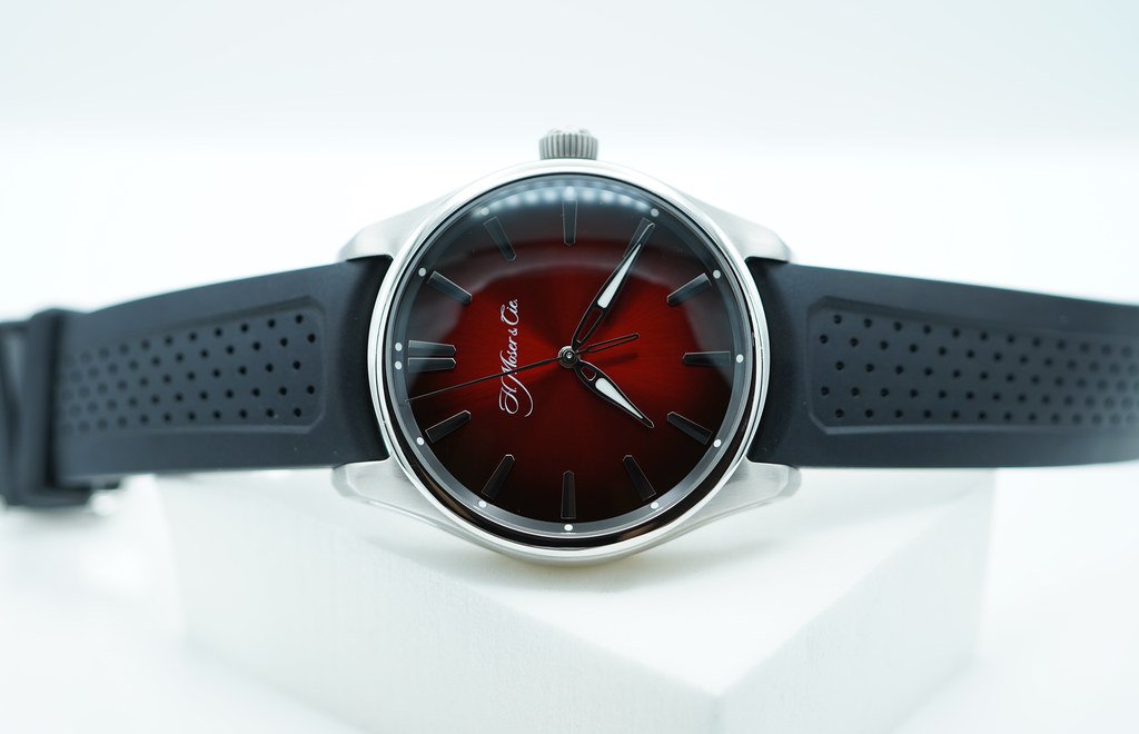 An Excellent, Unpolished & Very Beautiful 2023 42.8mm H. Moser & Cie Pioneer Centre Seconds with Automatic Calibre HMC 200 Calibre. Stainless Steel Case with Curved Sapphire Crystal & Mad Red Fumé Dial, on Black Rubber Strap with Steel Pin Buckle. Purchased from H. Moser & Cie USA Authorized Dealer in 02.2023. Watch running perfect with Non Issues. Boxes & Papers. Under 2 Years Factory Warranty.