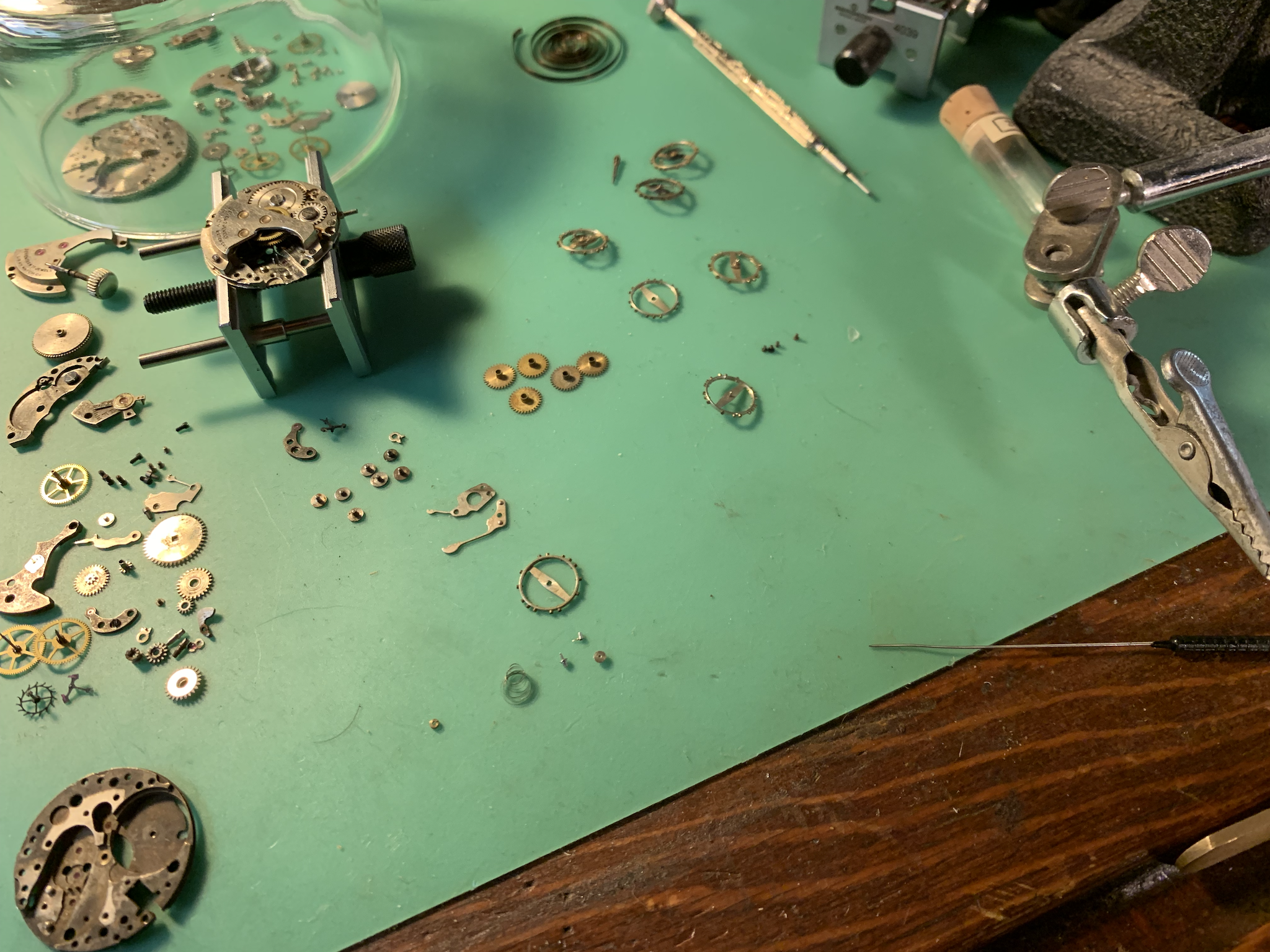 Which is actually how I got the snarl mostly straightened. I have plenty more balances to destroy. This can be seen in the photographs. There are nearly enough scrap parts for 4 or 5 watches. (Technically one was complete with a bad balance. which I took apart to match parts.) I also have 3 or for watches of this caliber that only need cleaning.