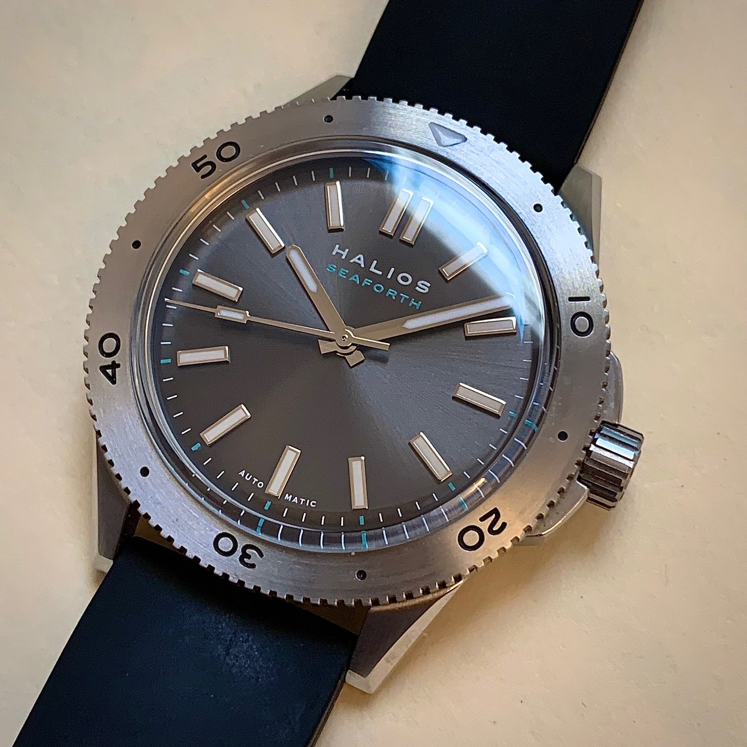 The photos don’t do justice to the grey sunburst dial combined with aqua-blue hour accents and text. I purchased this watch directly from Halios four or five years ago as a possible “beater-diver” but it’s so nice-looking that I never had the heart to put it in danger. I’d be surprised if I’d worn it more than a dozen times since I’ve owned it.