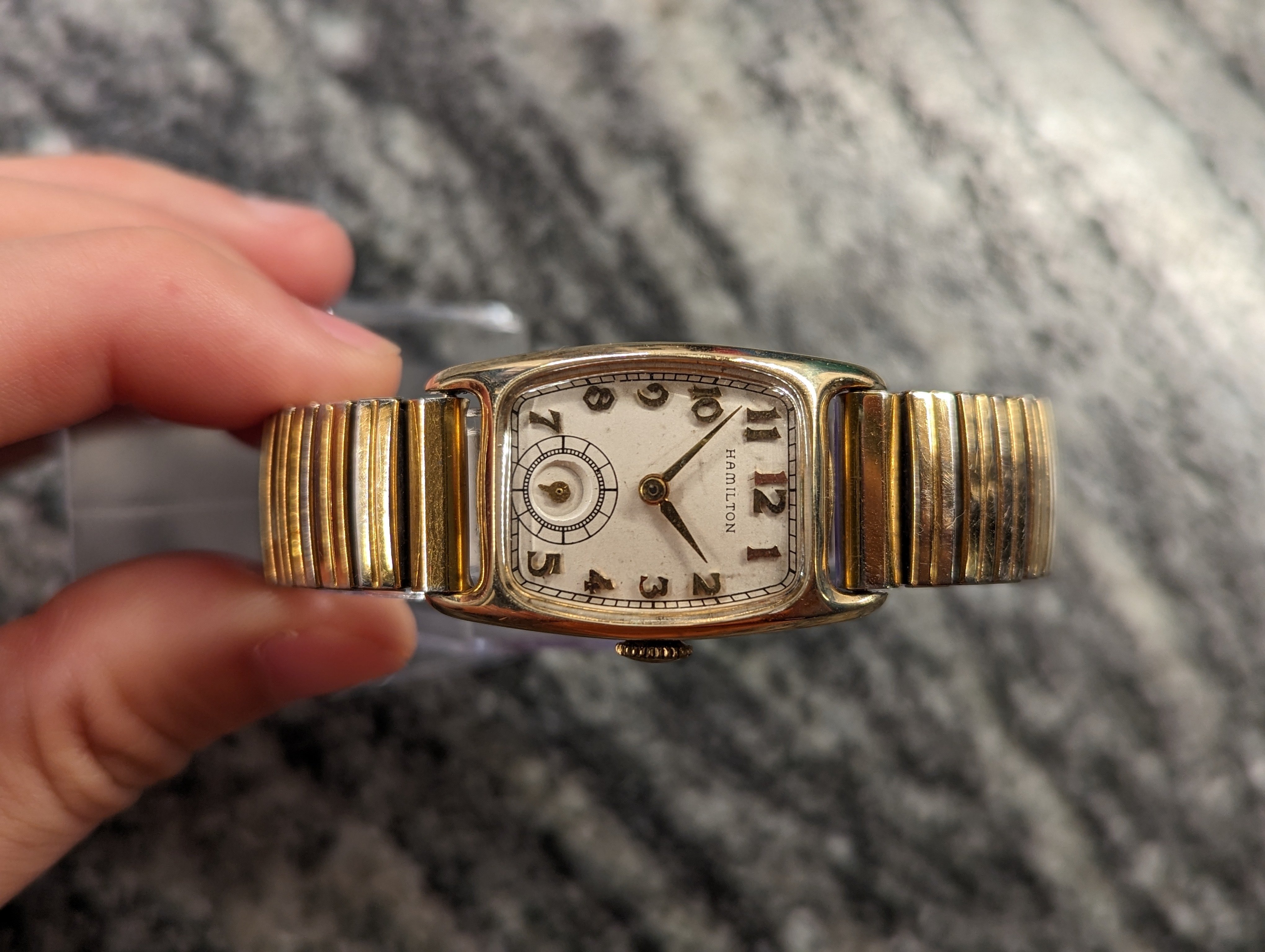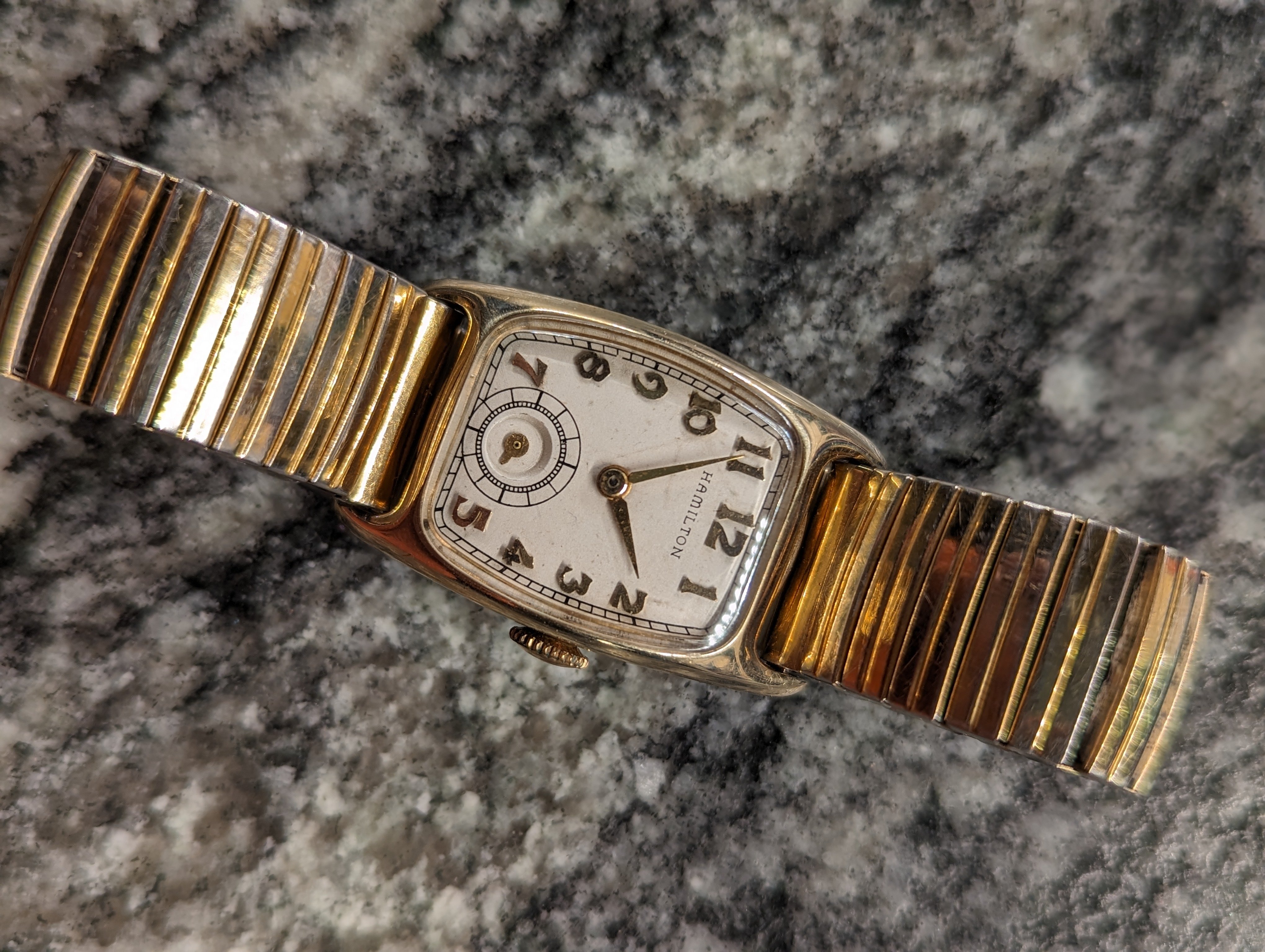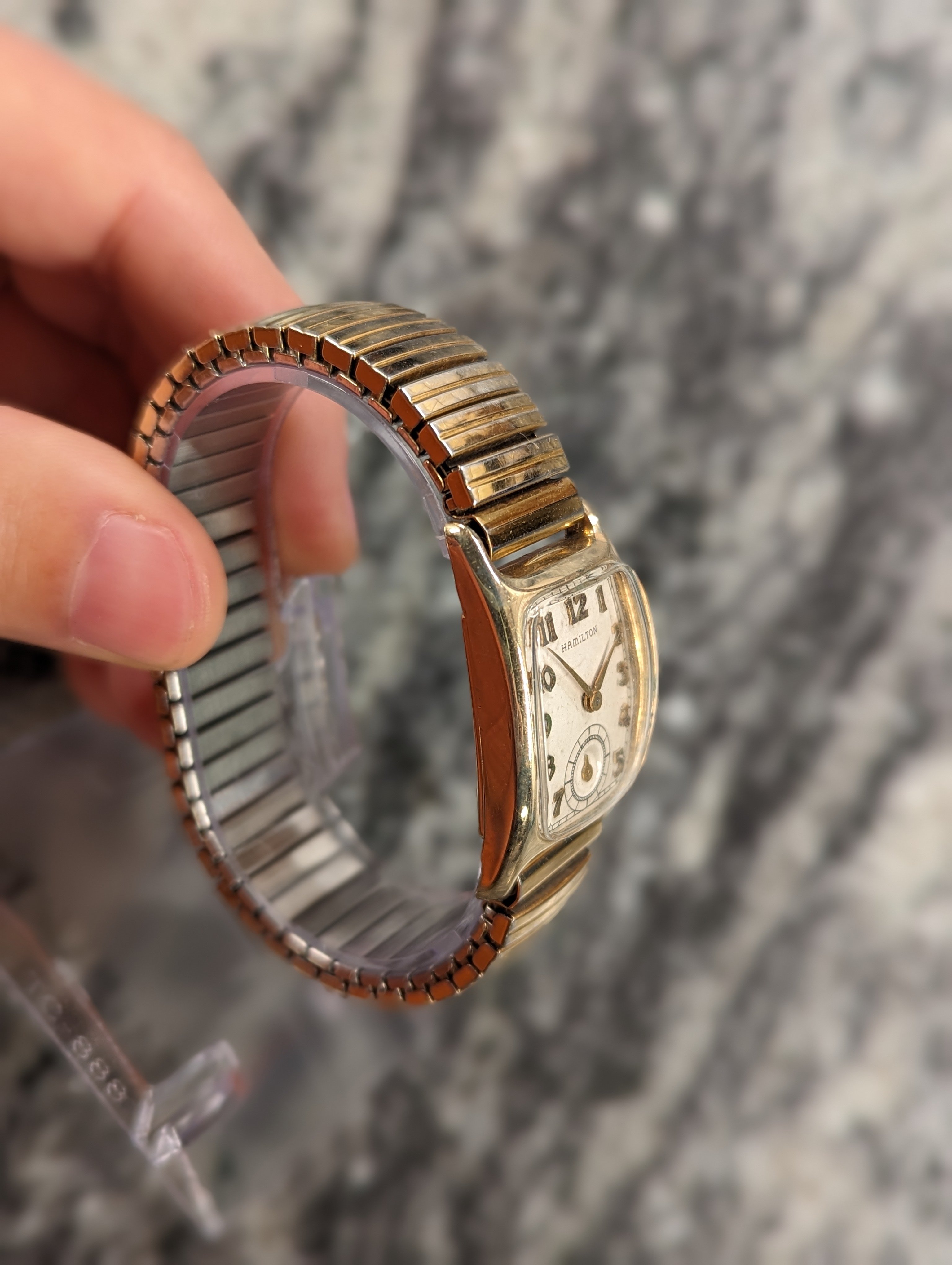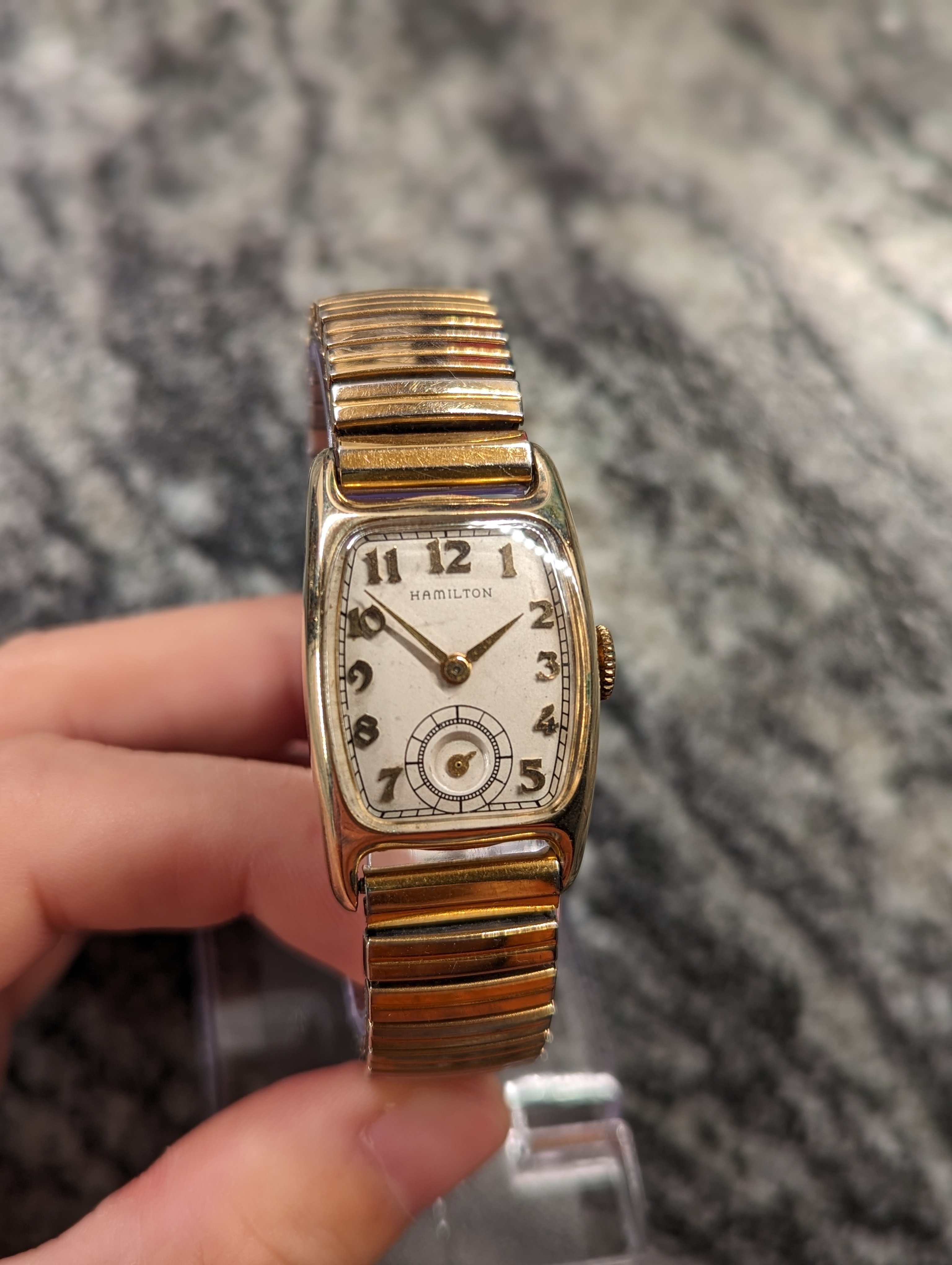 ·Here we have a 1940's Hamilton Boulton. This is an original, classic watch, that's still made today. Although we all know Hamilton isn't the same great company it used to be. Wouldn't you much rather have the original, American made version, for a super reasonable price? The watch is gold filled, manual wind, 16mm lug width, very minor brassing (but less than most). I tried to match an age appropriate band. It keeps great time, as the seller I bought it from said it was serviced. I purchased it about 6 months ago. Crystal is plastic, so I'm not sure if it's original to the watch, but it was definitely made for the Boulton. I'm asking $125. If you know the watch, you know it's a reasonable price. Thanks for looking.