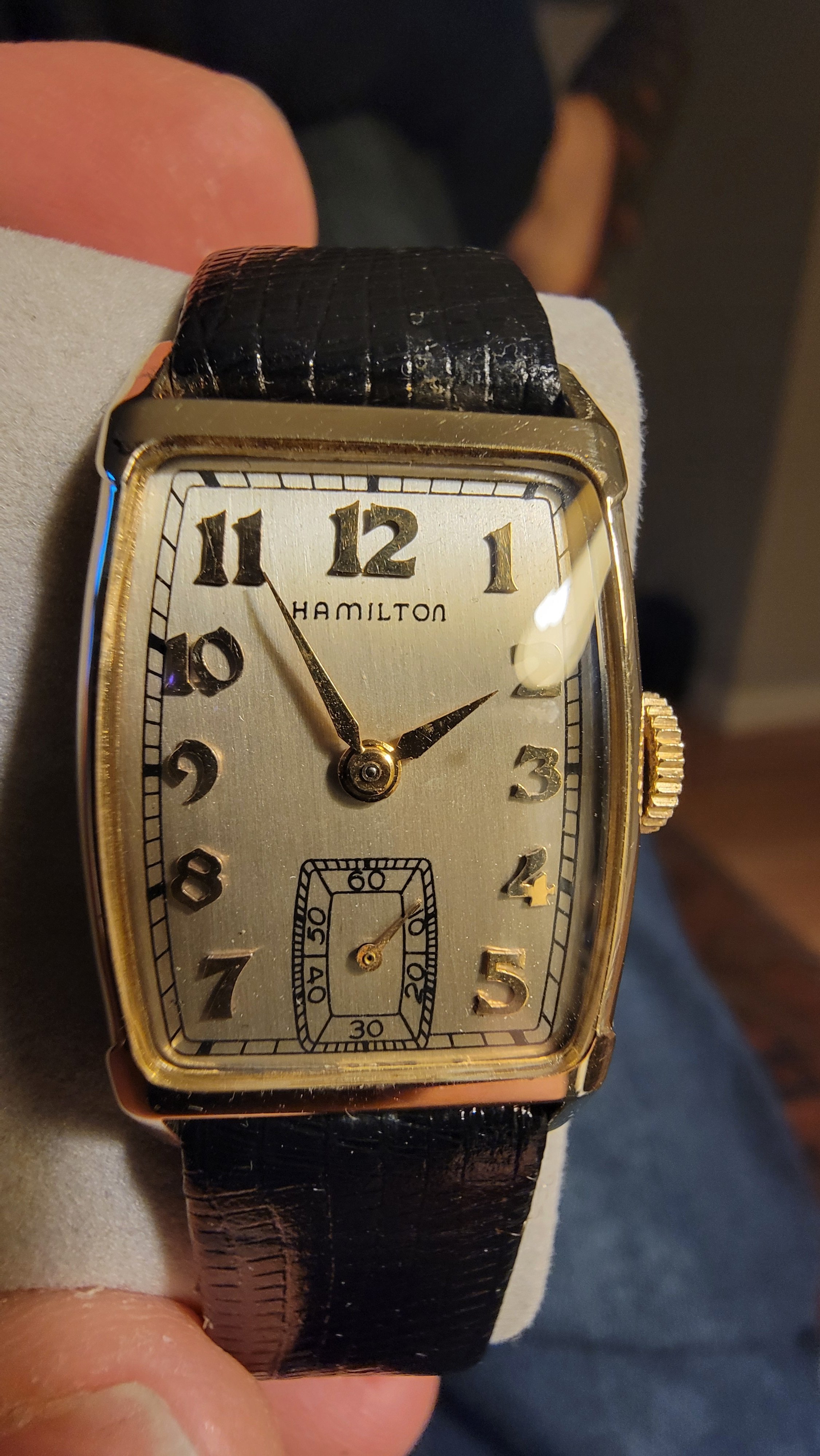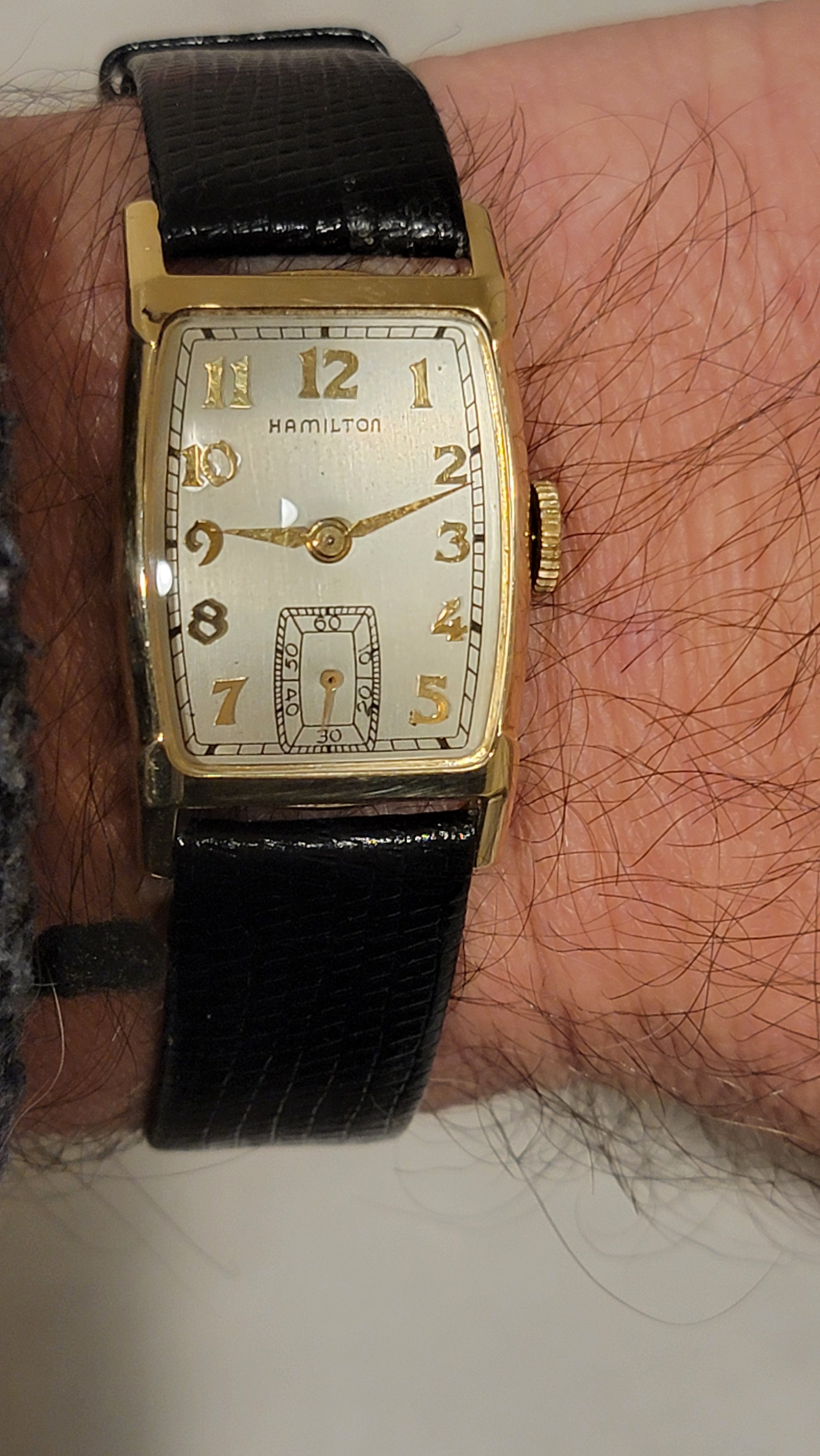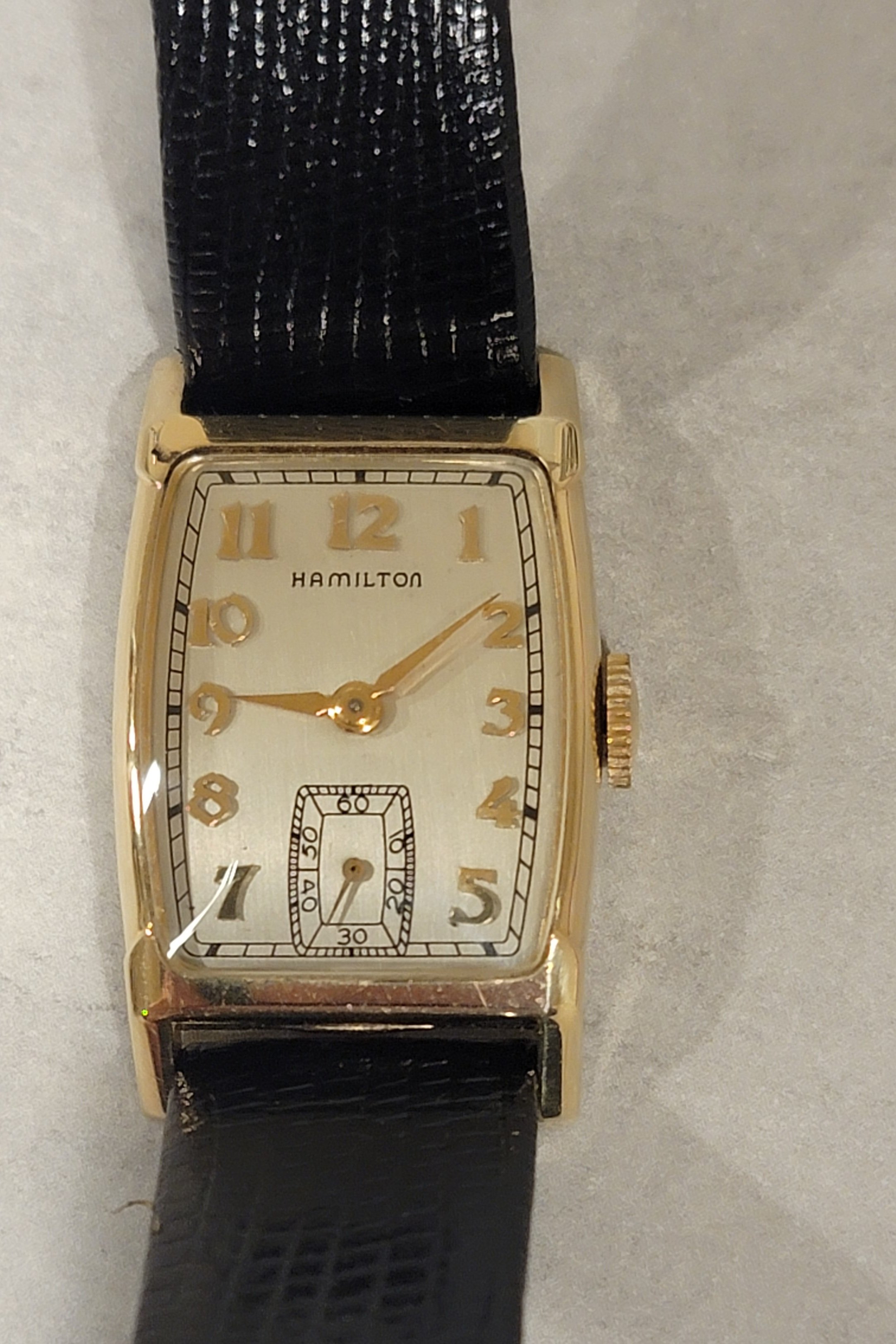 I don't know if the dial is original or not. It is without scratches or marks and has some brushing in the silver, which is attractive to my eye. Many Hamiltons have had their dials resurfaced or replaced over the years and it seems to be more acceptable in vintage Hamiltons. I don't know that it is not original, but one person said he heard from others that it had questions (didn't say what.) So in the interest of full disclosure, consider this.