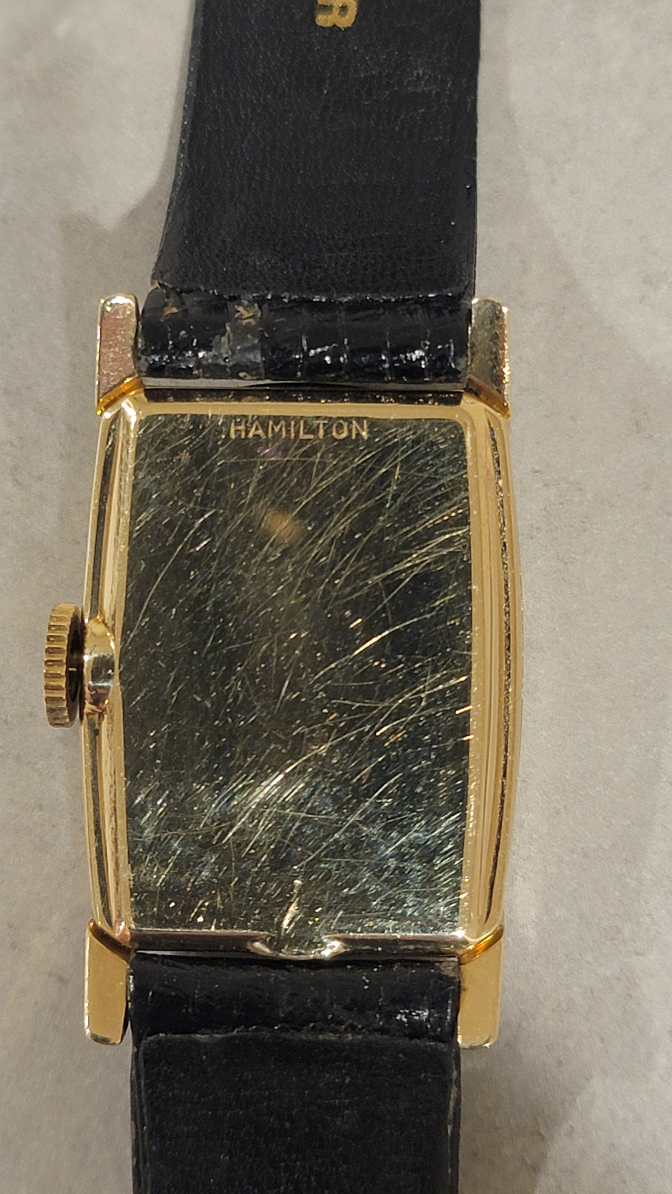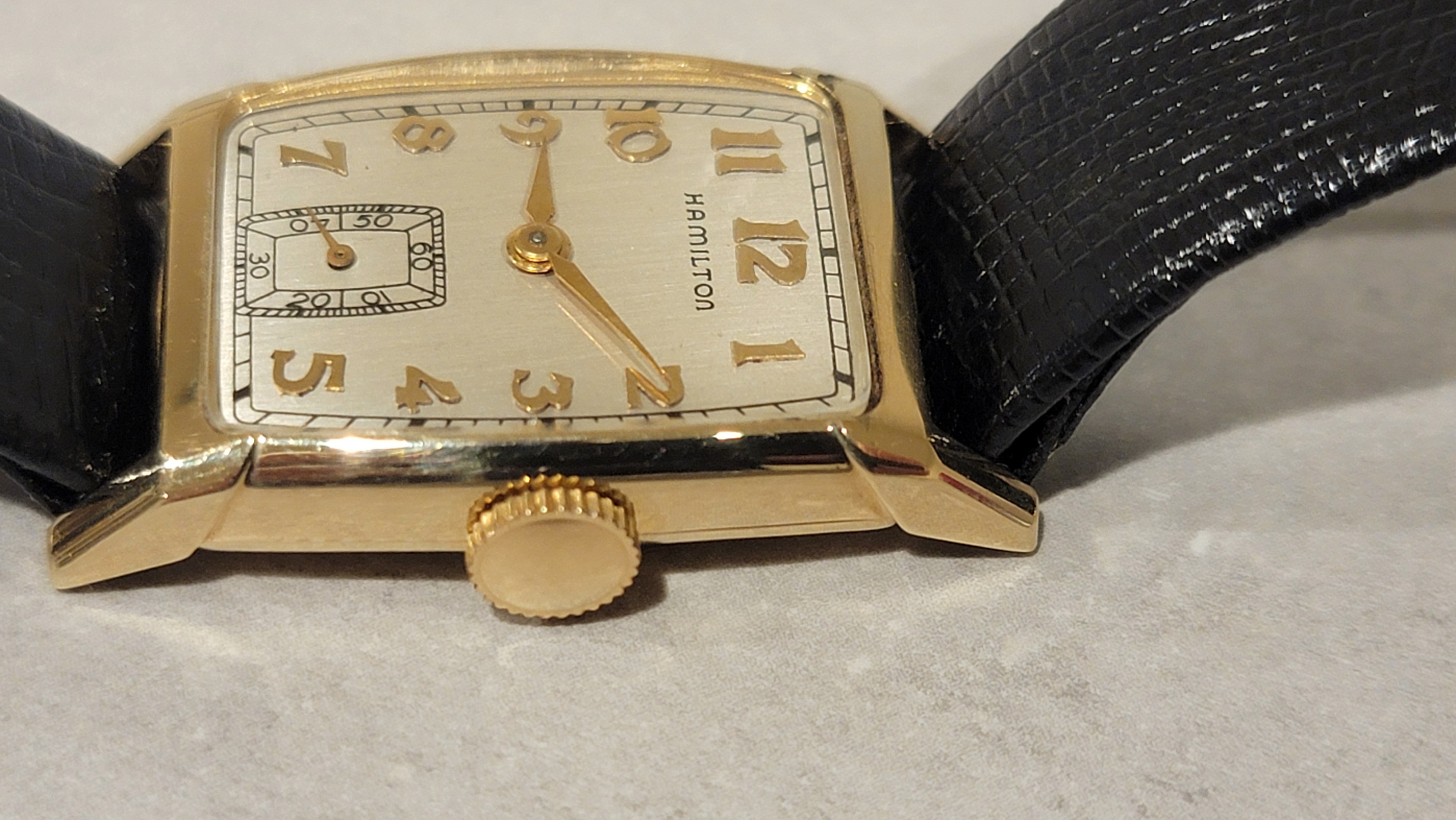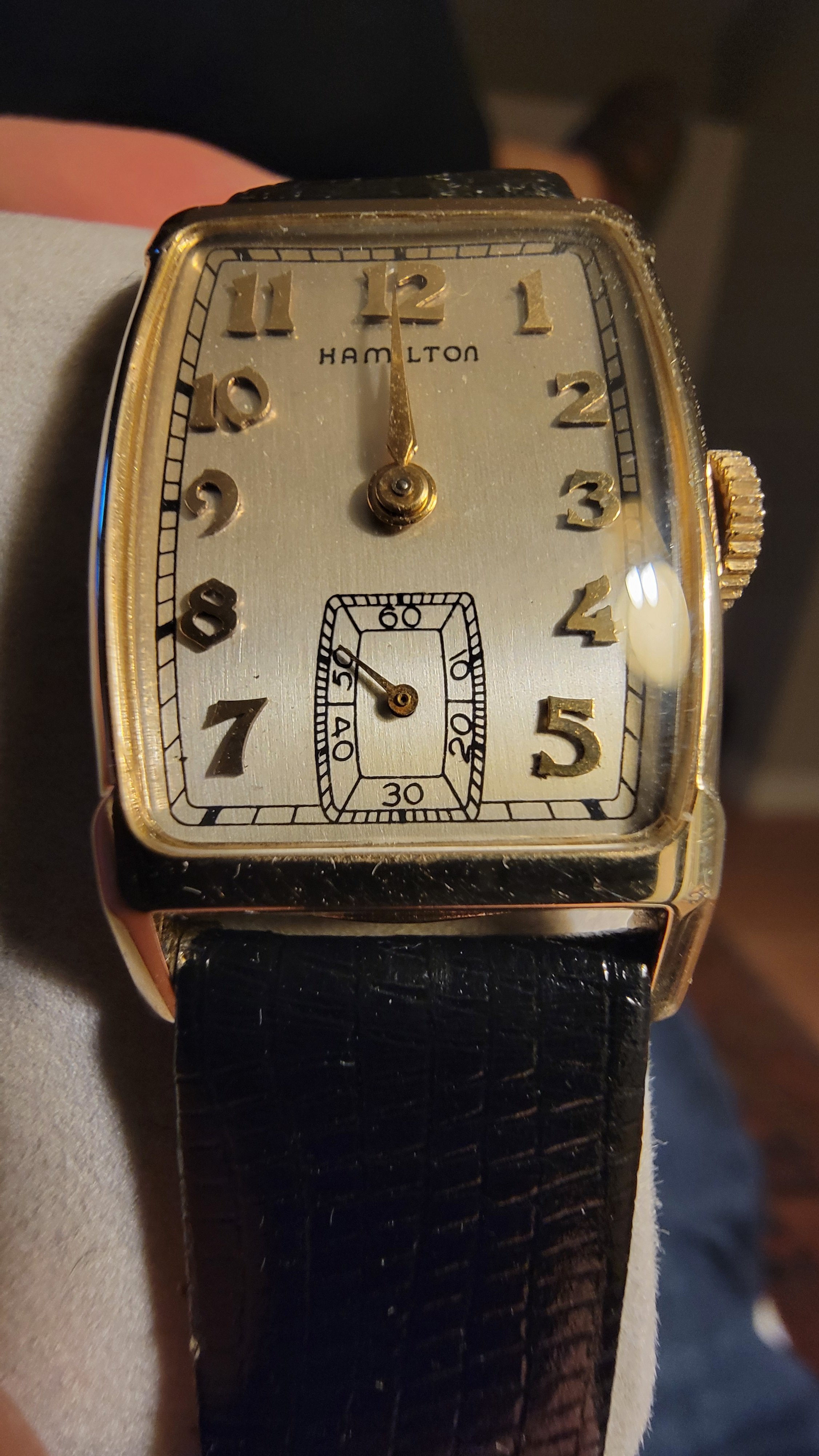 I don't know if the dial is original or not. It is without scratches or marks and has some brushing in the silver, which is attractive to my eye. Many Hamiltons have had their dials resurfaced or replaced over the years and it seems to be more acceptable in vintage Hamiltons. I don't know that it is not original, but one person said he heard from others that it had questions (didn't say what.) So in the interest of full disclosure, consider this.