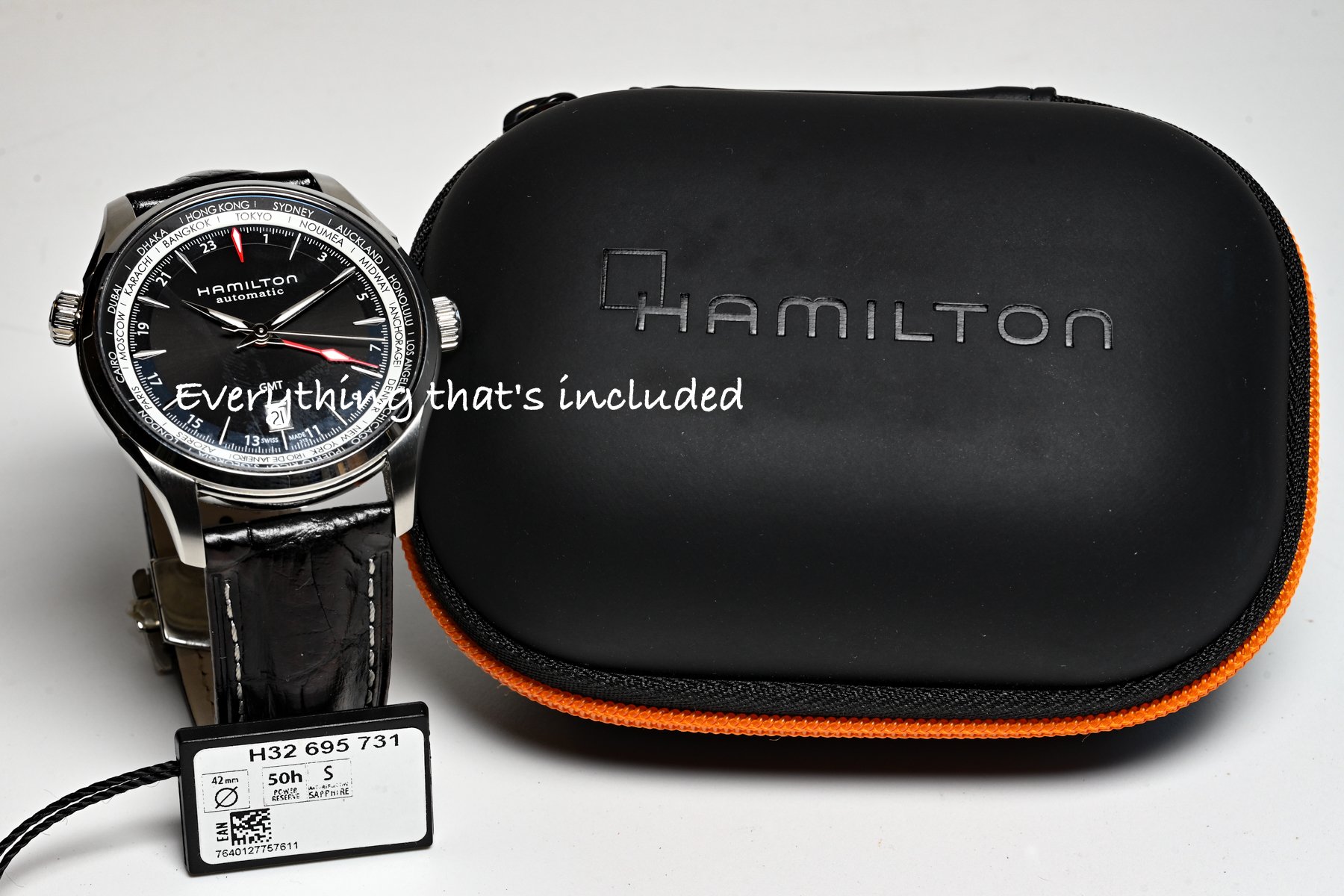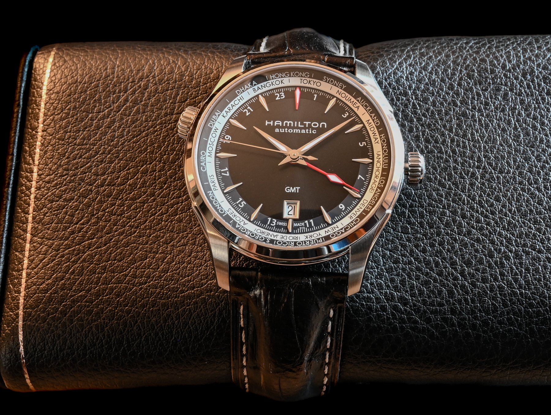 ·This Hamilton Jazzmaster GMT WORLD TIMER watch is a stylish timepiece for men.
