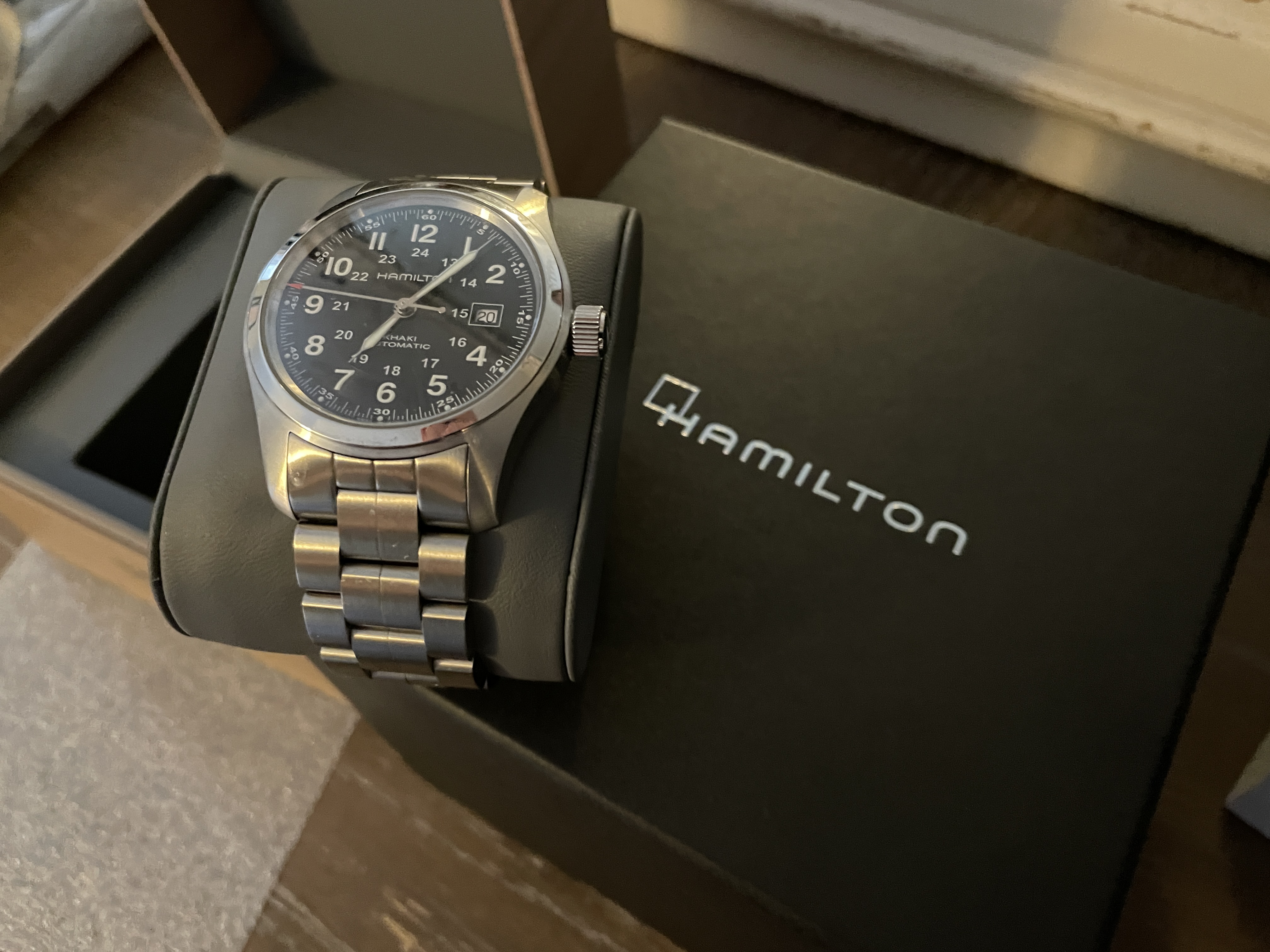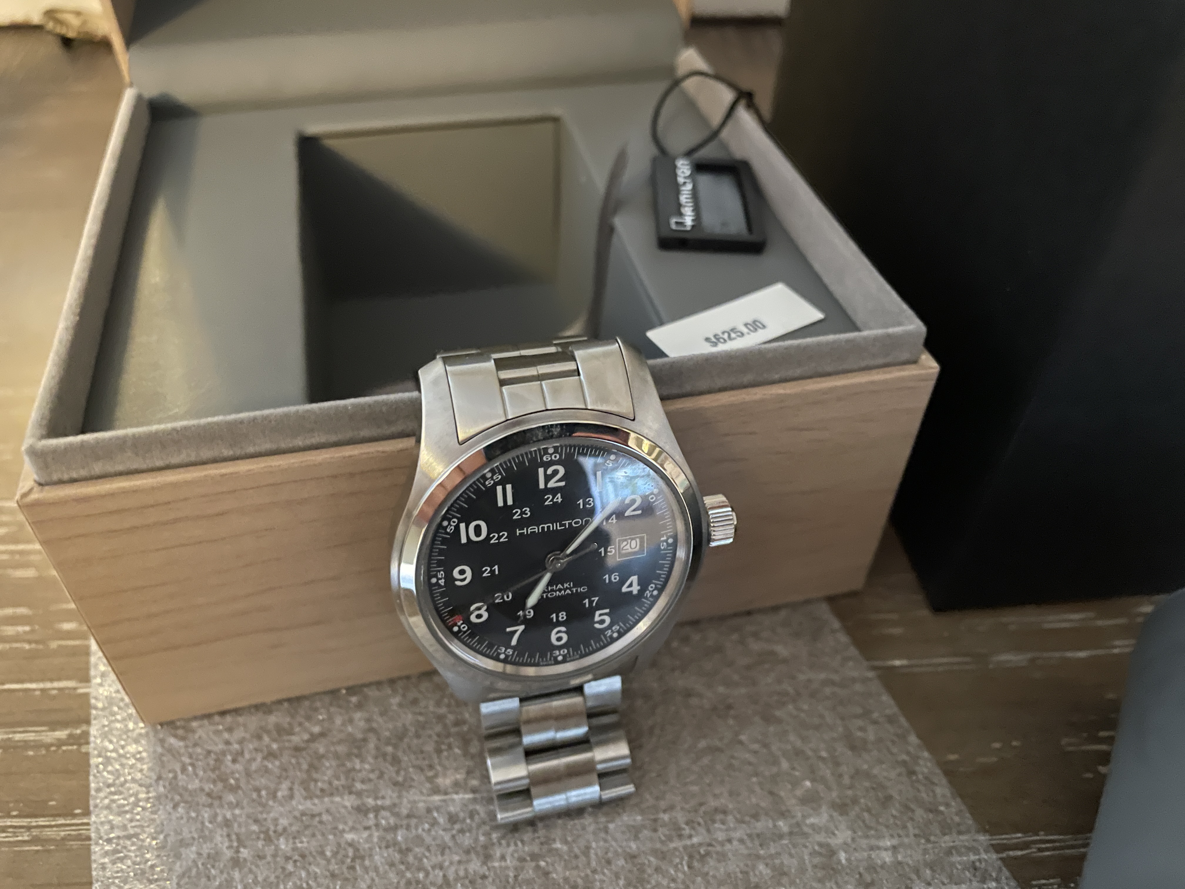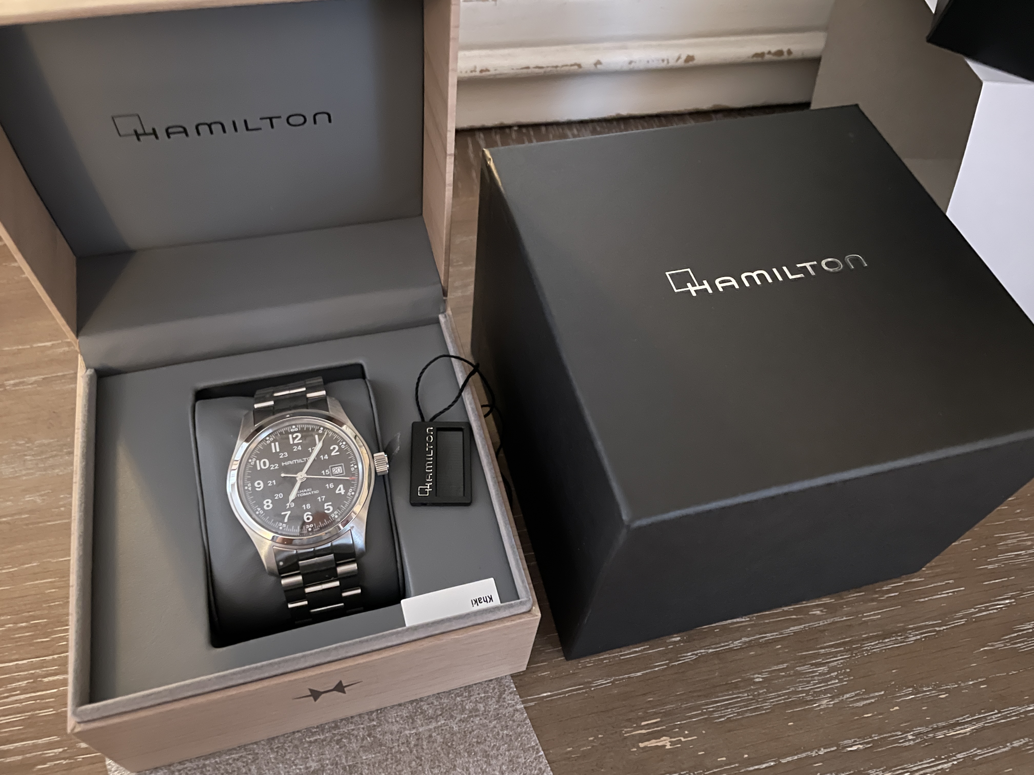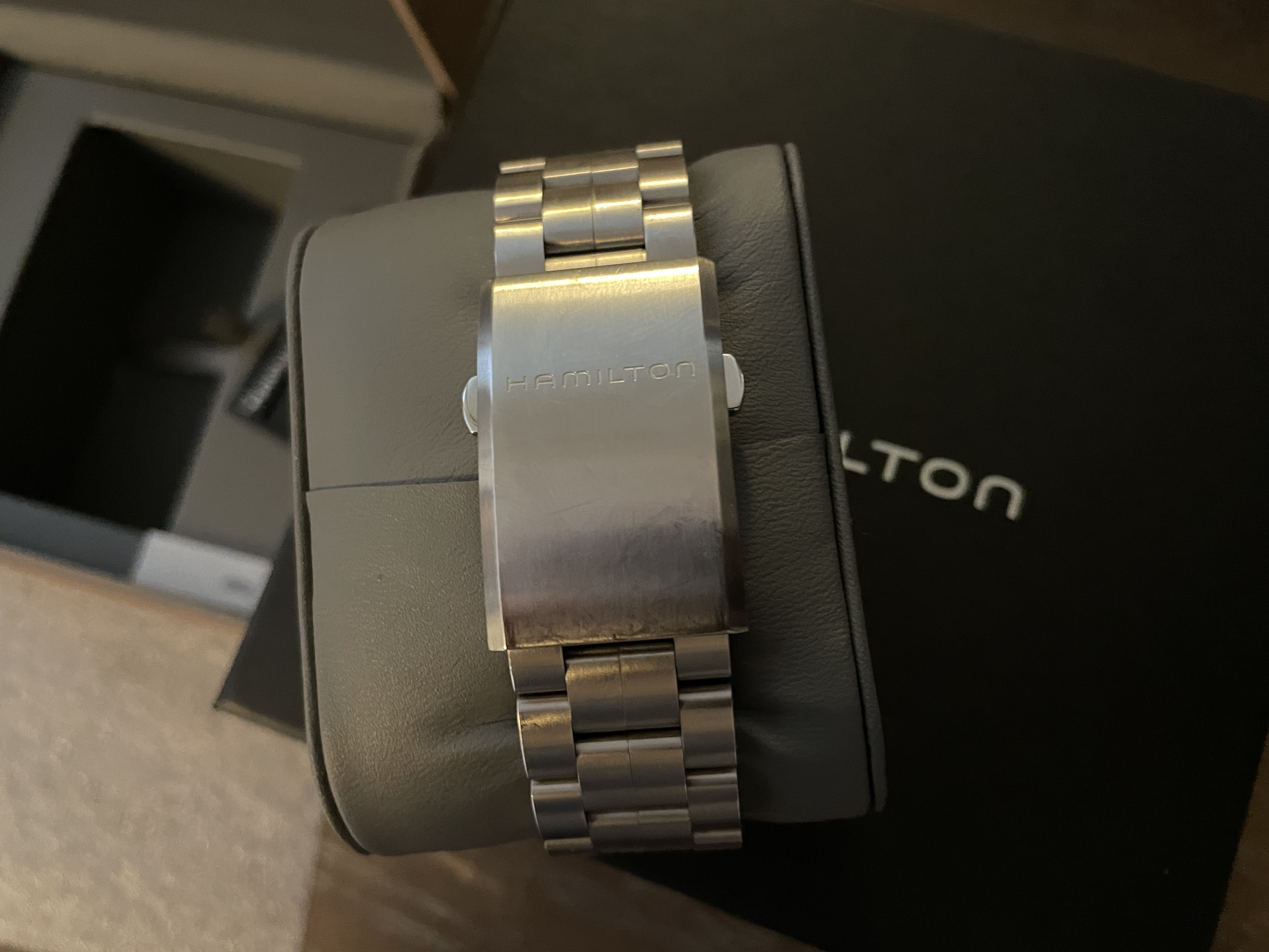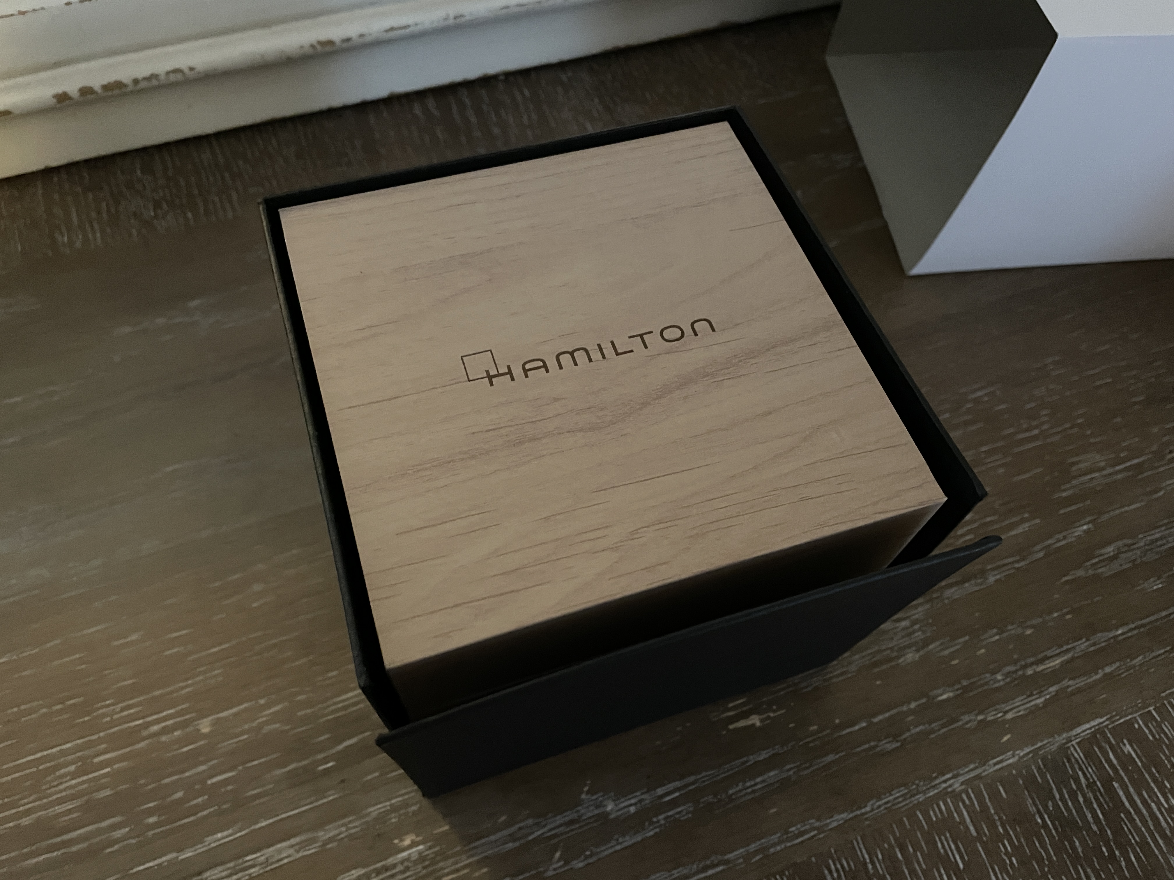 Comes with original OEM Hamilton "wood" box, Hamilton outer black box, Hamilton tags, stickers, price tag, and receipt of purchase.