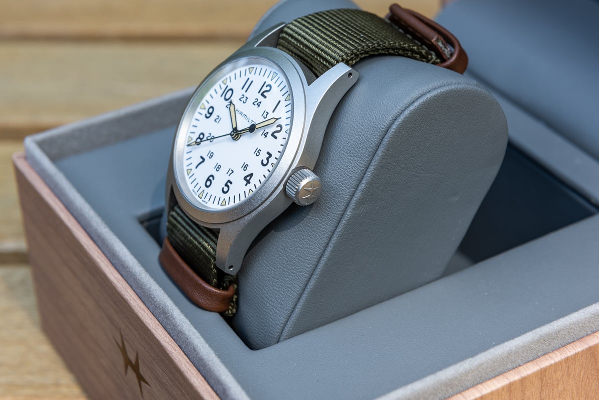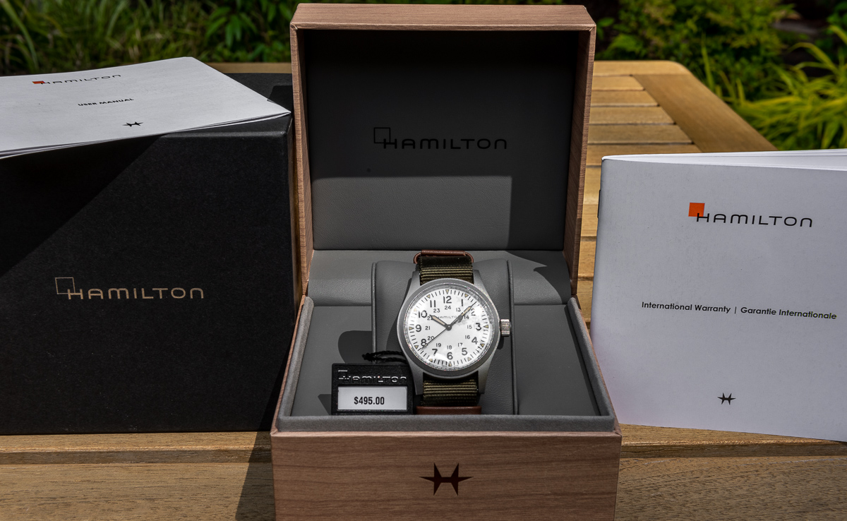 It comes with inner and outer boxes, manual, International warranty booklet, Hamilton hang tag