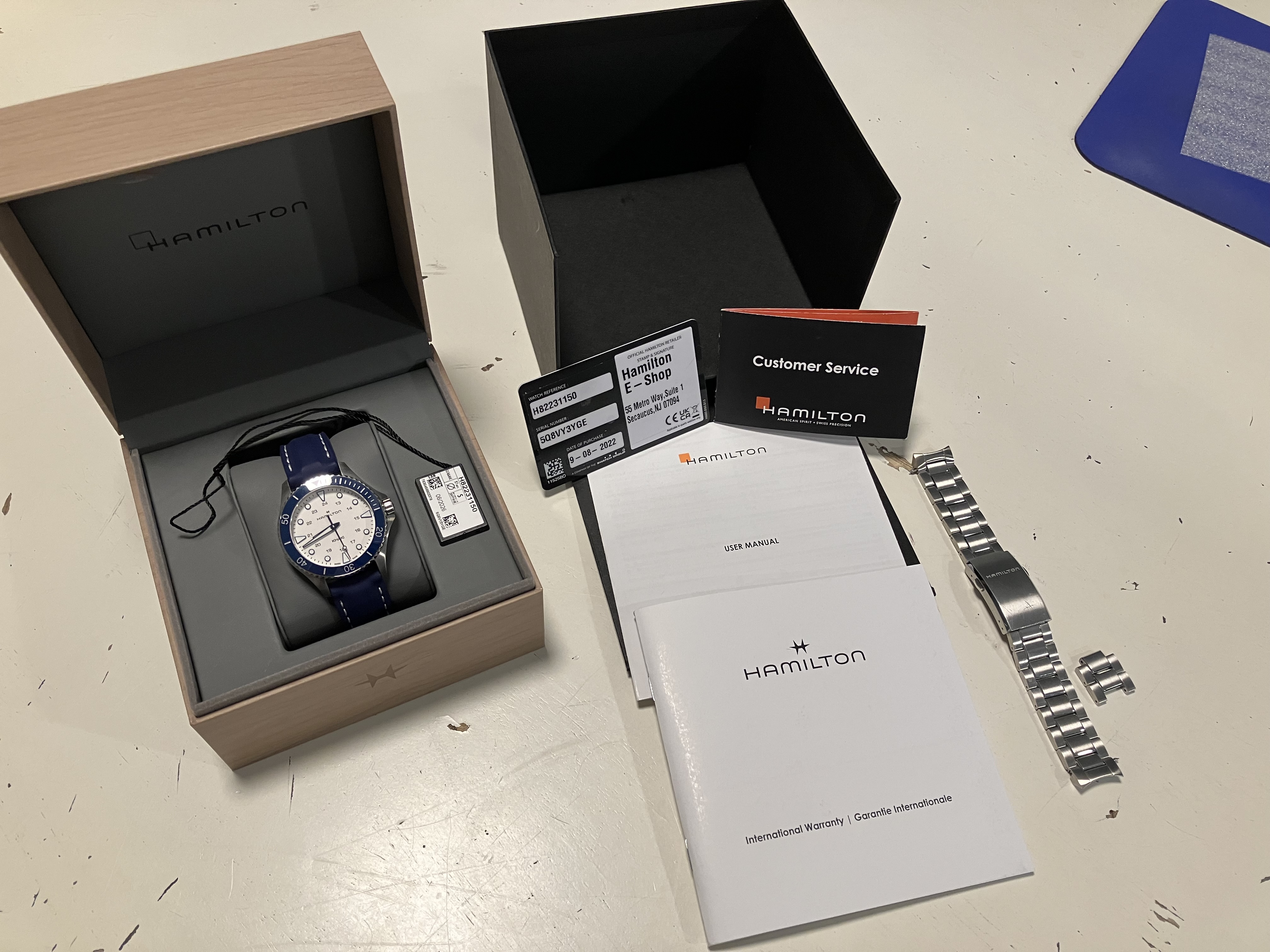 The watch works perfectly, shouldn't need a battery-change for a very long time, and includes everything it came with--all inner and outer packaging, warranty card, manuals, etc.