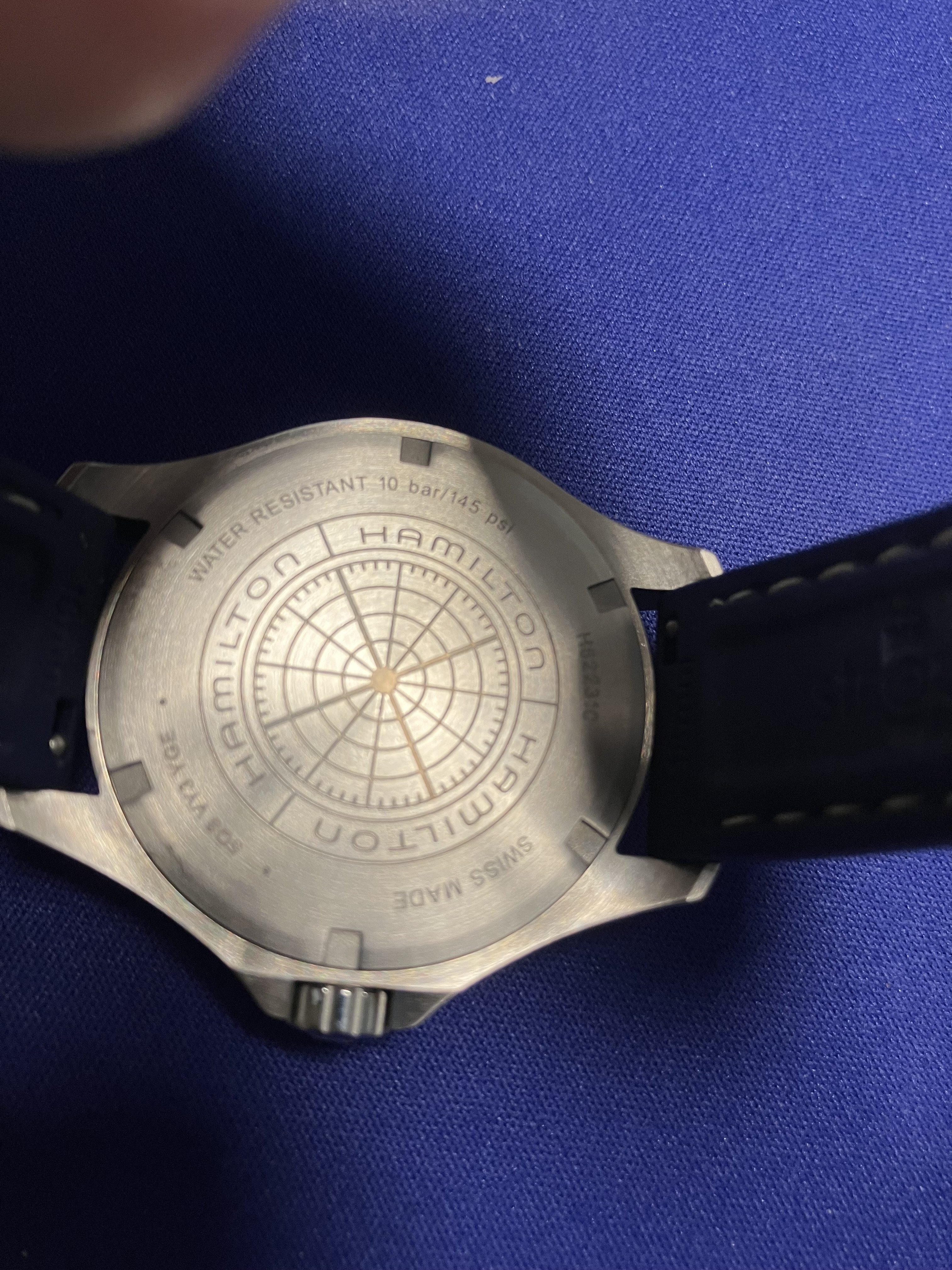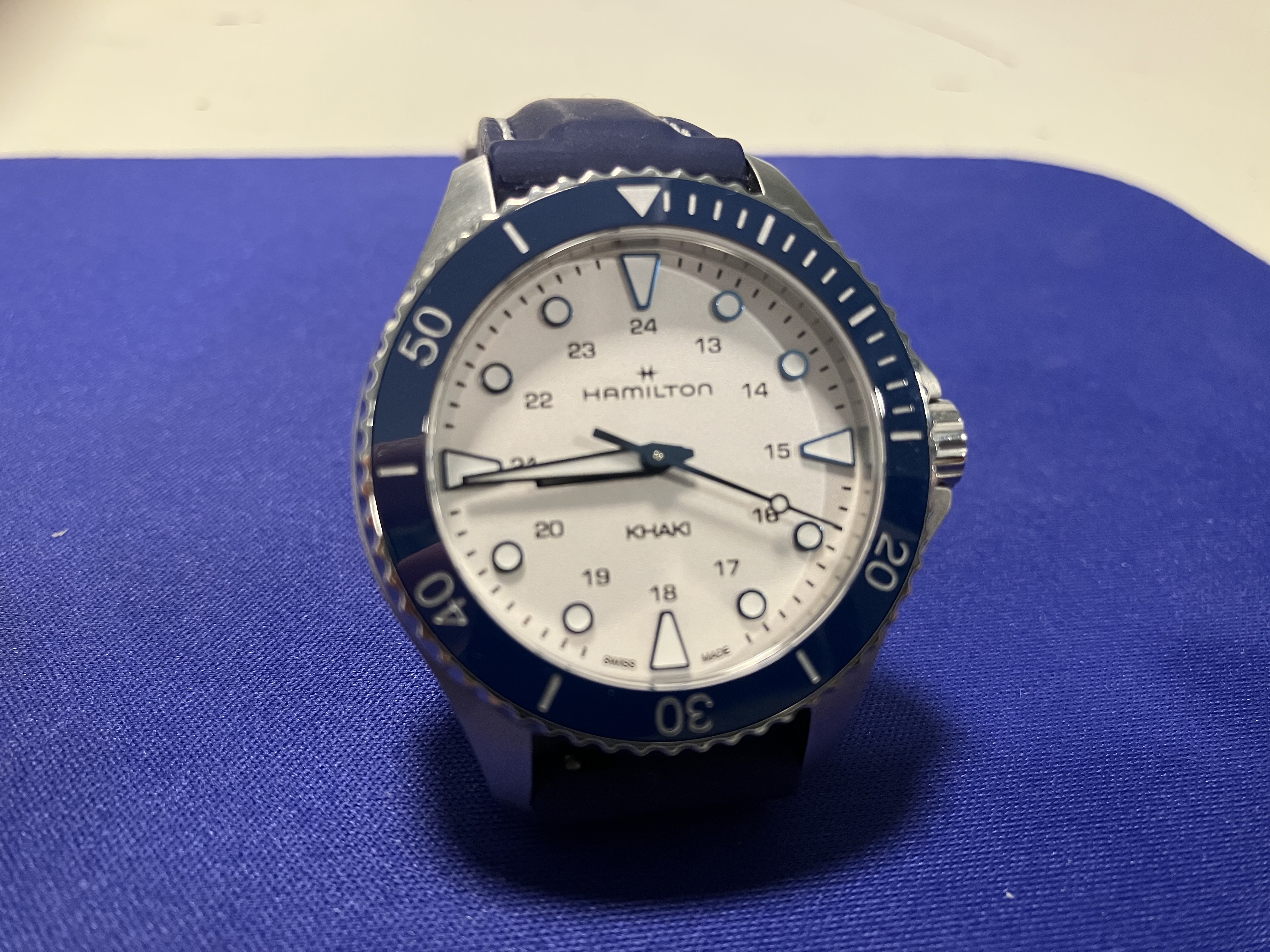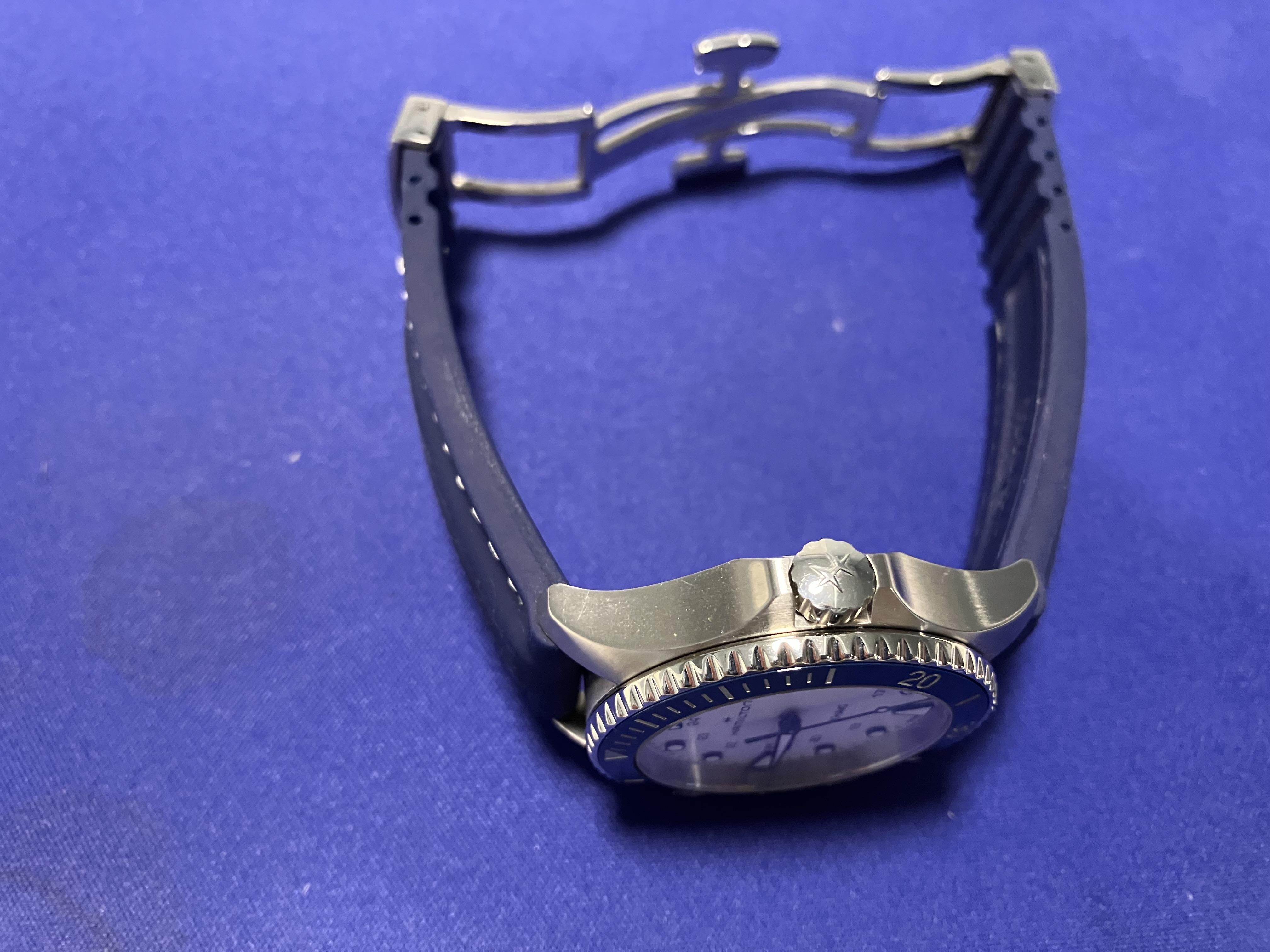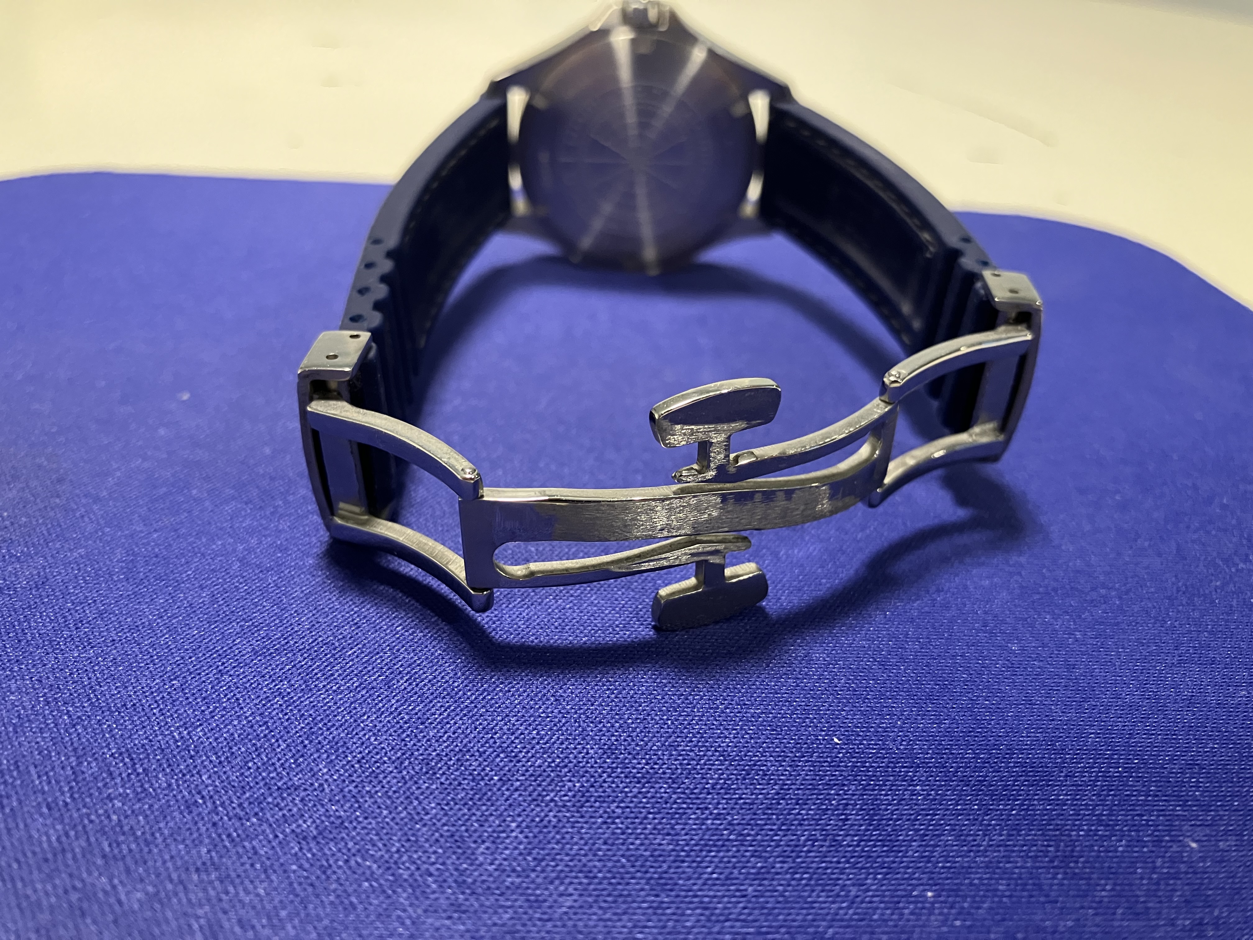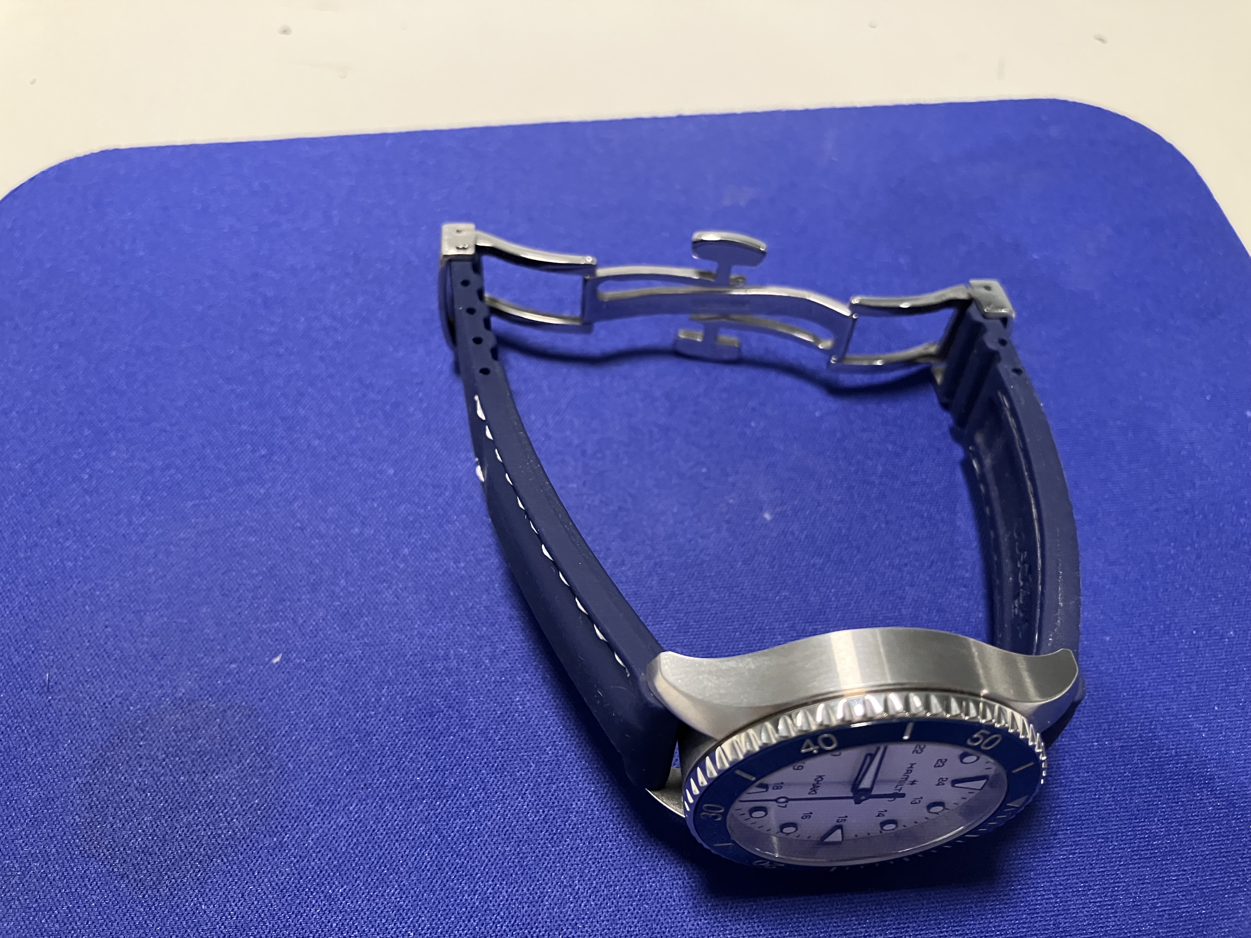 Mounted, currently, on an aftermarket silicone blue strap (white "stitching") that suits it well, using a Patek-Aquanaut-style double-deployant clasp. This is sized for my 6.75" wrist and is included in the sale.
