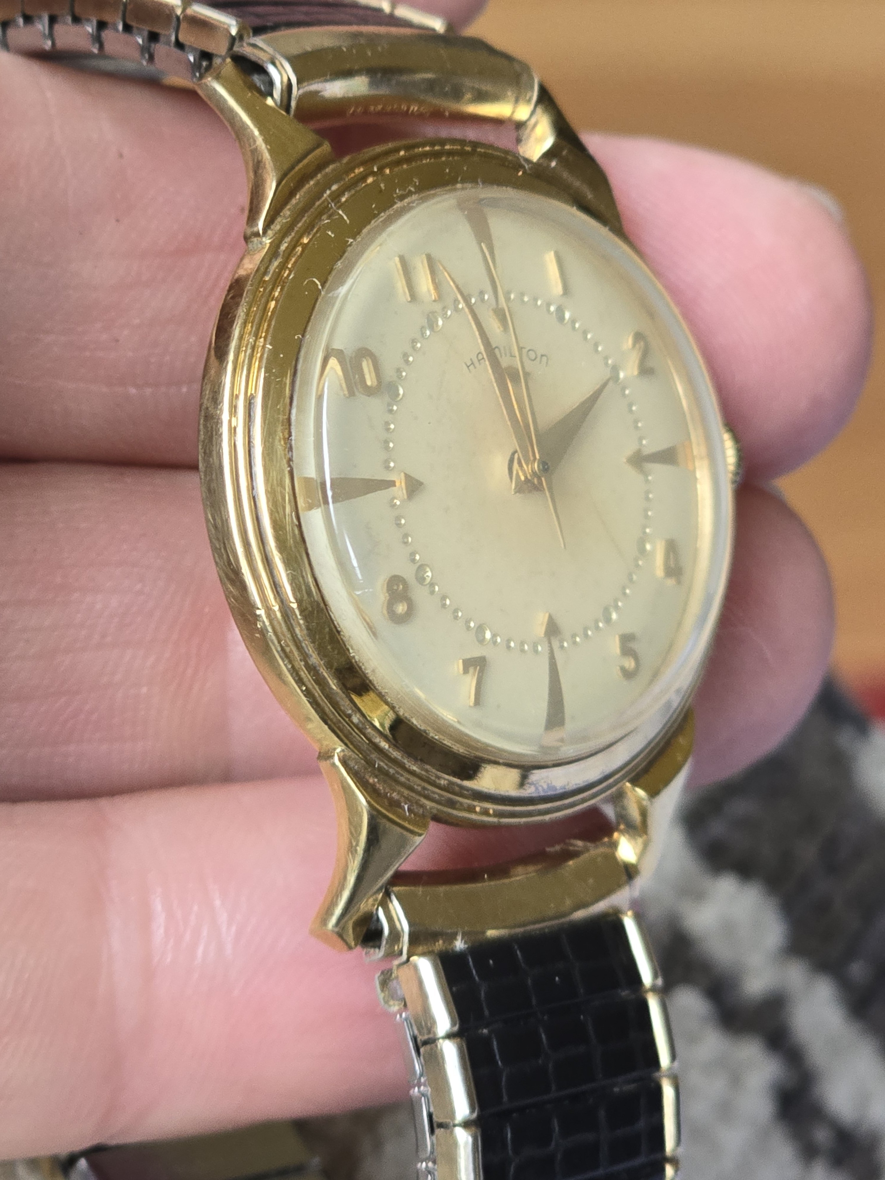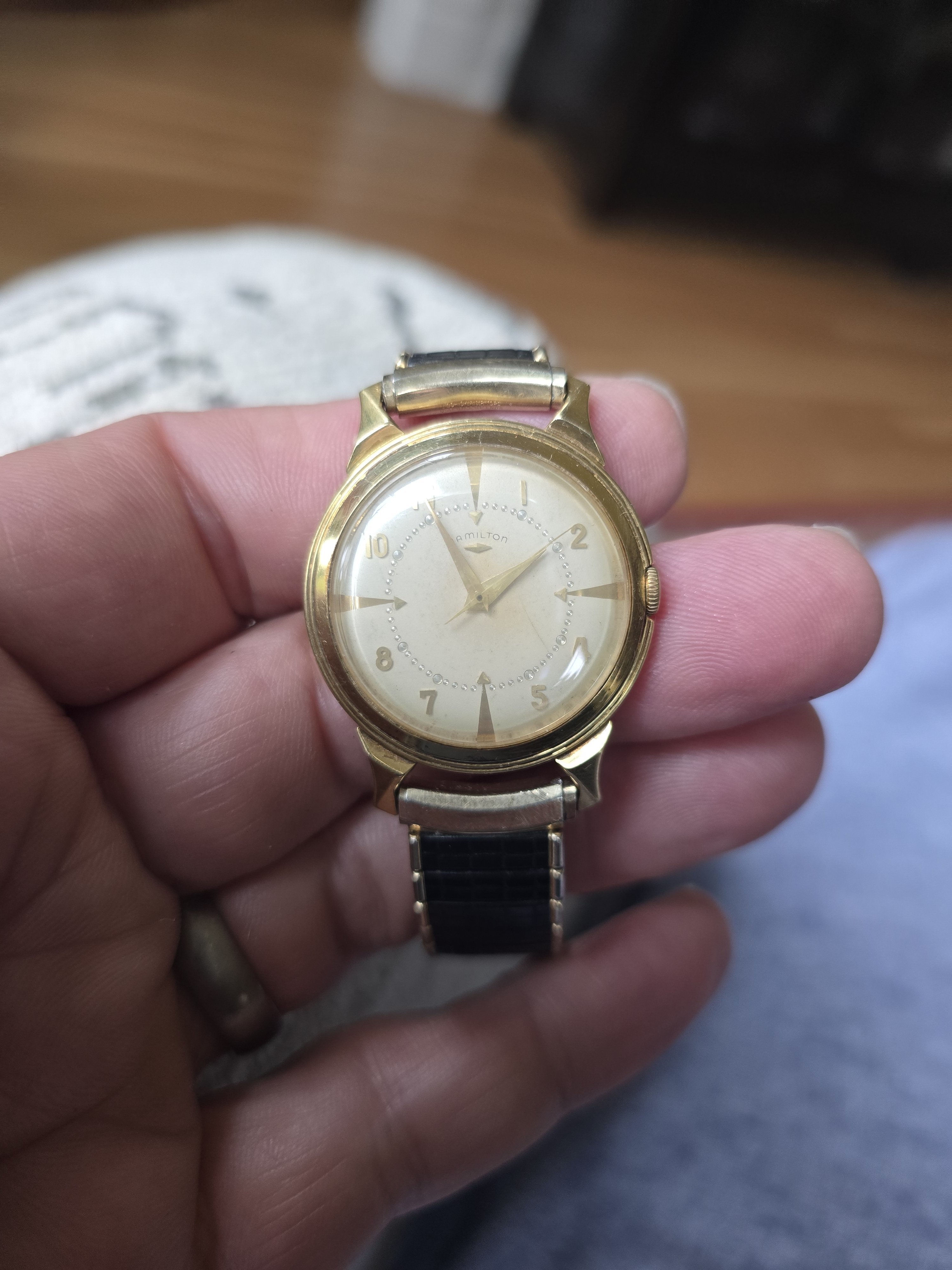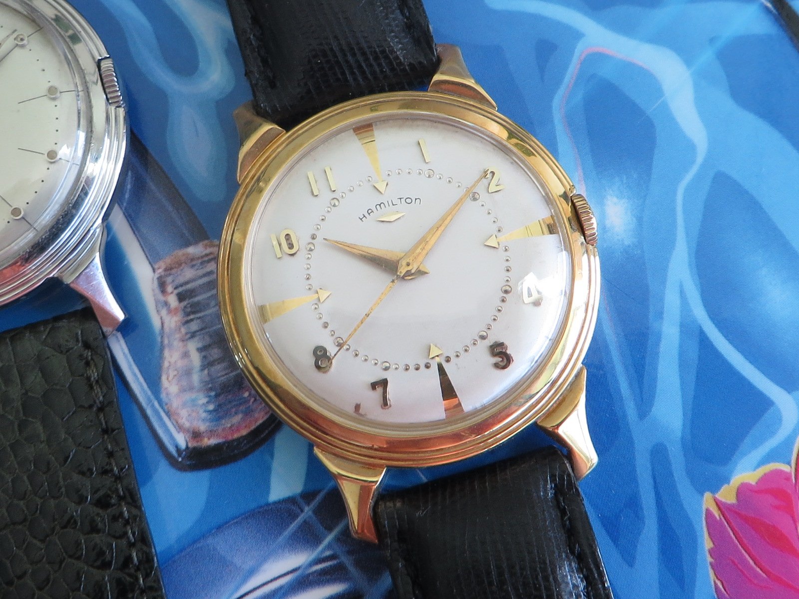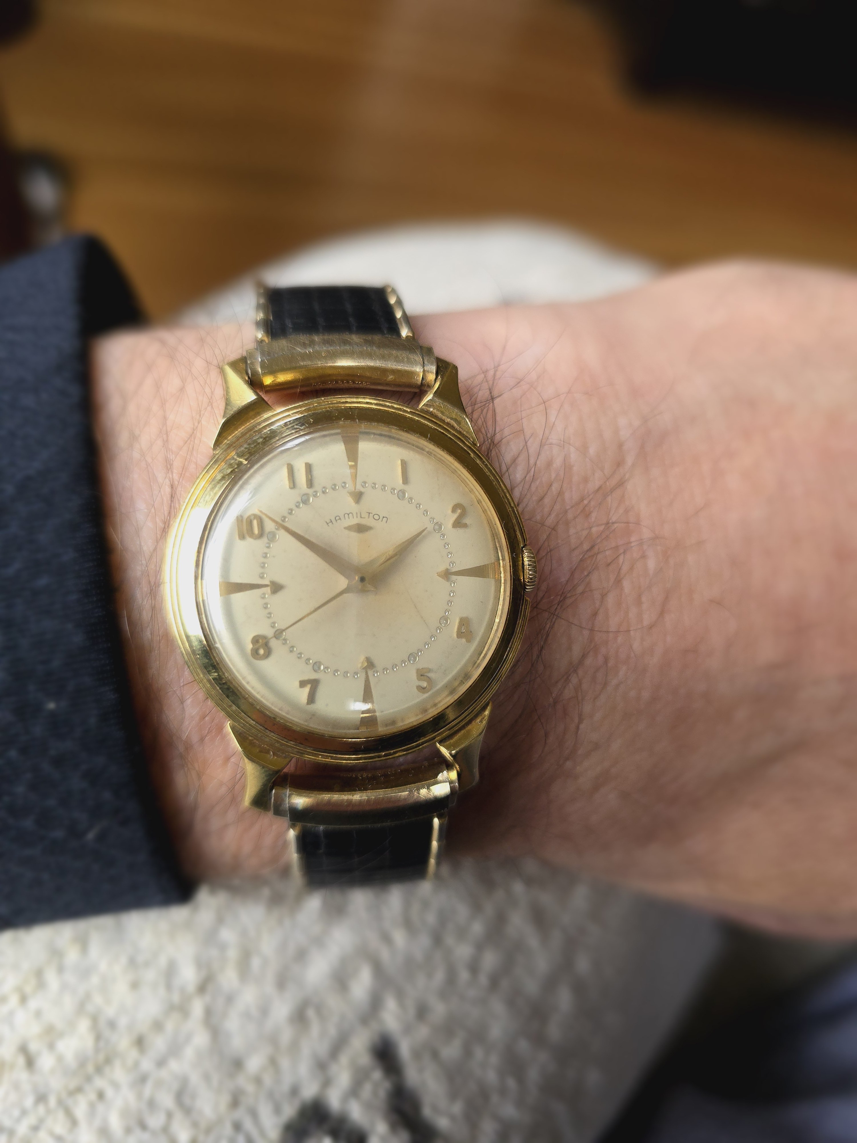 According to Dan at HamiltonChronicles.com, of the approximately 1100 Hamilton models, only about 15 models were available in 18k gold. Of those, the majority were not round. This Stormking I makes my second round cased 18K Hamilton, which obviously is nice.