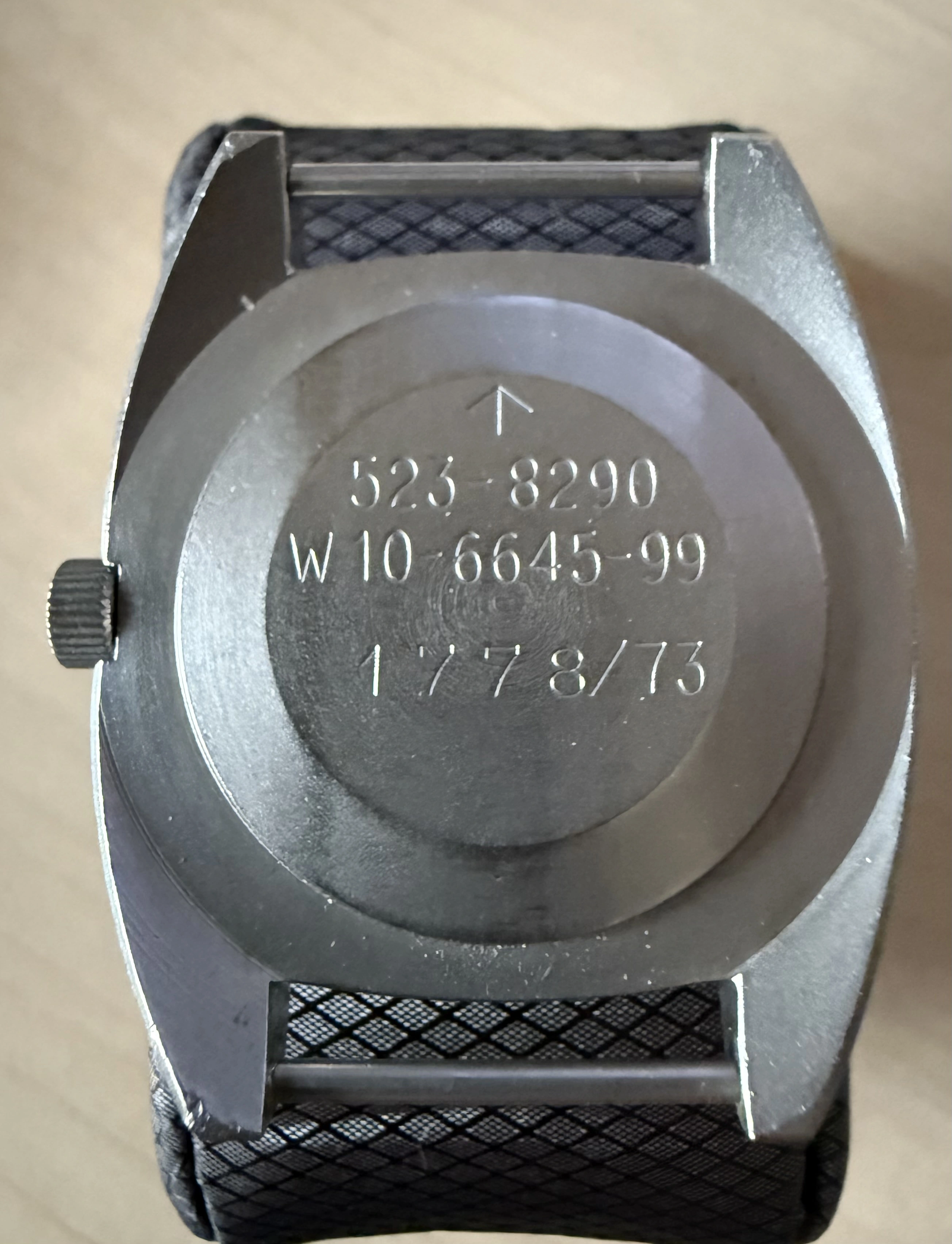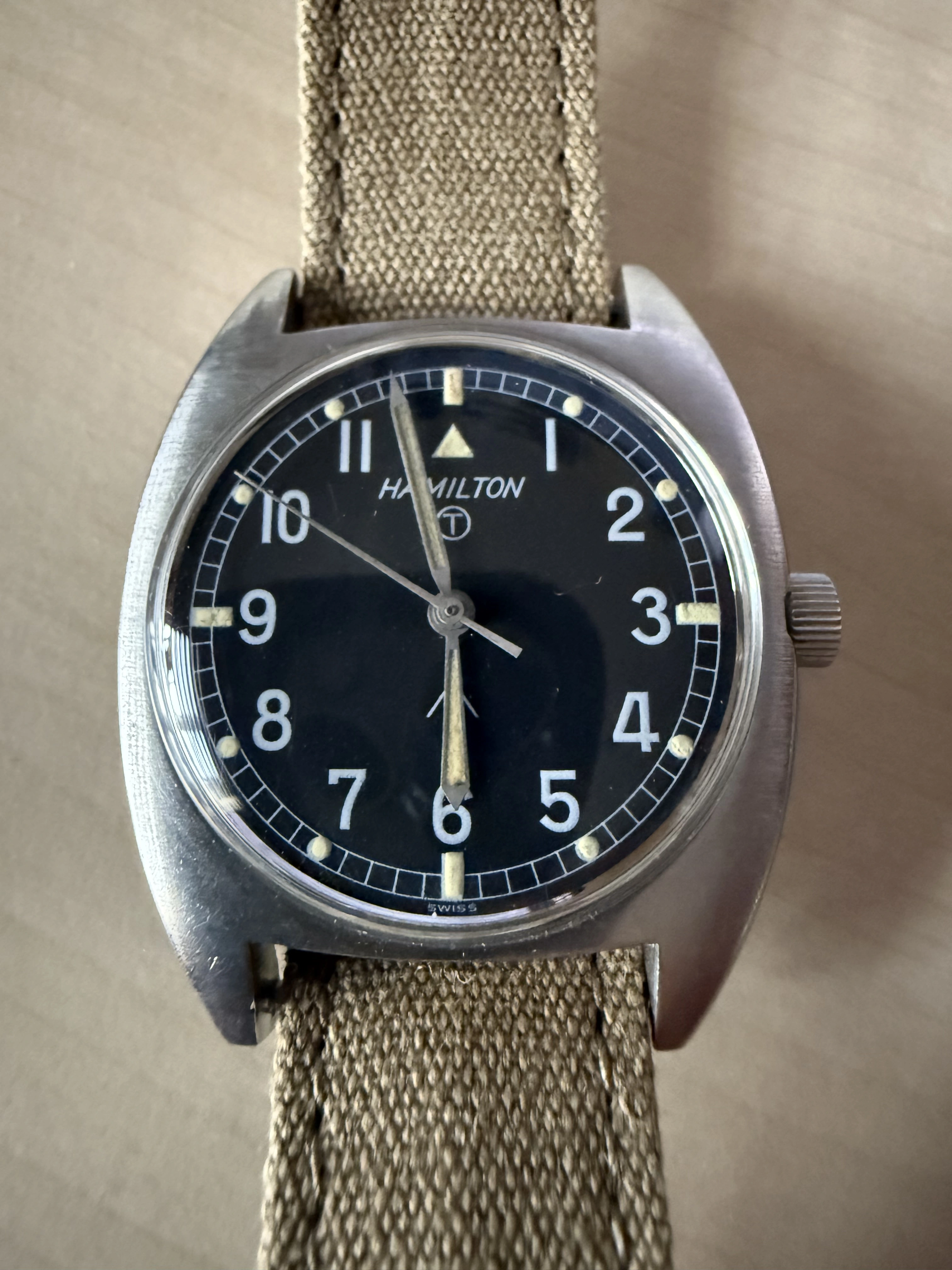 ·British military issue Hamilton W10 (W10-6645-99) circa 1973. Supplied on khaki canvas DEF-3 / A.F.0210 / Type 37 pattern strap, manufactured by ‘Revo’ on the Military Watch Forum