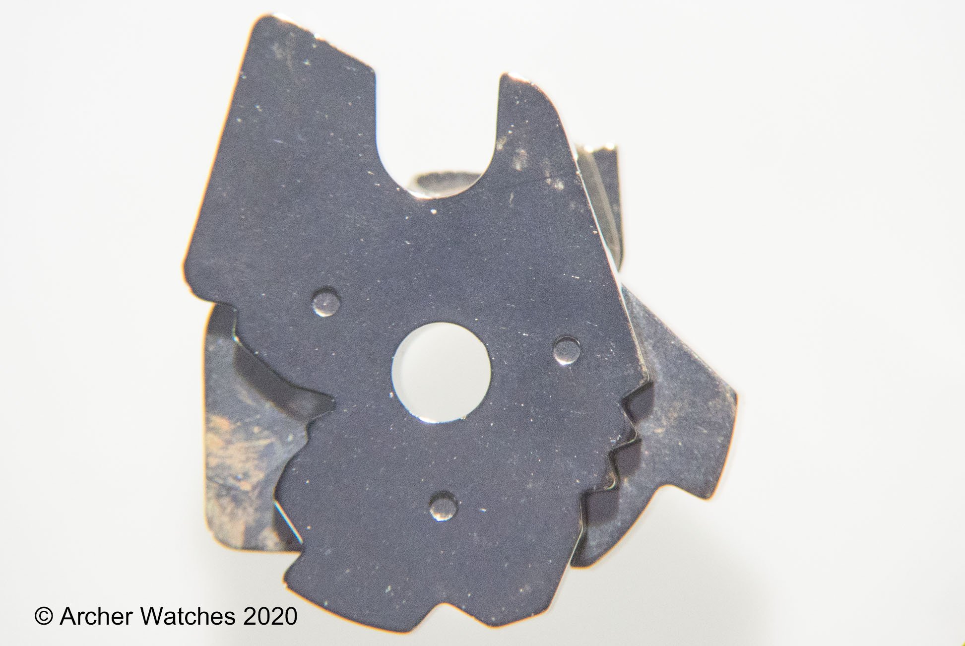 From the top shot above, what you would see on the movement if there weren't parts in the way, is that the cam is made in 3 layers, all with very different geometry. The underside is more complex: