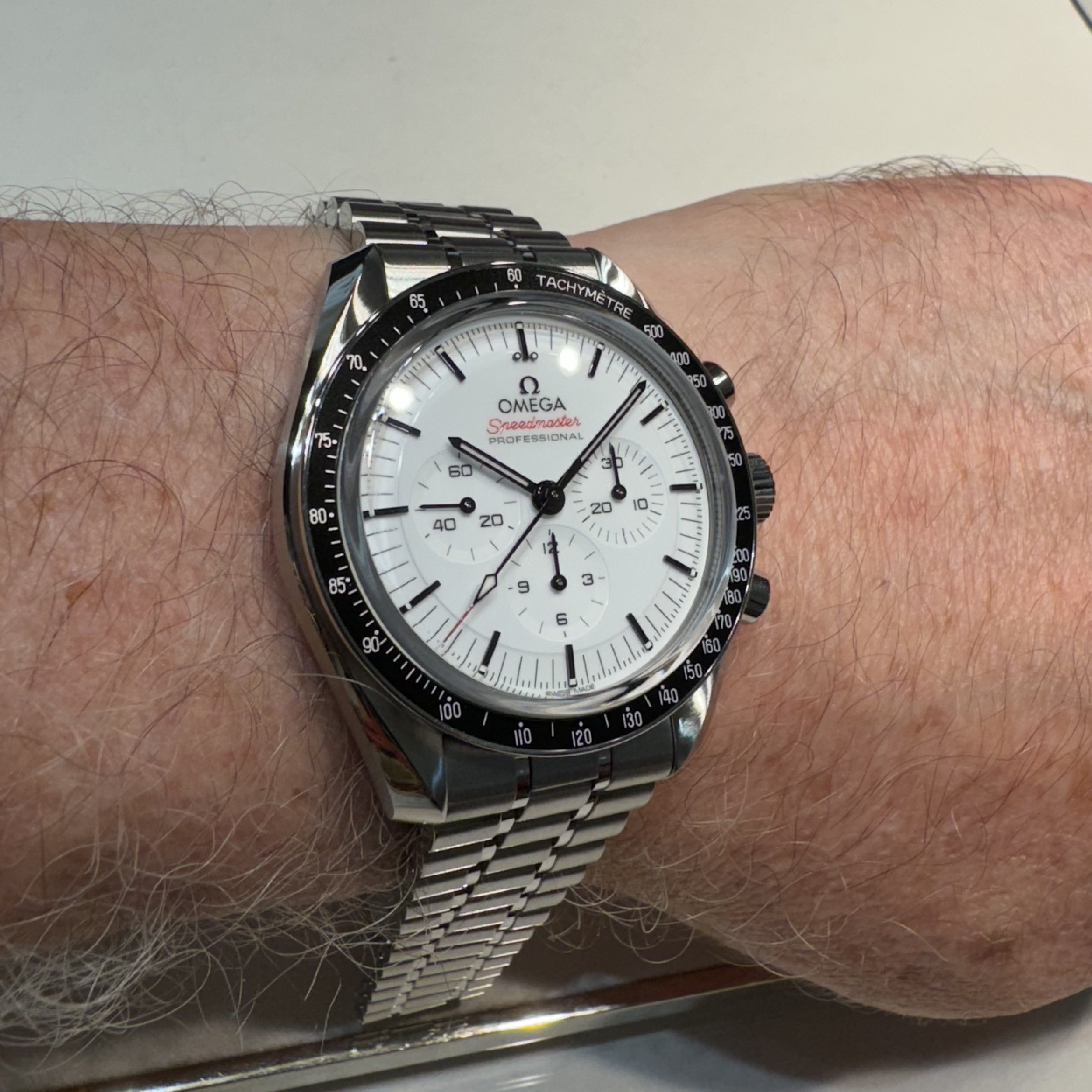 I stopped by the SF OB today to take a look at the white dial Speedmaster. They had one that you could look at but not try on. 🙄