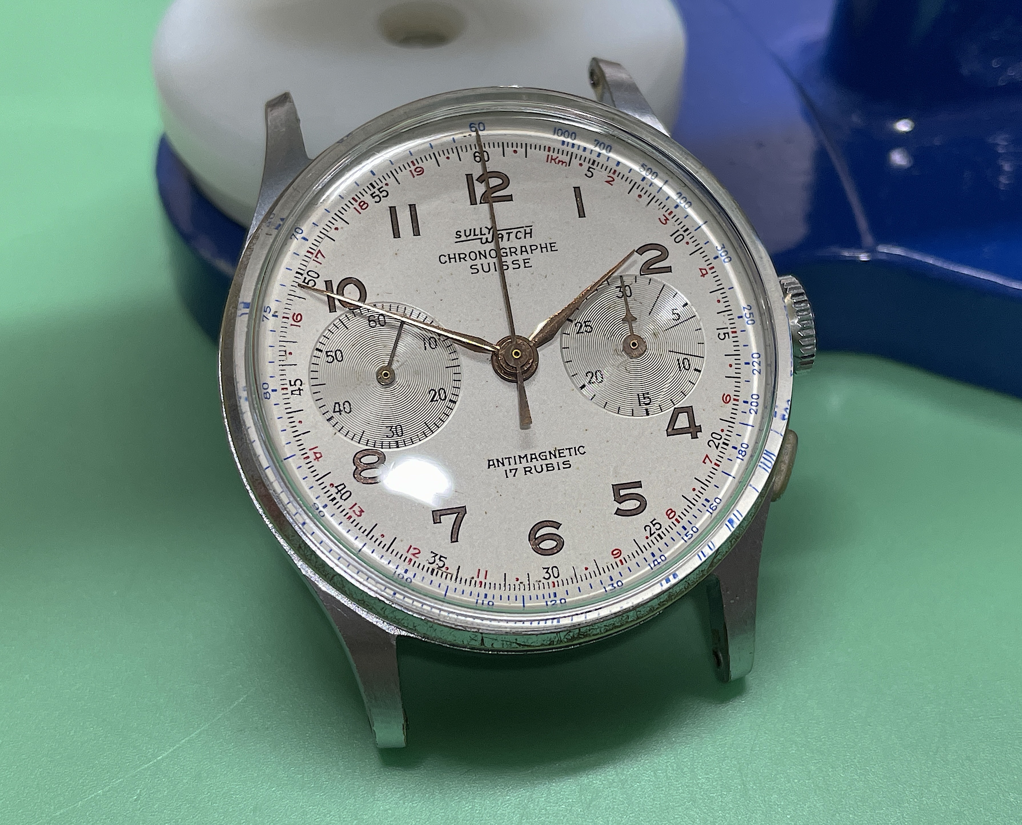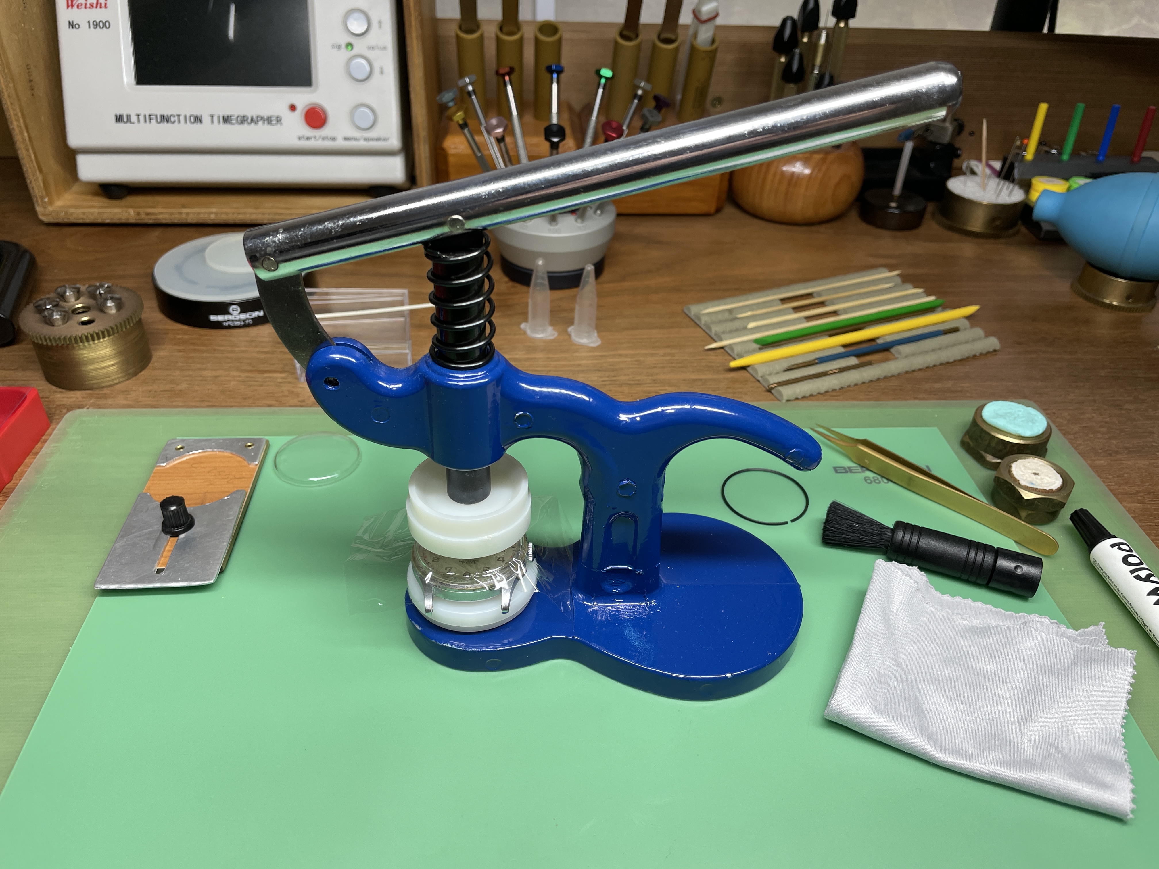 A pulse on the demagnetiser removed any residual magnetism. You can just see the sweep hand in the centre of the container.