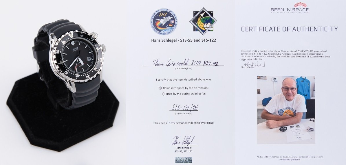 ·German ESA astronaut Hans Wilhelm Schlegel is selling his spaceflown wrsit watches worn on space shuttle Atlantis mission STS-122 in February 2008 (the mission needed 3 launch attempts before it took off !)