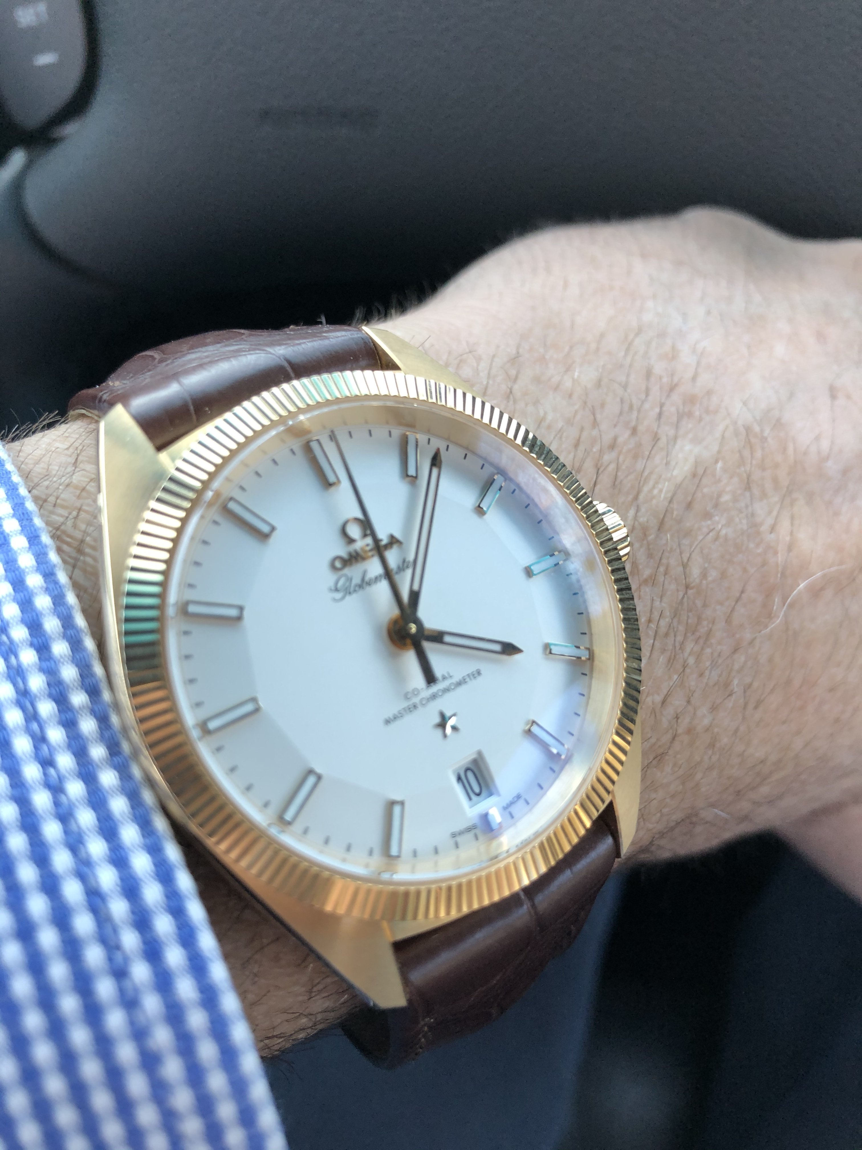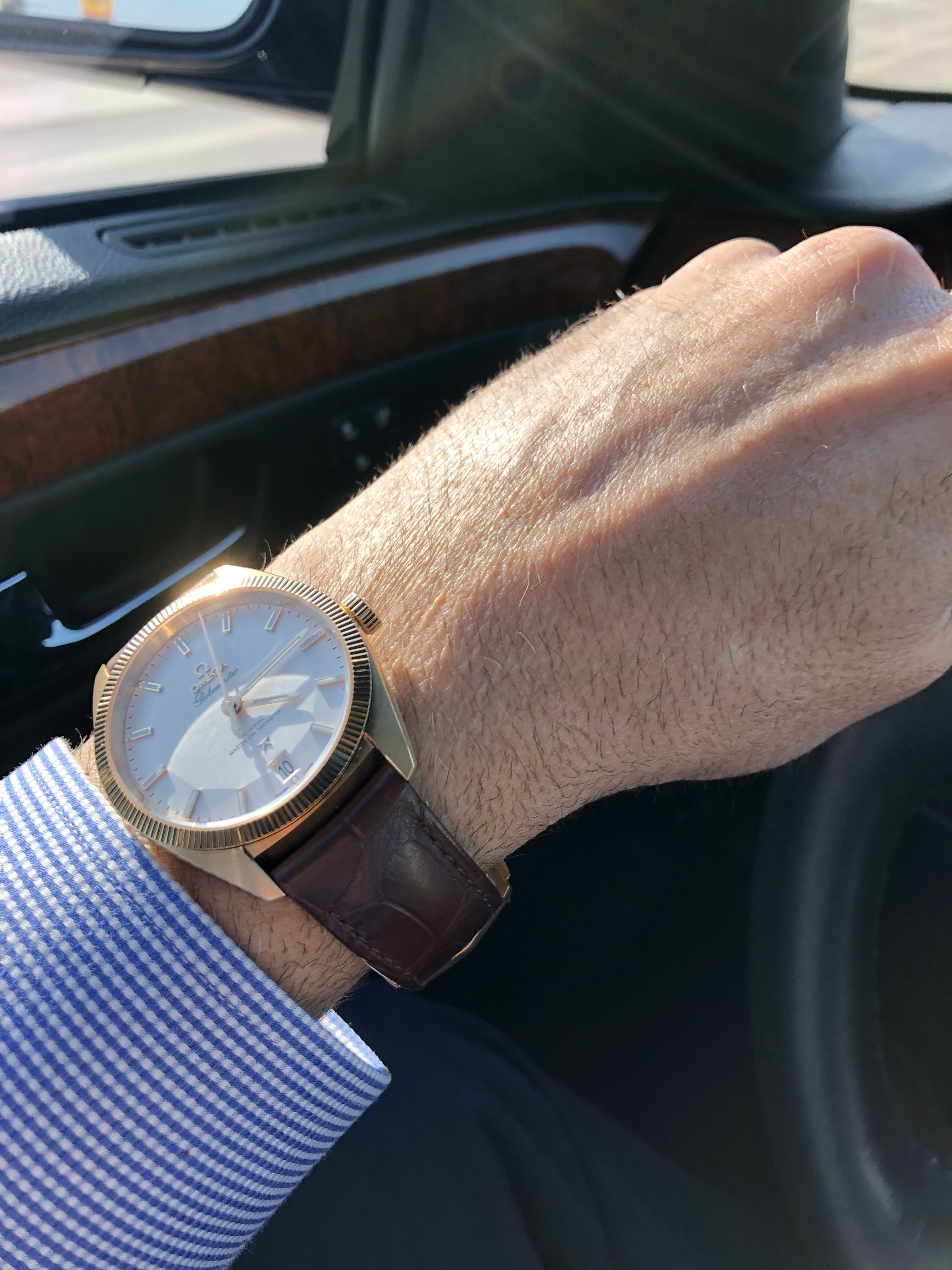 Bought my first Omega watch today. Wow am I happy. This is the end of a long search of many brands and options. Looking for a dress watch, yellow gold, rich leather, and a nice comfortable clasp. This nailed everything. I kept looking, but just could not find a watch better for me. This has a little pop to it, not as plain as many very nice dress watches, but still keeps a very elegant presence to it.
