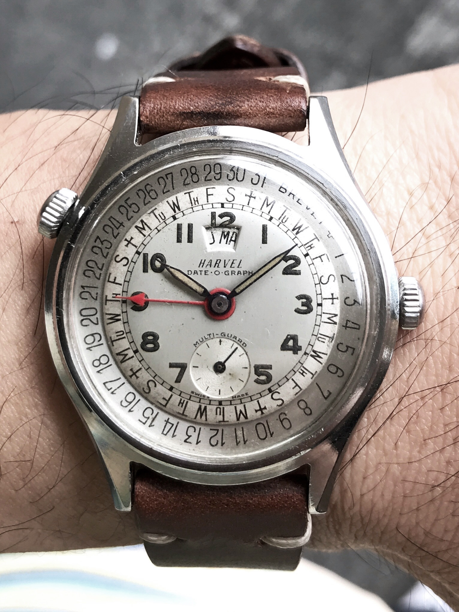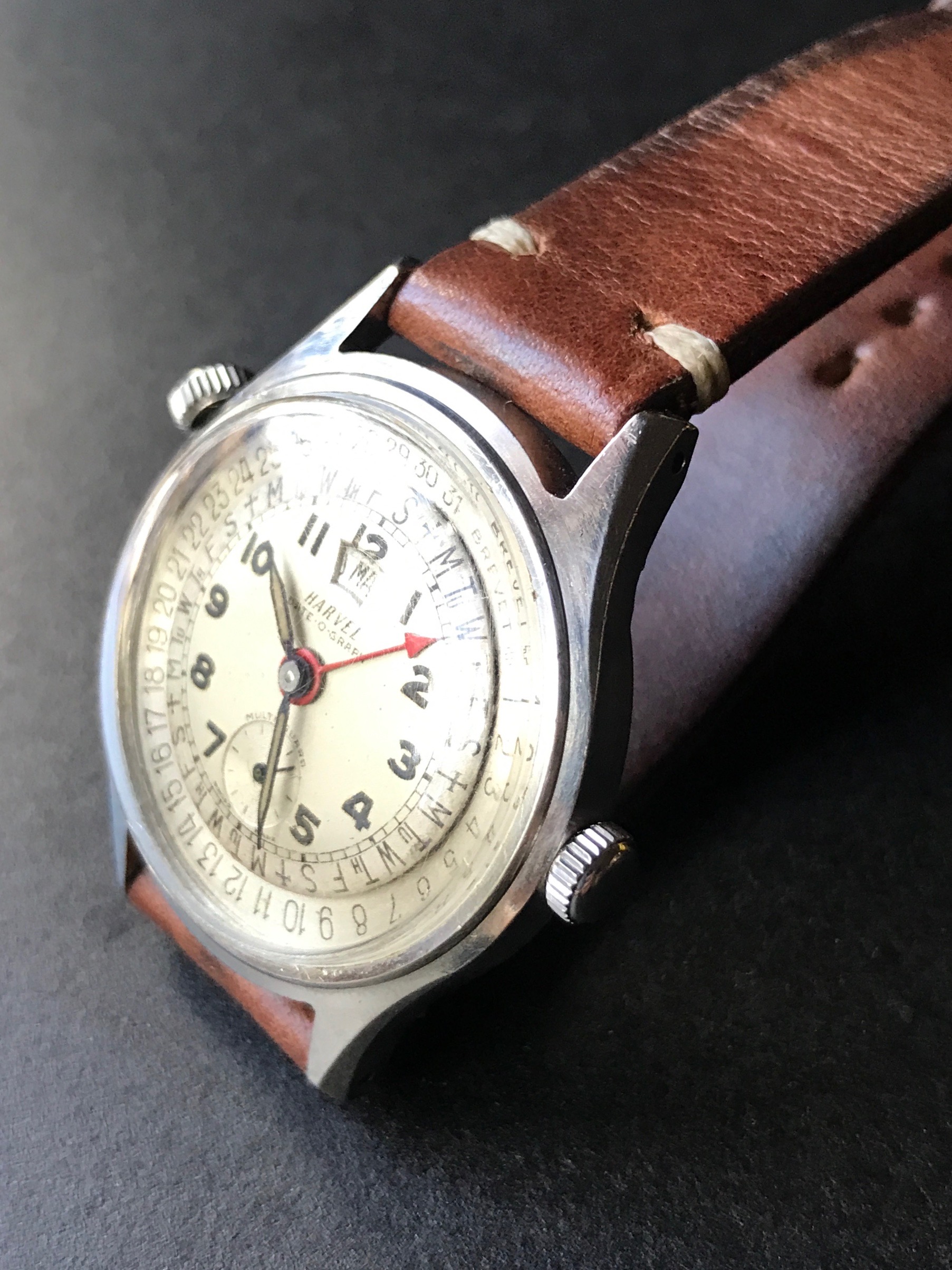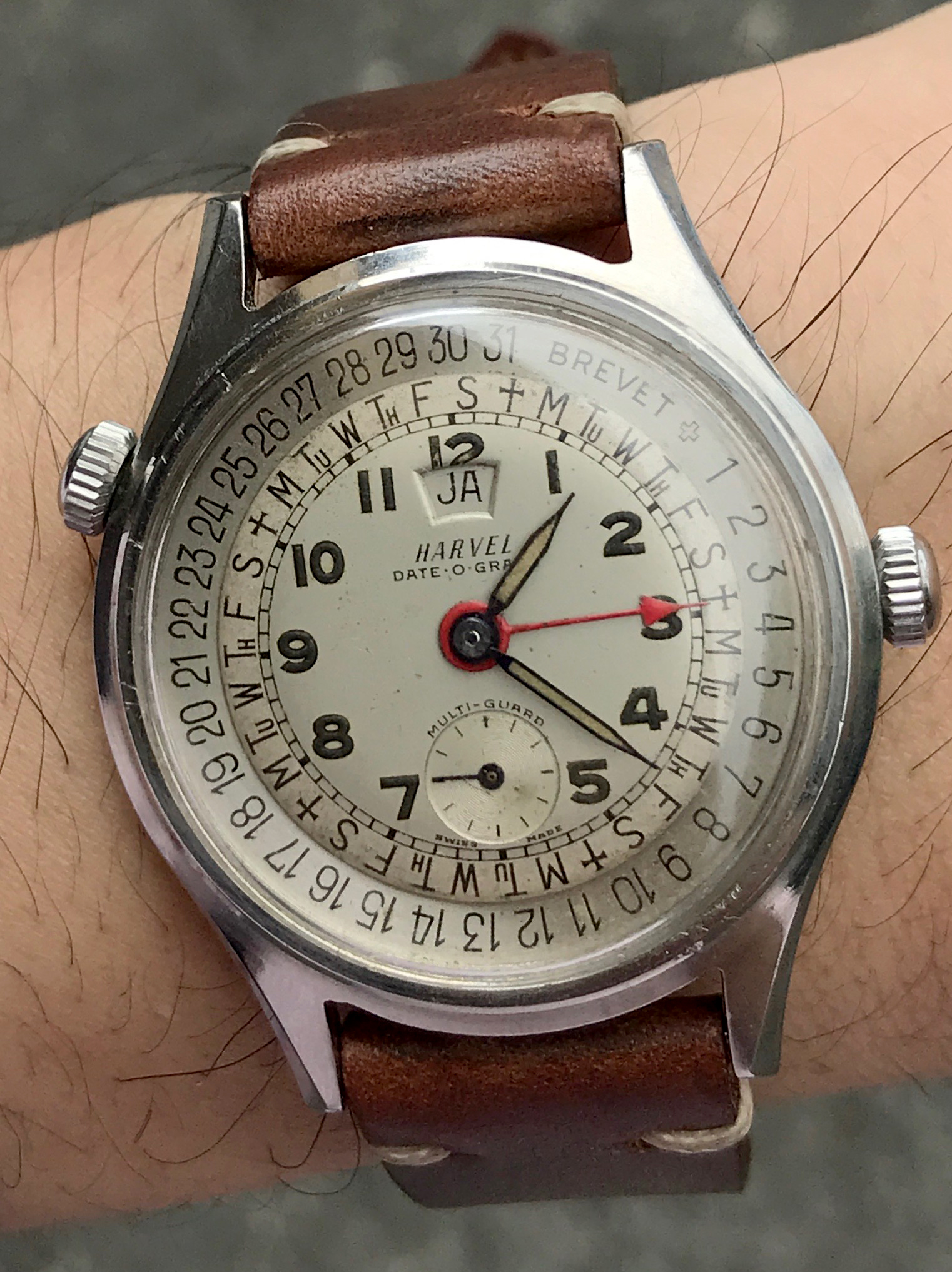 Dial: the light gray dial is in very good condition with some specks on it. Nice lumes on the numbers and hands. The red hand with the arrow tip is also a nice touch. Of course, the highlight of the dial are the days and dates printed on it, with the outer dial being adjustable (using the crown at the ten o'clock area).