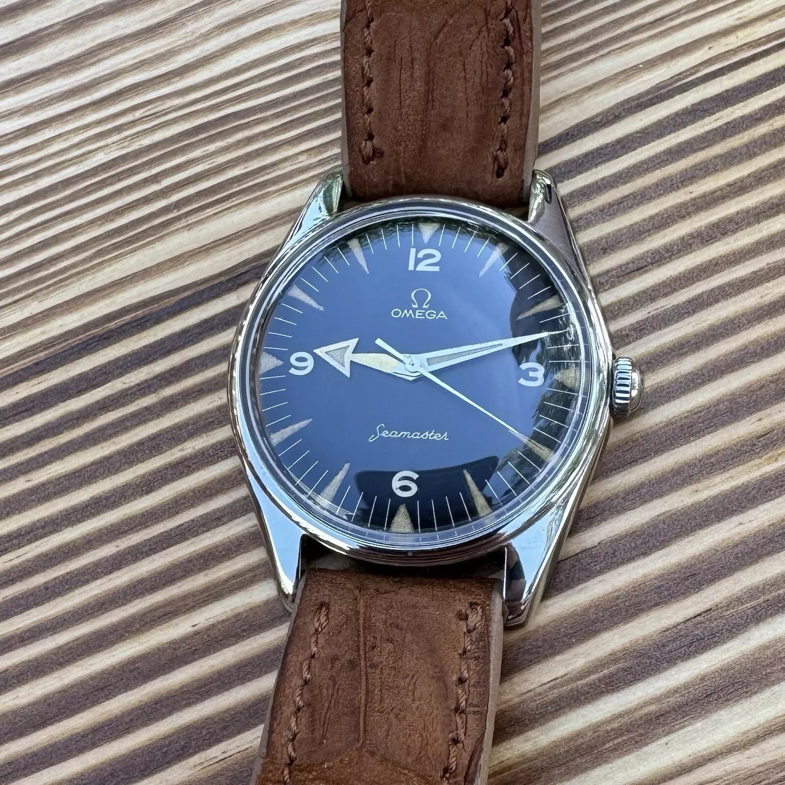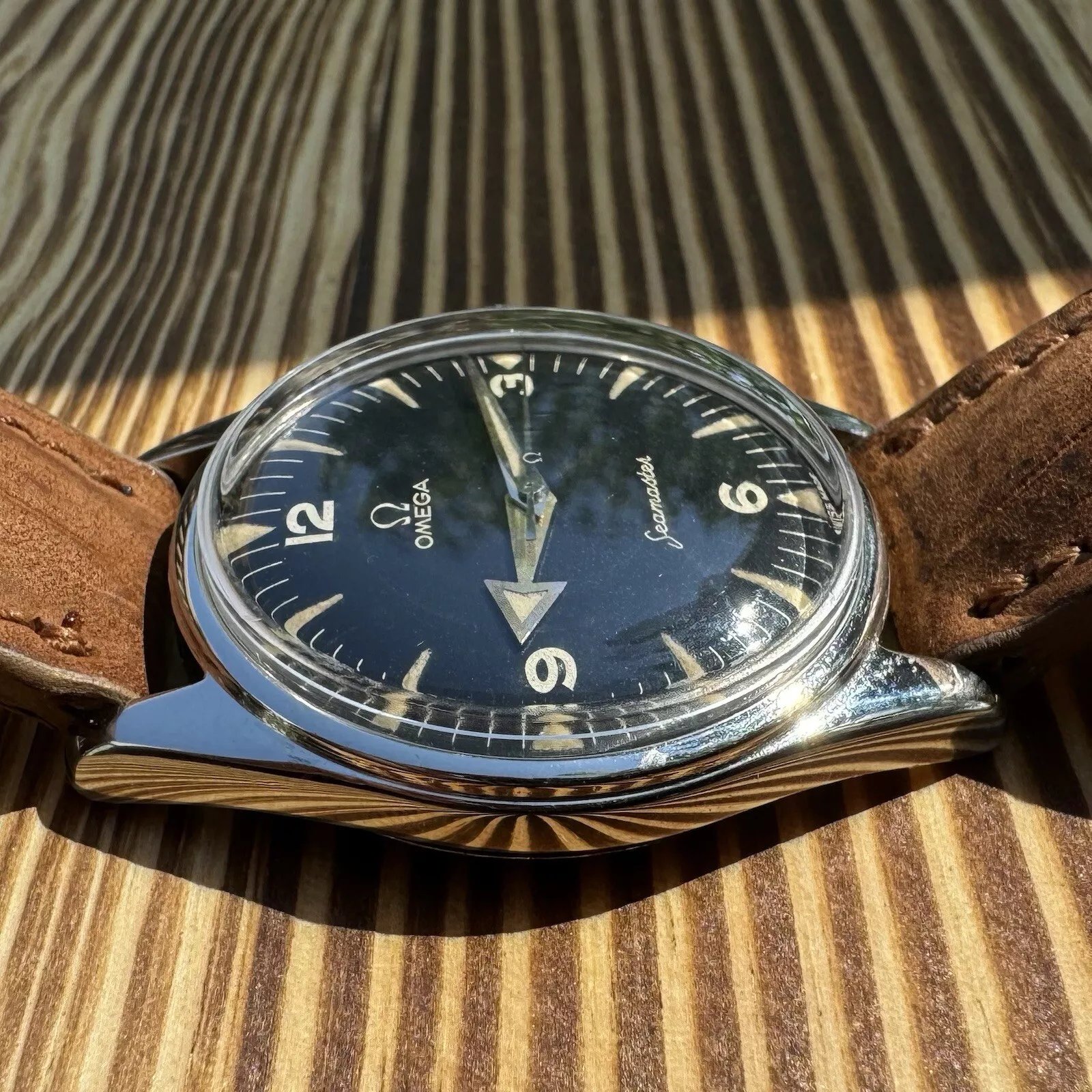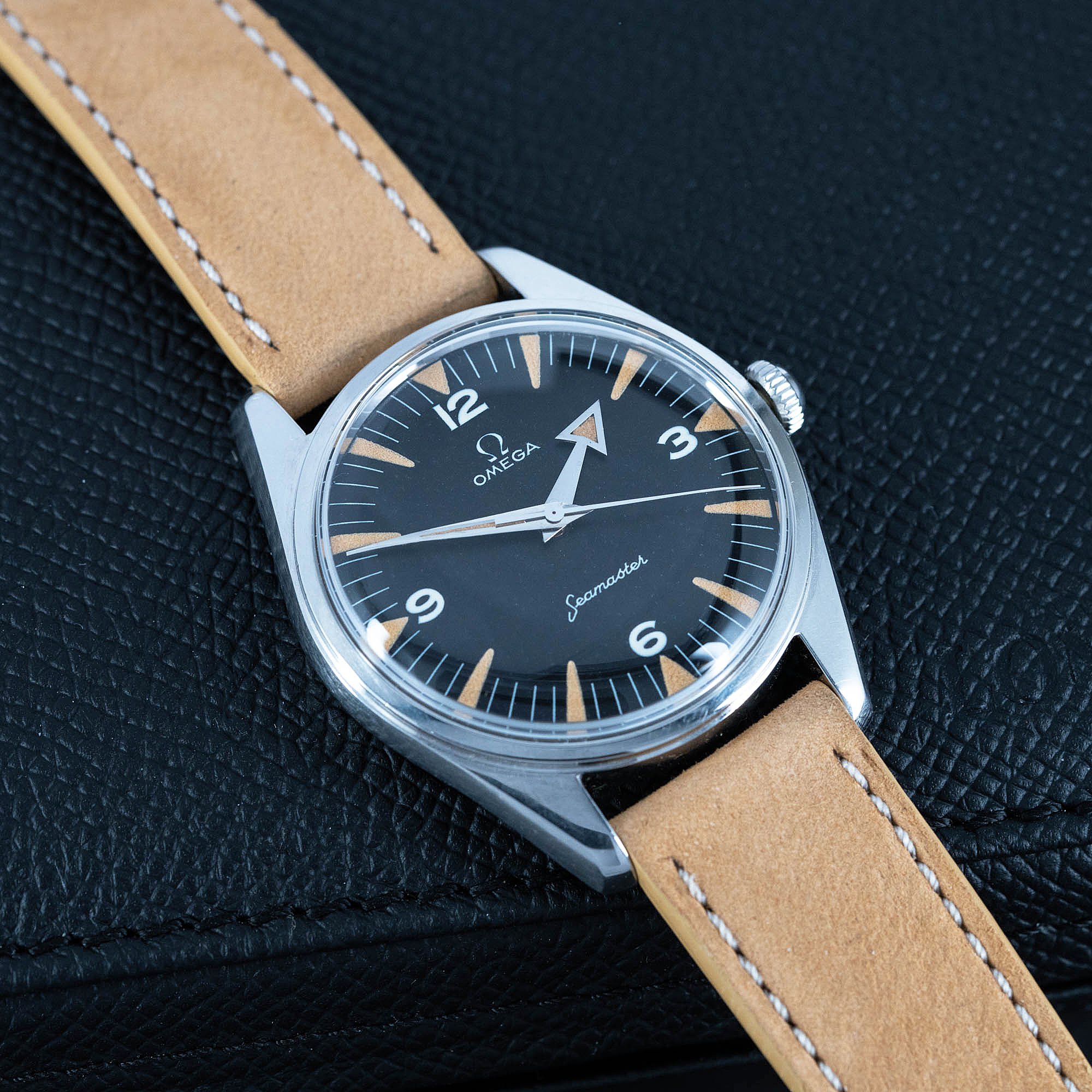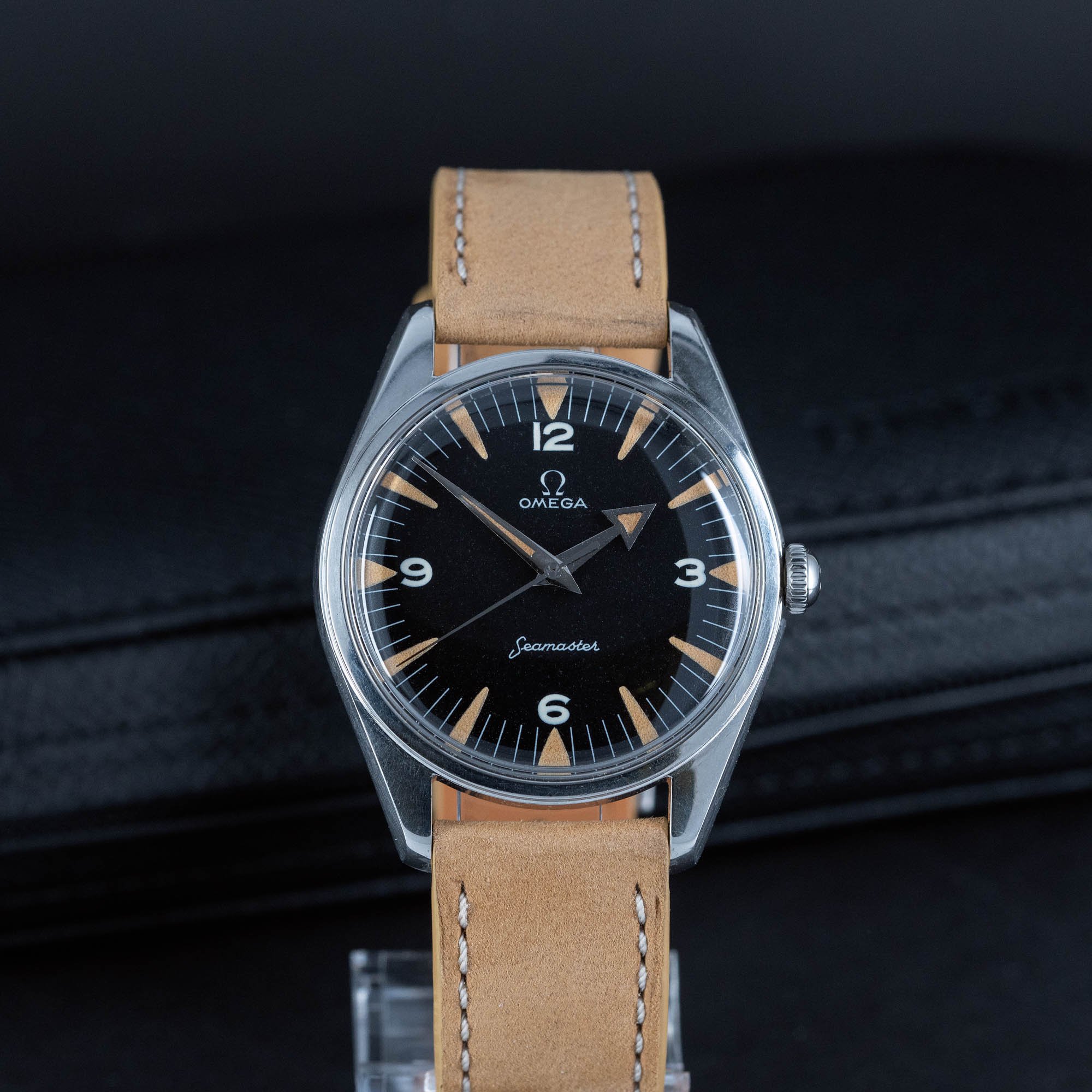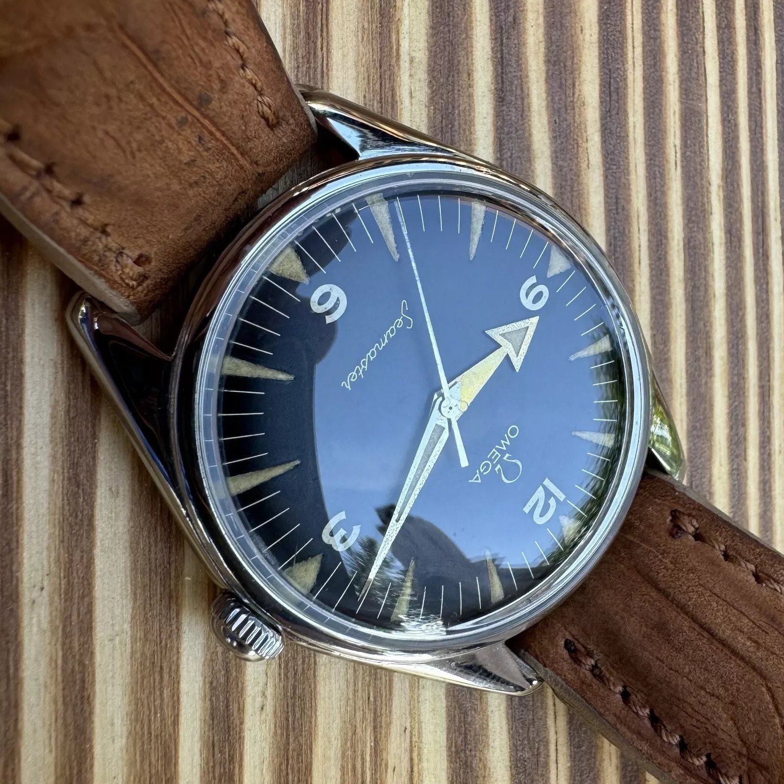 ··yoloA black dialed 2996 with Seamaster script and broad arrow hands.