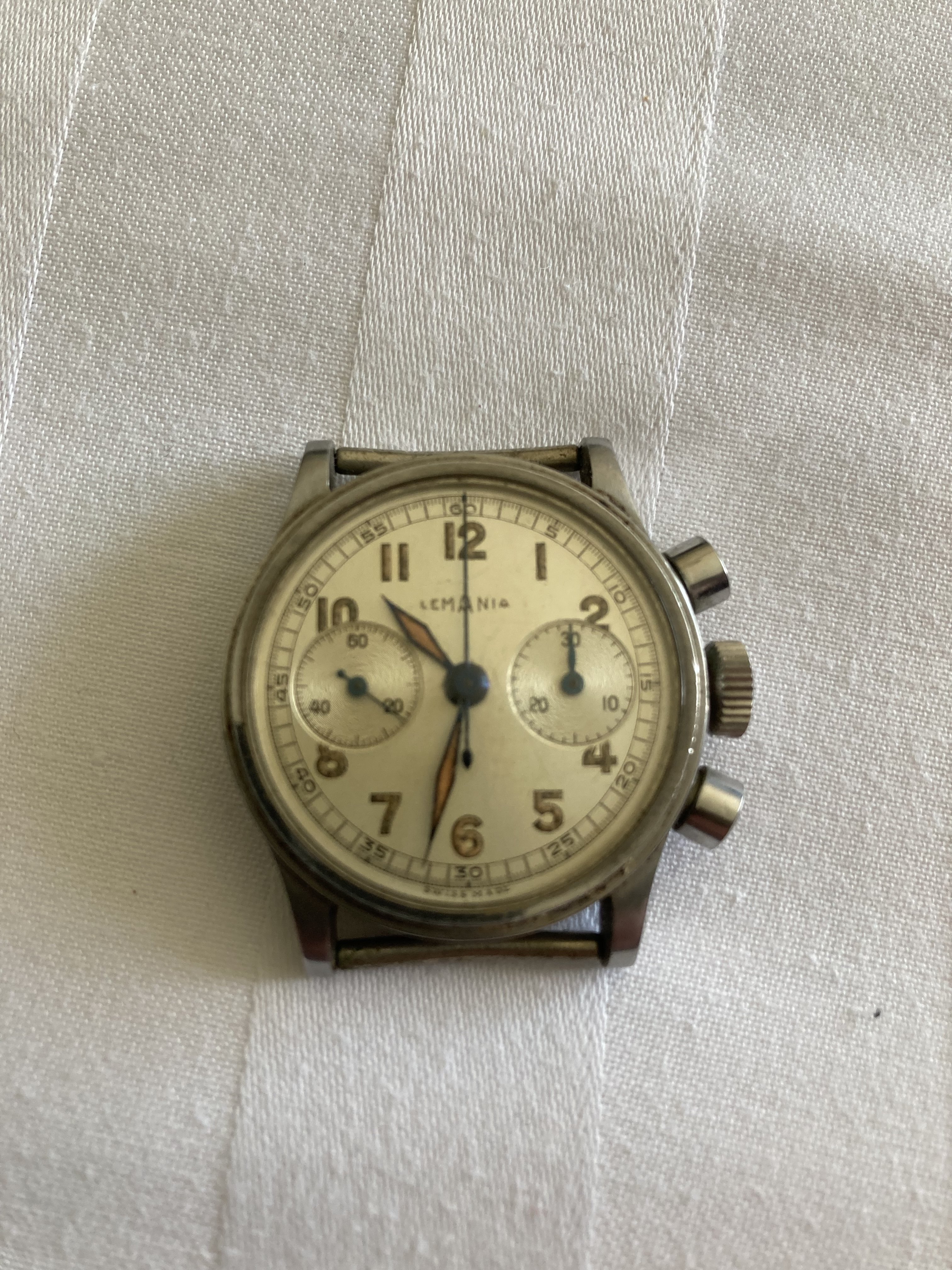Lovely chronograph and heirloom. The RAF did issue some Lemania chronographs, but this particular one appears to be a civilian version. A realistic market value would be in the general neighborhood of £2000 IMO.