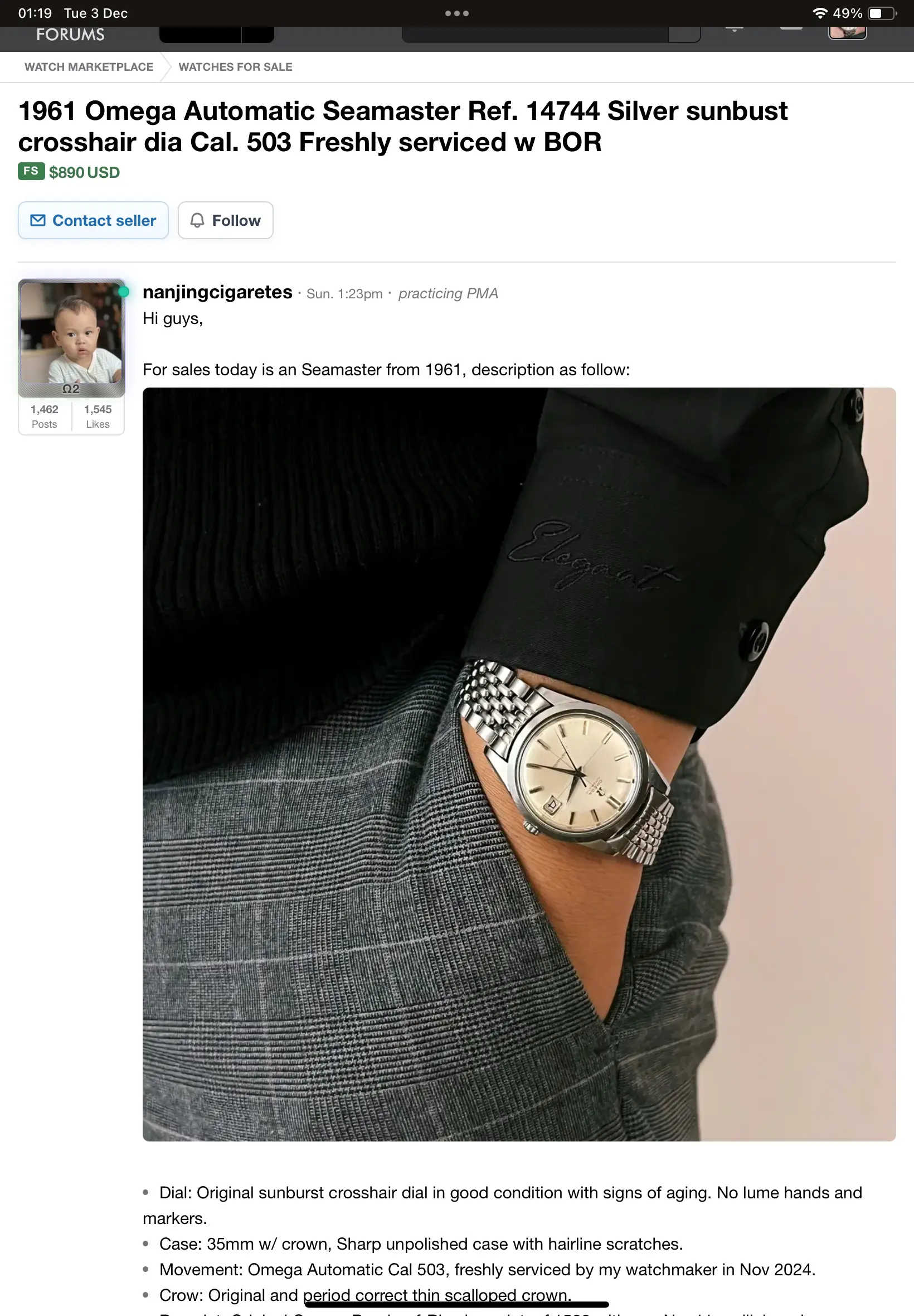 The first watch is a 1967 116.010 with the 562 movement, it features Onyx inlays, crosshair white dial (I believe) with some patina visible, possibly some water ingress around the 2-4 markers visible. Second hand also has some corrosion but other then that dial seems to be in relatively good condition. Case seems to have been polished but the brushing on the sides of the case seem to be present, however there are a couple dings on the top right lug along with a replaced crown. This watch is the cheaper of the two being $536 shipped.