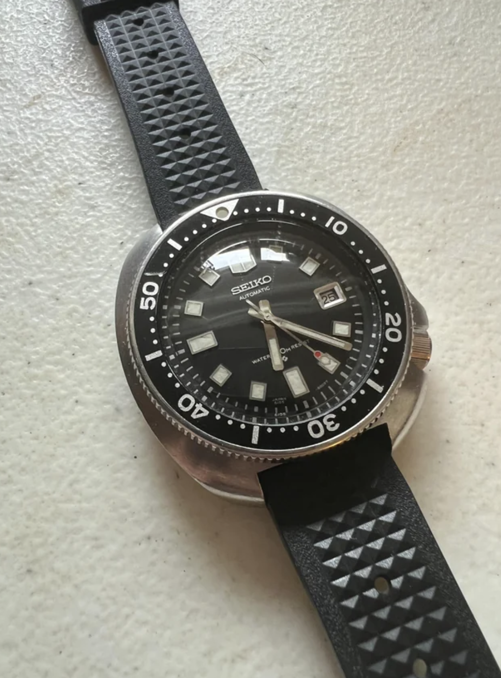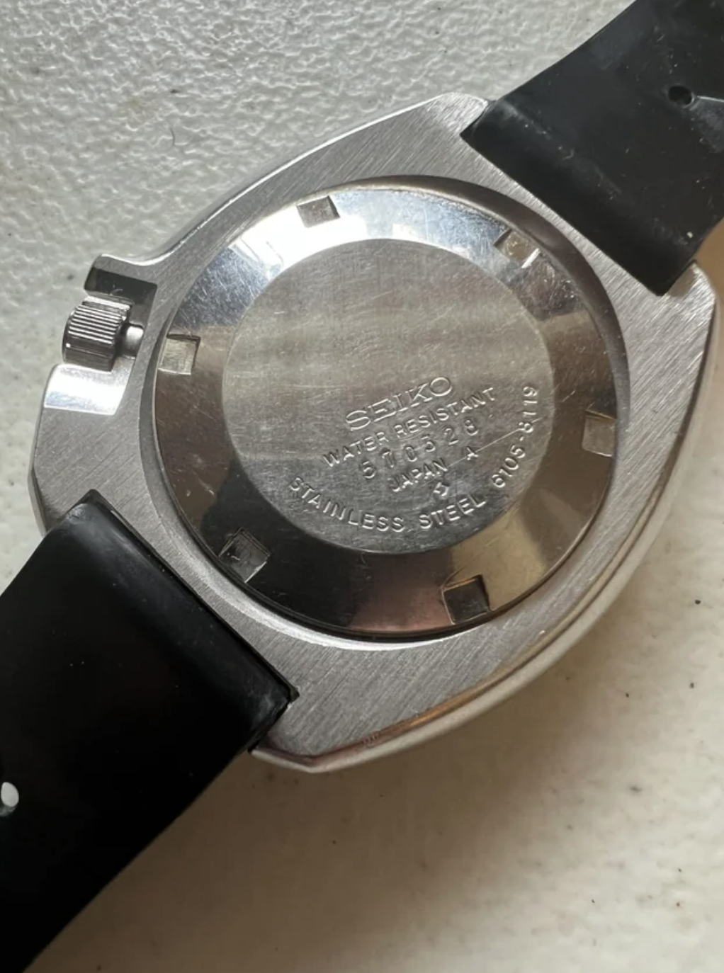 ·I've been a fan of the Seiko 6105 for a while and have owned an SRP777 and SPB151, but they didn't quite scratch the itch. I've been toying with the idea of getting the modern re-issue SLA-033, but I feel like it would be the same thing - almost a 6105, but not quite. So now I've started looking at vintage 6105's and this one has caught my eye. I know it has the less desirable "Resist" dial and non-horse shoe caseback, but nothing jumps out at me as being aftermarket. The seller says everything is original to watch except the crystal, which was replaced during a recent service. Admittedly, I know almost nothing about vintage Seiko's. So, would one of you fine experts mind weighing in on the originality and condition of this particular 6105?