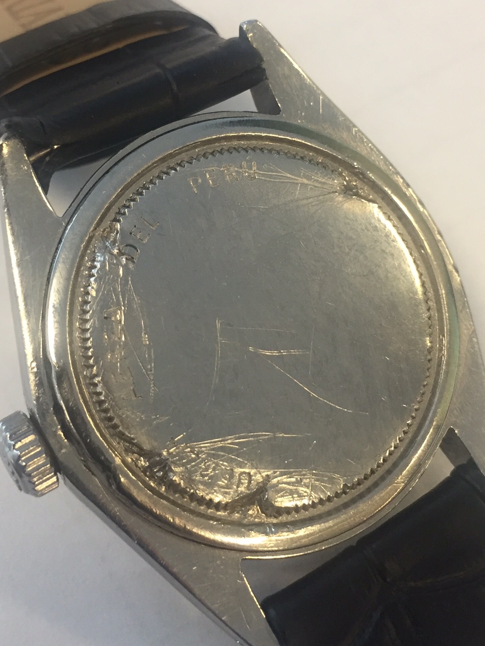 It's arrived today and the caseback is VERY chewed up - somebody absolutely mangled it attempting to get it open. To the point where I'm quite surprised nothing was noted in the listing. The vast majority of the "FUERZA AREA DEL PERU" text is intact (the F is missing and there is a deep scratch through the RU of Peru), however, the caseback freely spins when i move it with my finger and there are chunks of metal missing.