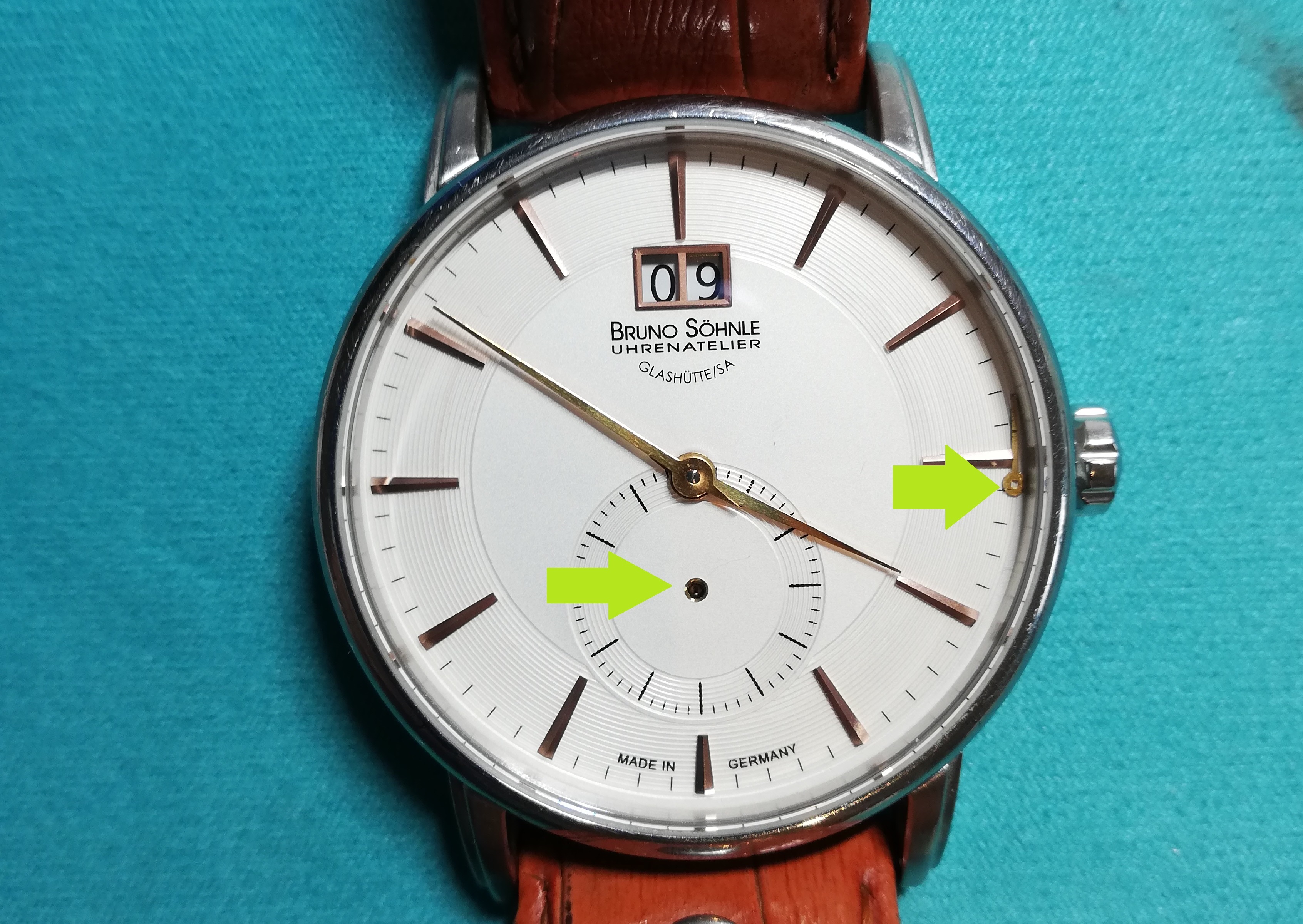 I had to bend the intact foot of the dial, and also had to file it a little bit, in order to fit the smaller holes of the new movement, worked out ok. So watch is ticking and keeps time, thats great!