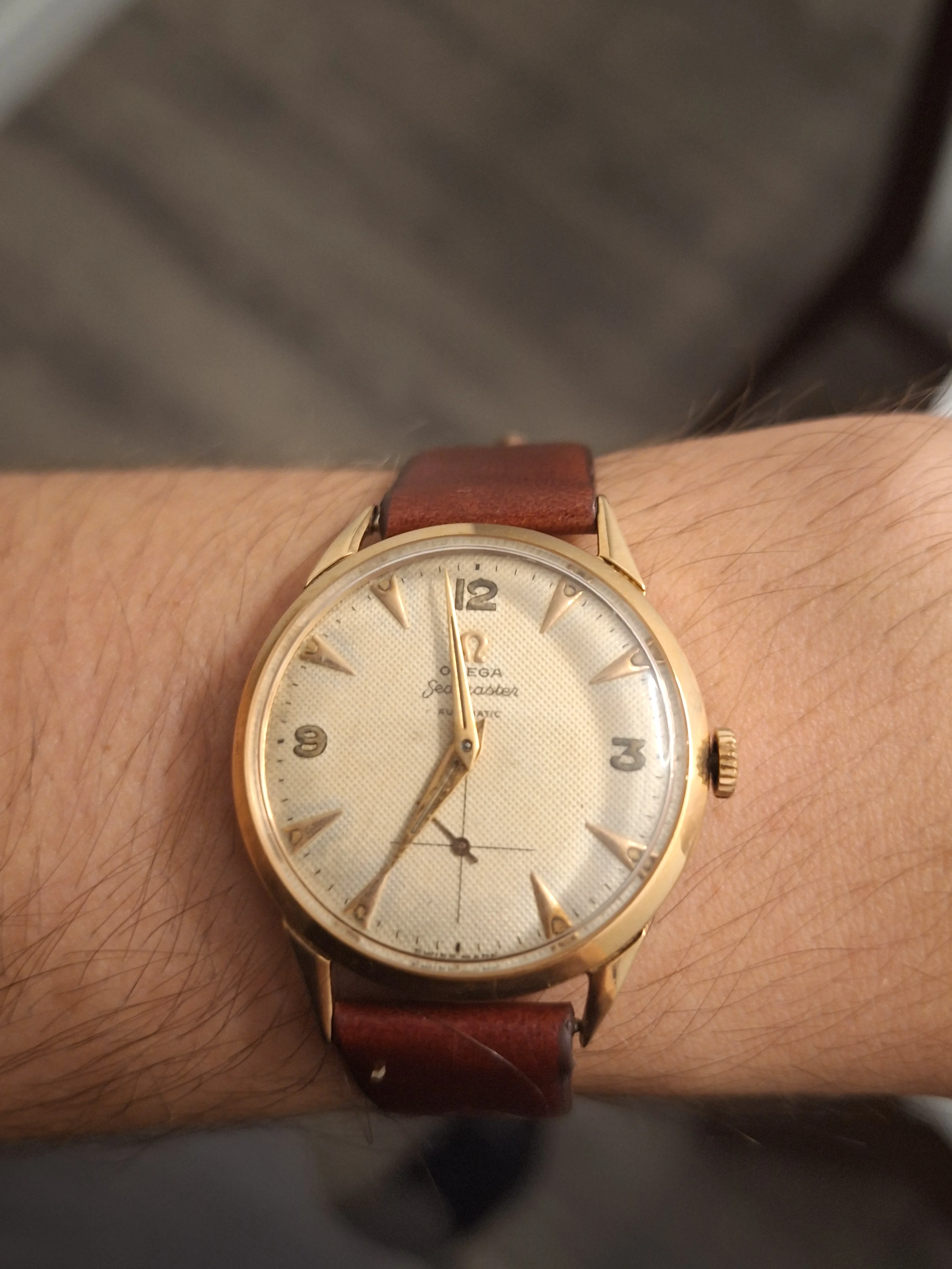 The gold is not an Omega case. Made case for an orphan movement.. most current and even some listed OEM are gold plated. You need to find older gold cap or gold filled which can be difficult