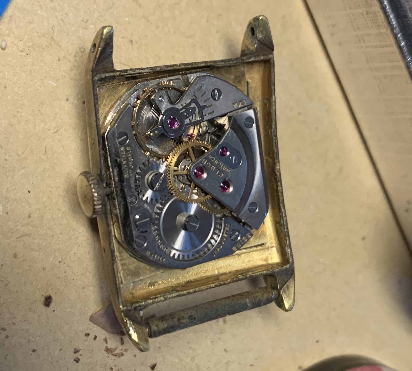 One thing not shown in the listing, although there may be hints of it, is the case was over polished. Looks like all the way down to the brass (Unless this is supposed to be gold plating, but then all those beautiful grooves are polished away (one can see a hint of them.) Depending on the lighting the bezel reflects differently. (Silver and gold are not the right terms, white metal and brass tone is probably more accurate.