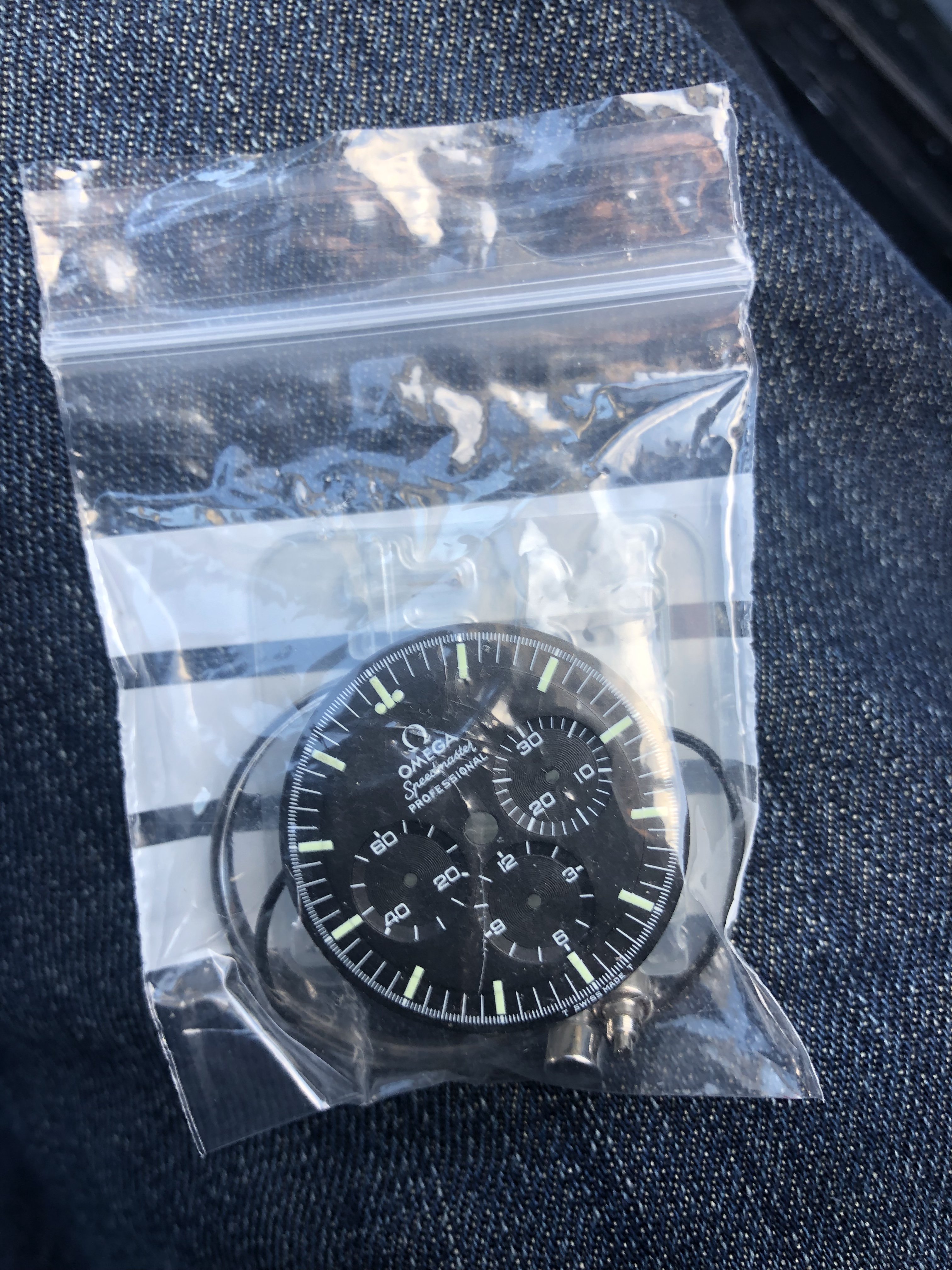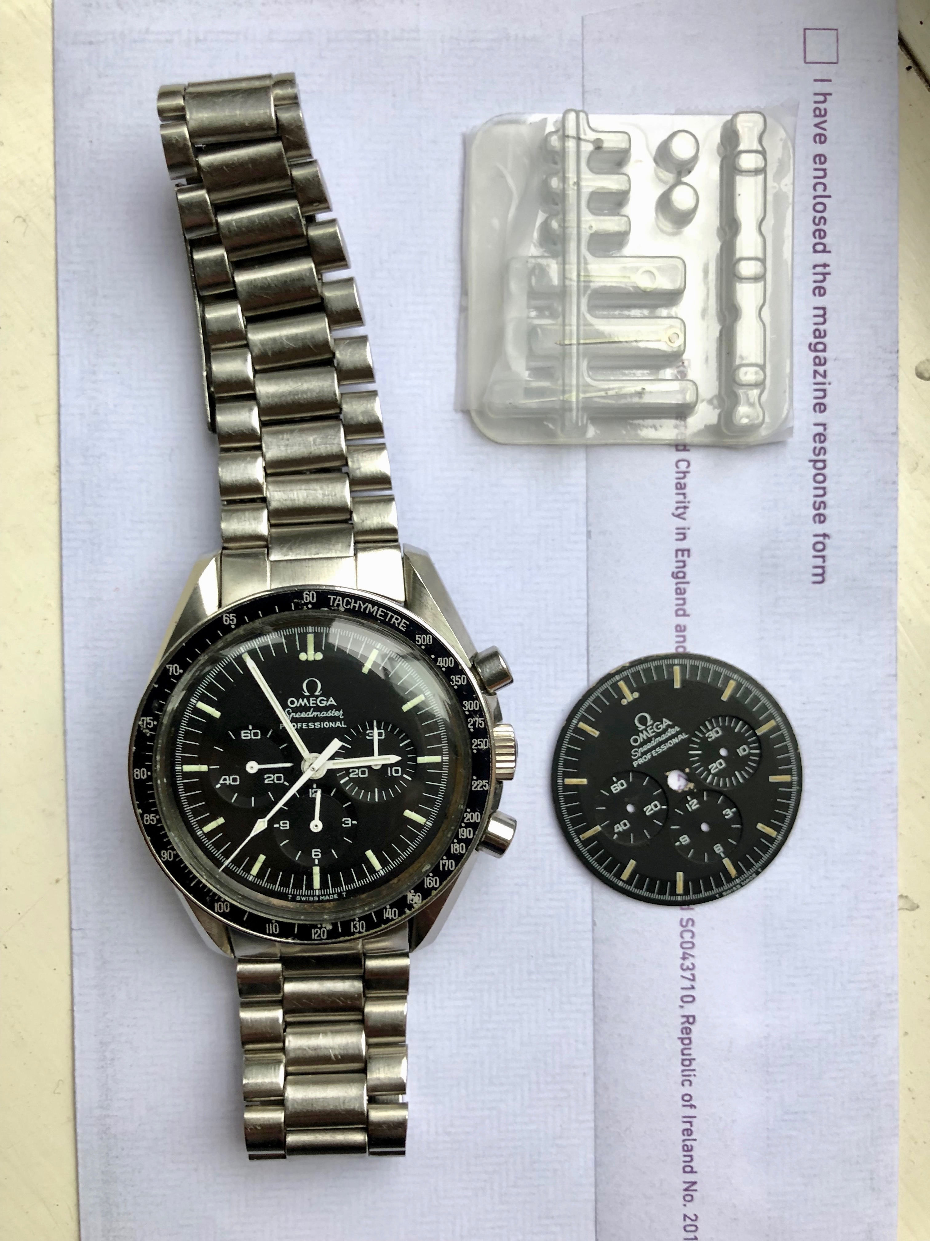 Anyway, my watchmaker is thinking of using double sided tape to secure it but is concerned about the clearance of one of the chrono sub-register hands (the hour one, I think). So ideally I want a 145.022 861 Tritium dial. But hopefully the temporary and somewhat suboptimal solution will hold it well enough until one turns up. Any idea how easy it will be to find one? And what I'd be likely to pay? I'd prefer "vanilla" to "mint" on the lume. If it's too much money I'll just live with the tape; at least I'll know it there and there's more no nasty surprises down the line.