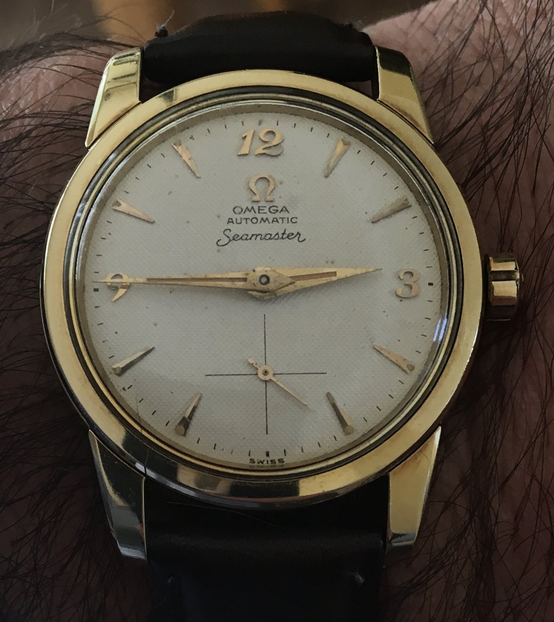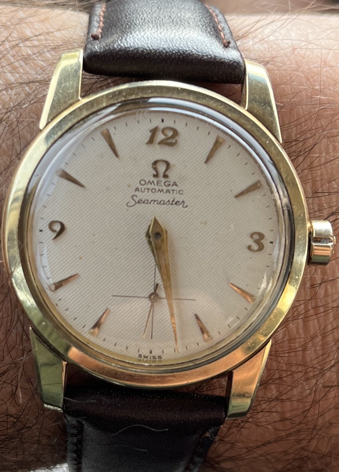 ·Can anyone help ID my Omega watch that was passed down to me from my grandfather? I have looked everywhere and have never seen another like it. It has a textured linen type dial and says “Swiss” and not “Swiss Made” and the numerals appear to have a different font than most I’ve seen. It is also having some running issues and appears to stop then start again. I’d like to get it serviced. John