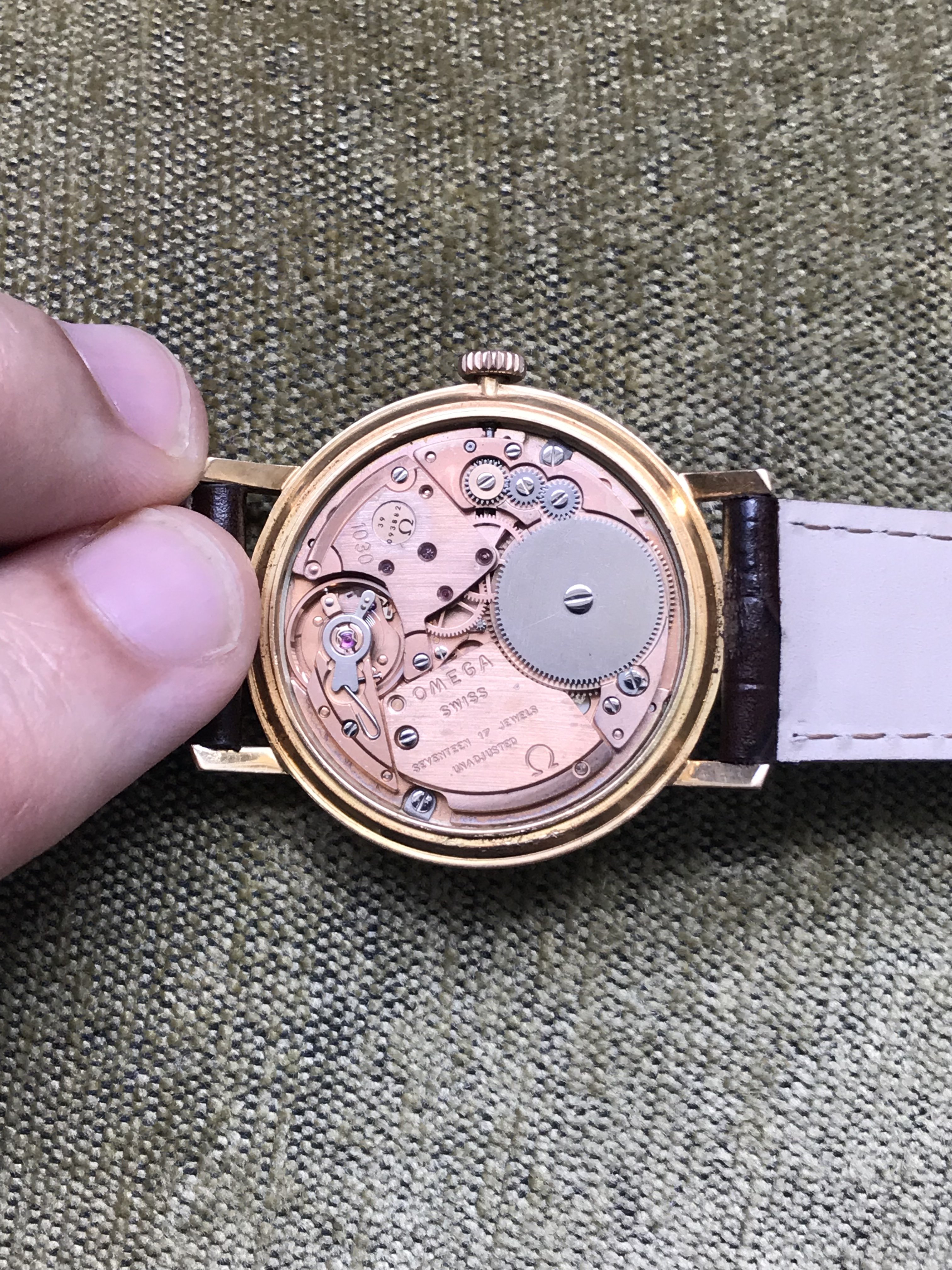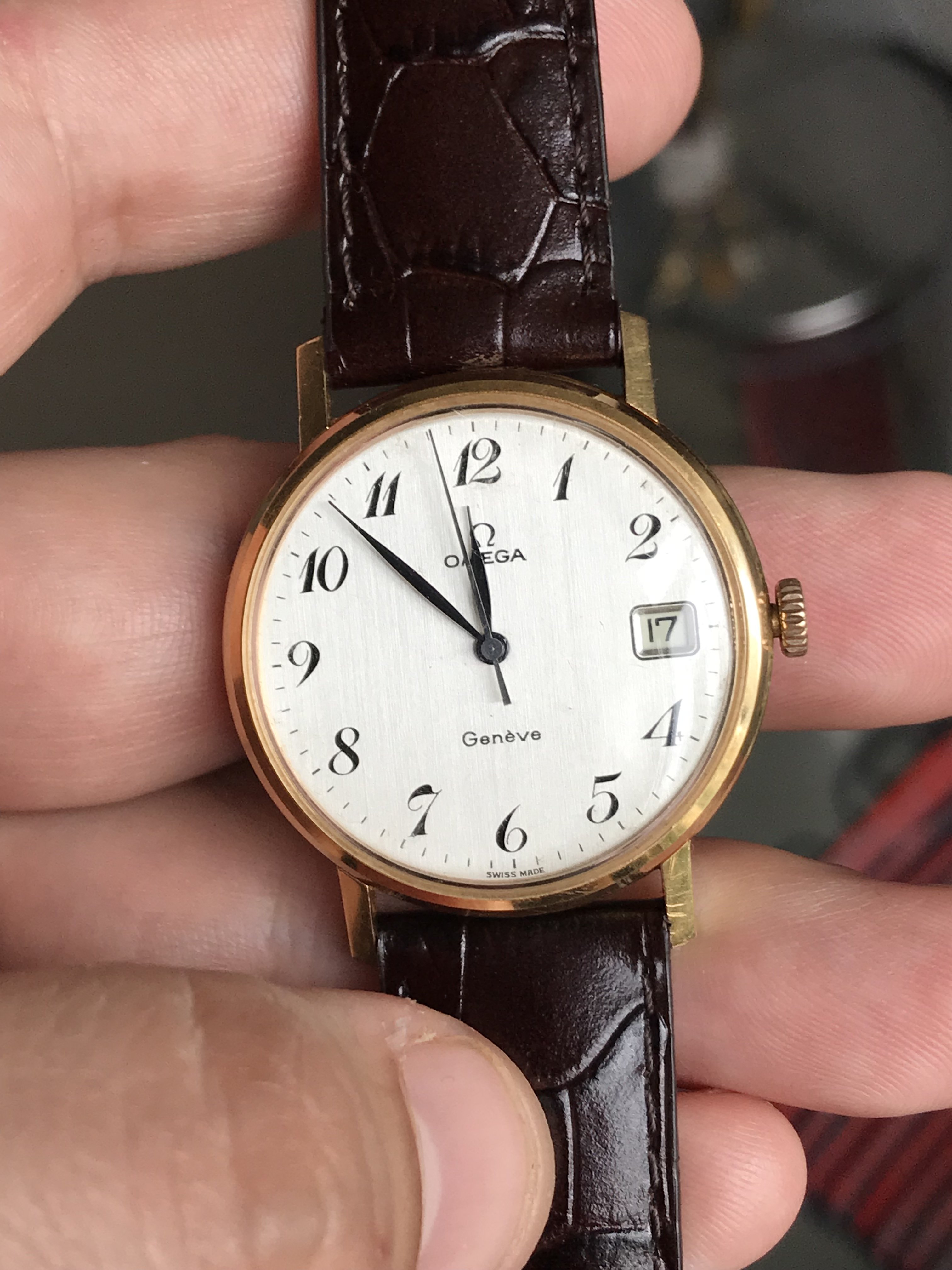 ·I inherited this watch from one of my father’s aunt about 15 years ago. It was a gift from the company her husband worked for. It was purchased in 1978, but it looks a 1975 geneve model. It has 34mm width, a 1030 caliber and a not so usual dial with arabic numerals. I don’t know the exact model nr. Not sure if it is a gold case or gold plated. I use it as a dress watch sometimes.
