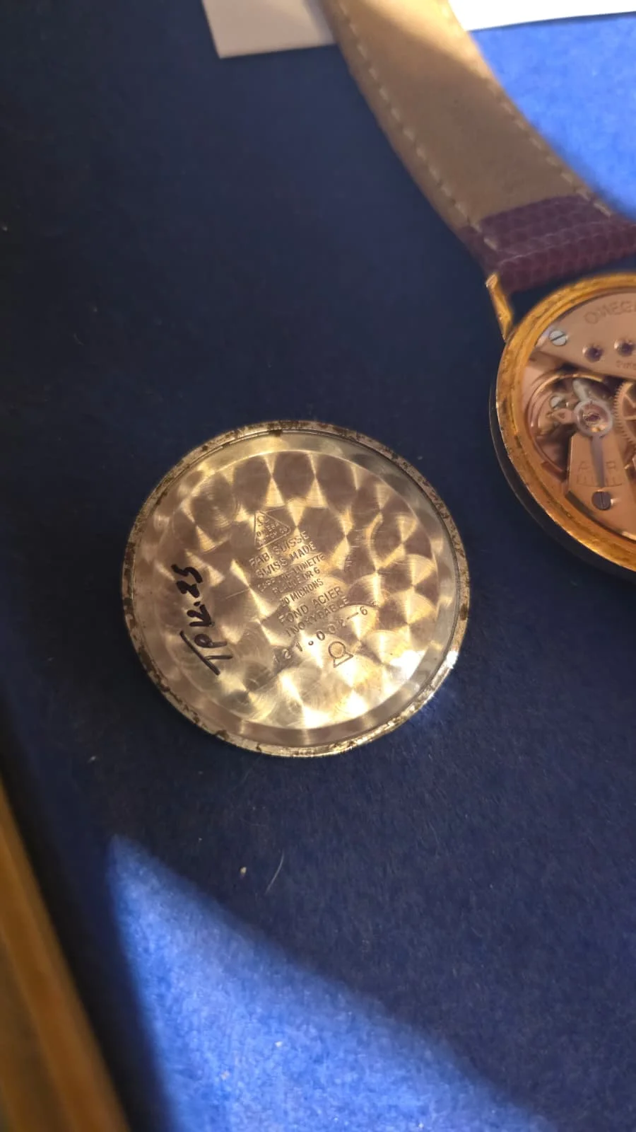The watch is an Omega my grandfather received during his police service at Quirinale (the Italian President's headquarters). It also has the President's signature on the back, Antonio Segni, that was in charge between 1962 and 1964.