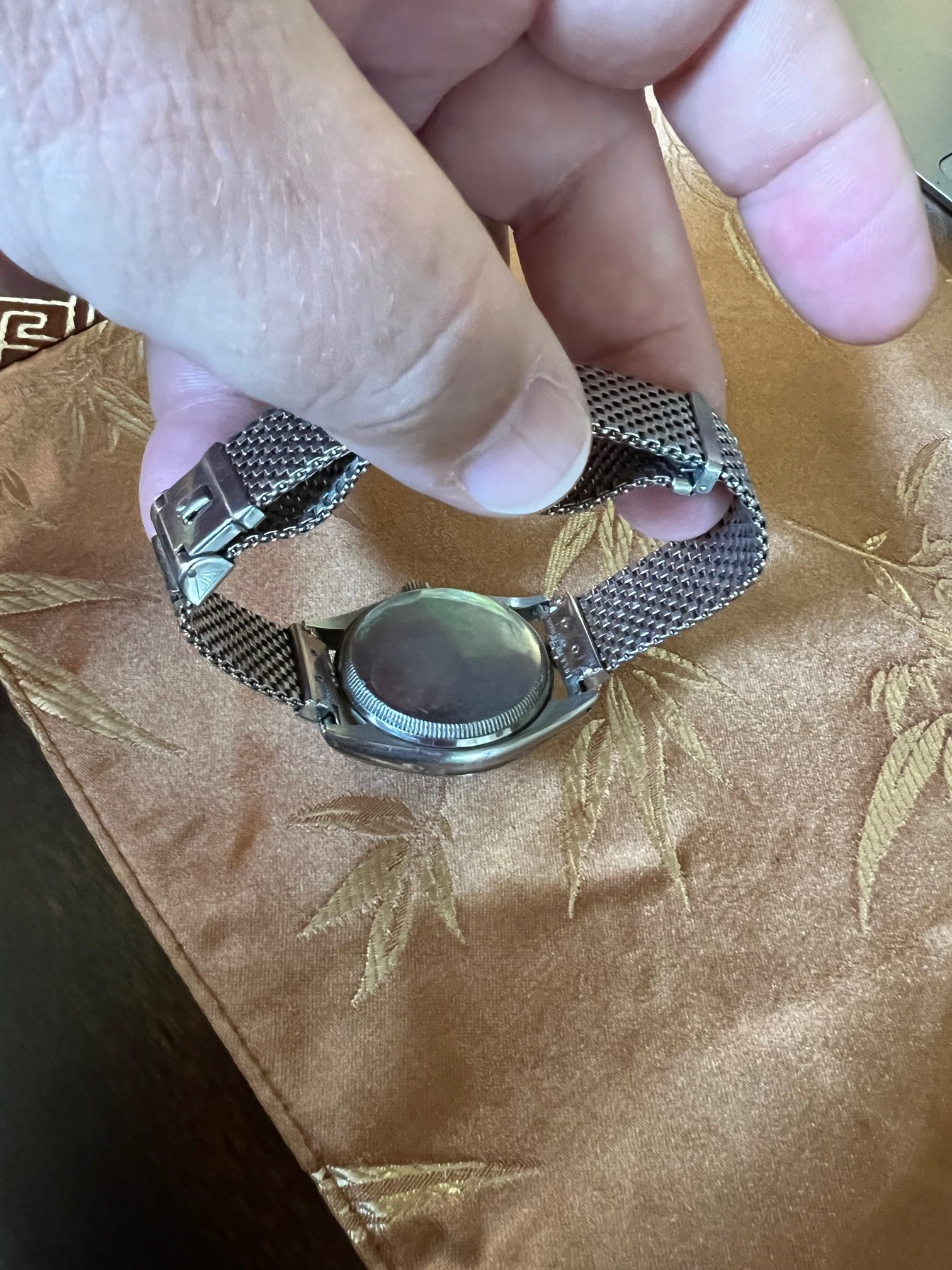 Compared to my Speedmaster it seems tiny, perhaps 34mm across, and is mounted on an unusual mesh band (no idea if the band is stock or aftermarket). It is believed that my stepfather bought the watch in either Switzerland or France in the late '40-mid '50s.