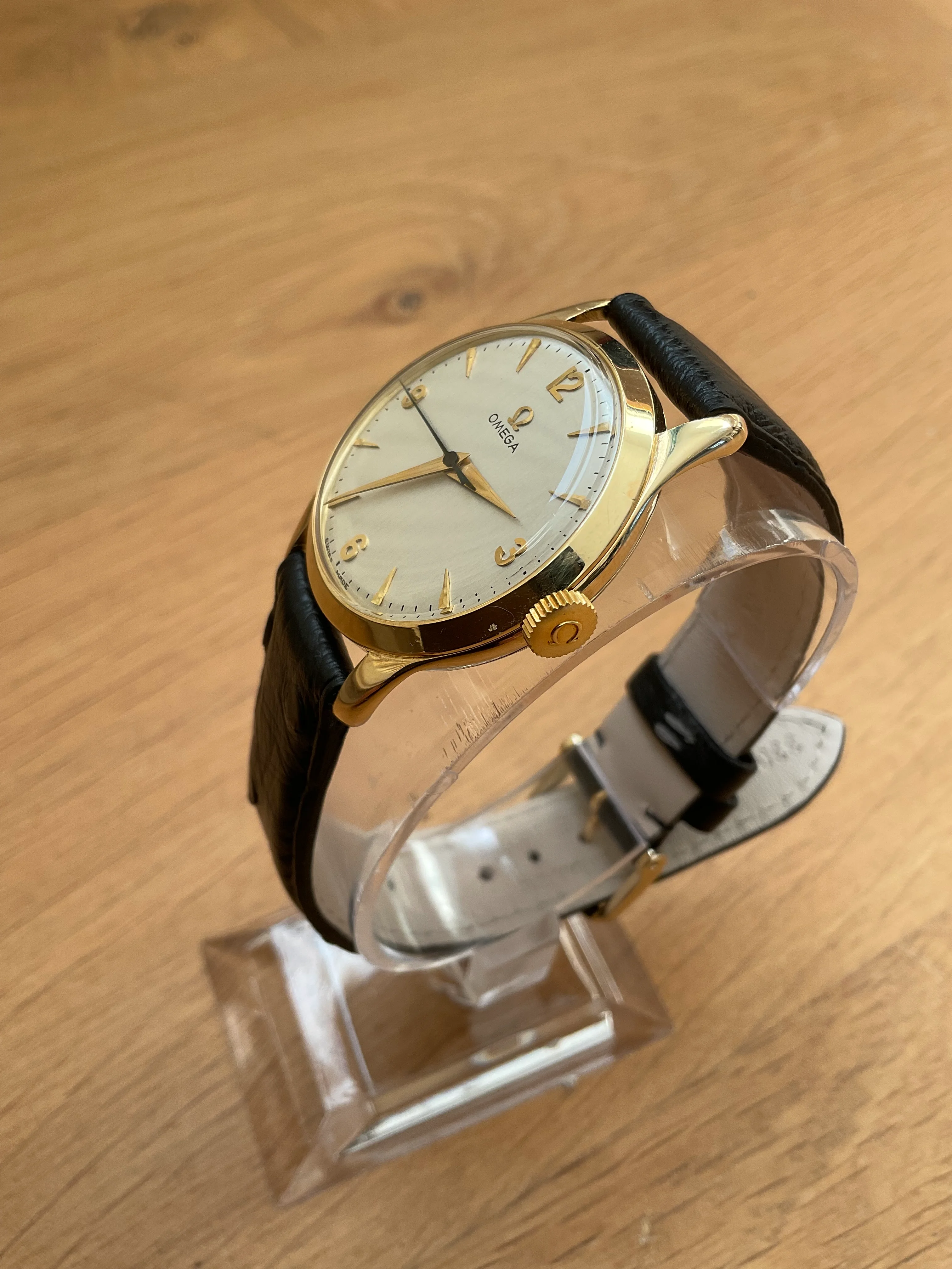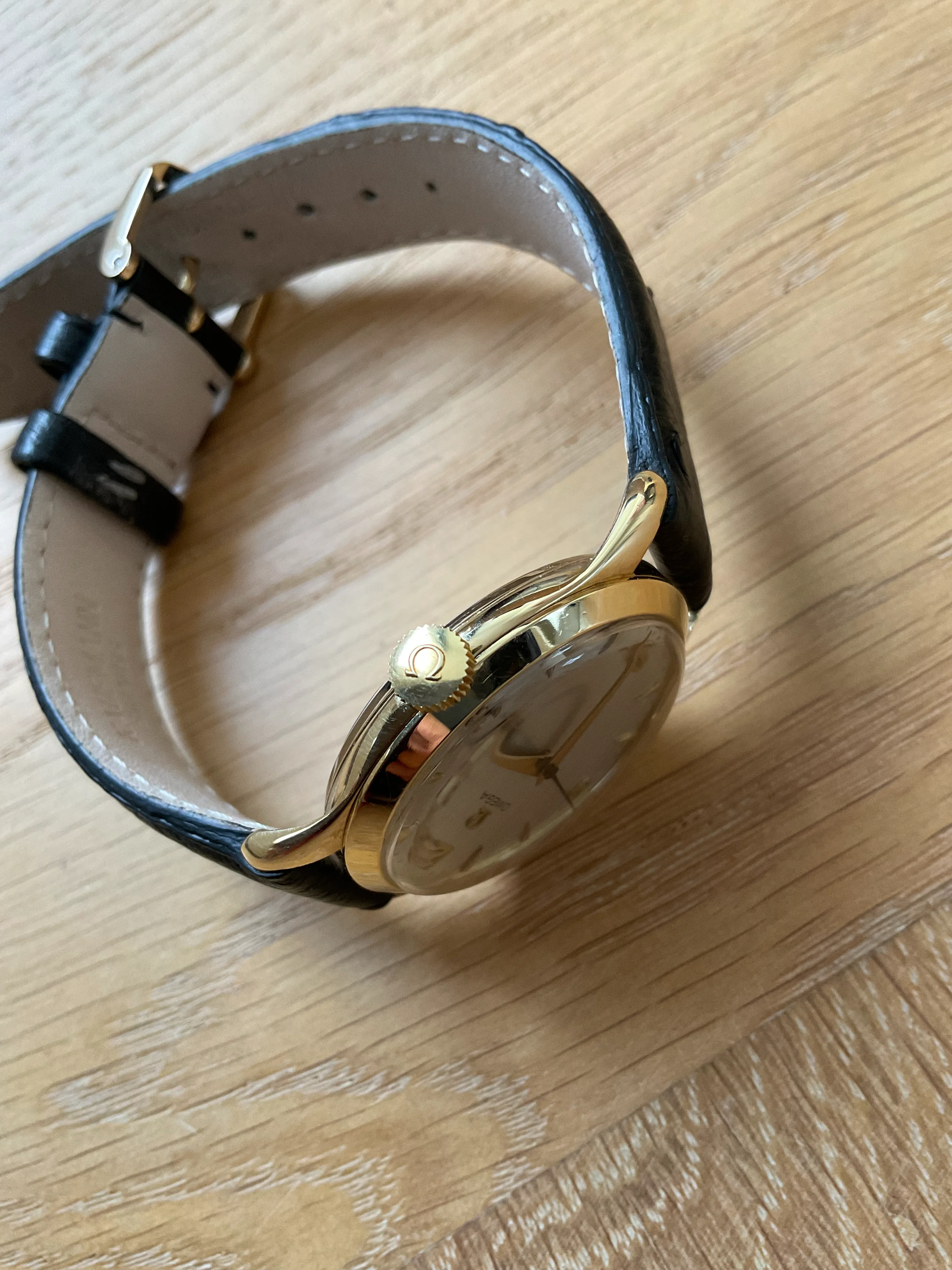 The case is 14K yellow gold, measuring 32mm, and it’s in fantastic condition, showing no signs of over-polishing. The dial is in remarkable shape—so perfect and stunning that I’m wondering if it could be a re-dial, possibly carried out by Omega with authentic parts.
