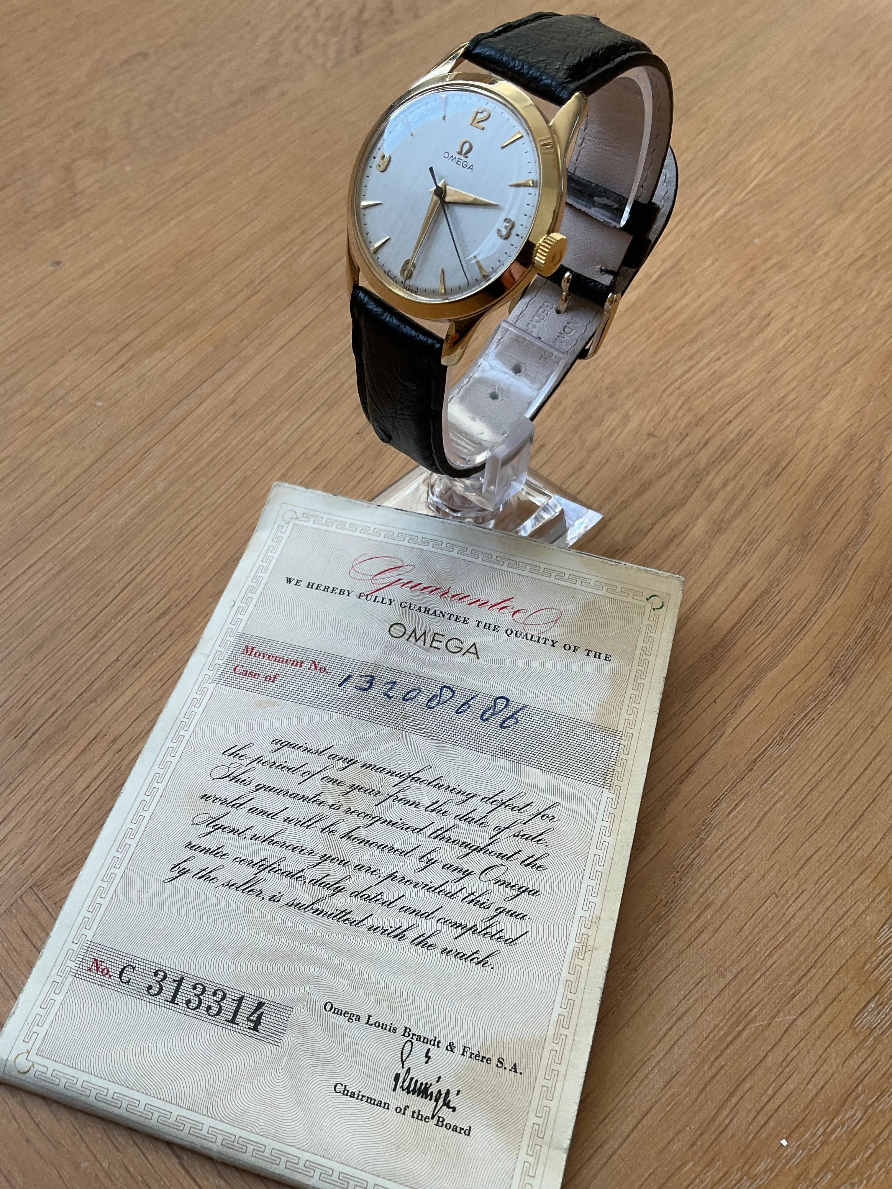 The movement is an Omega Caliber 420, and after servicing, it’s running well within the expected timekeeping range. The serial number on the movement also appears to matche the handwritten details on the paperwork.