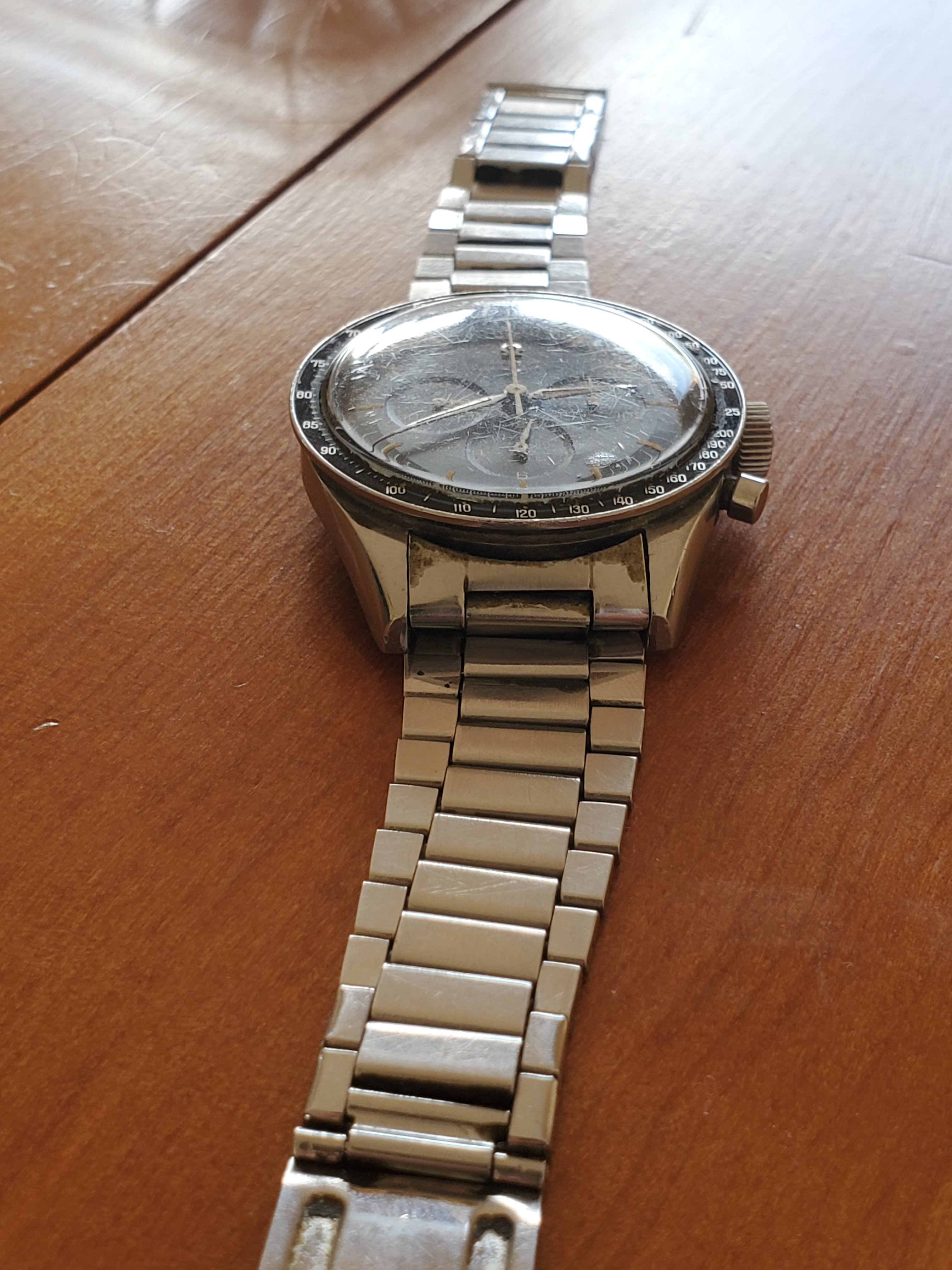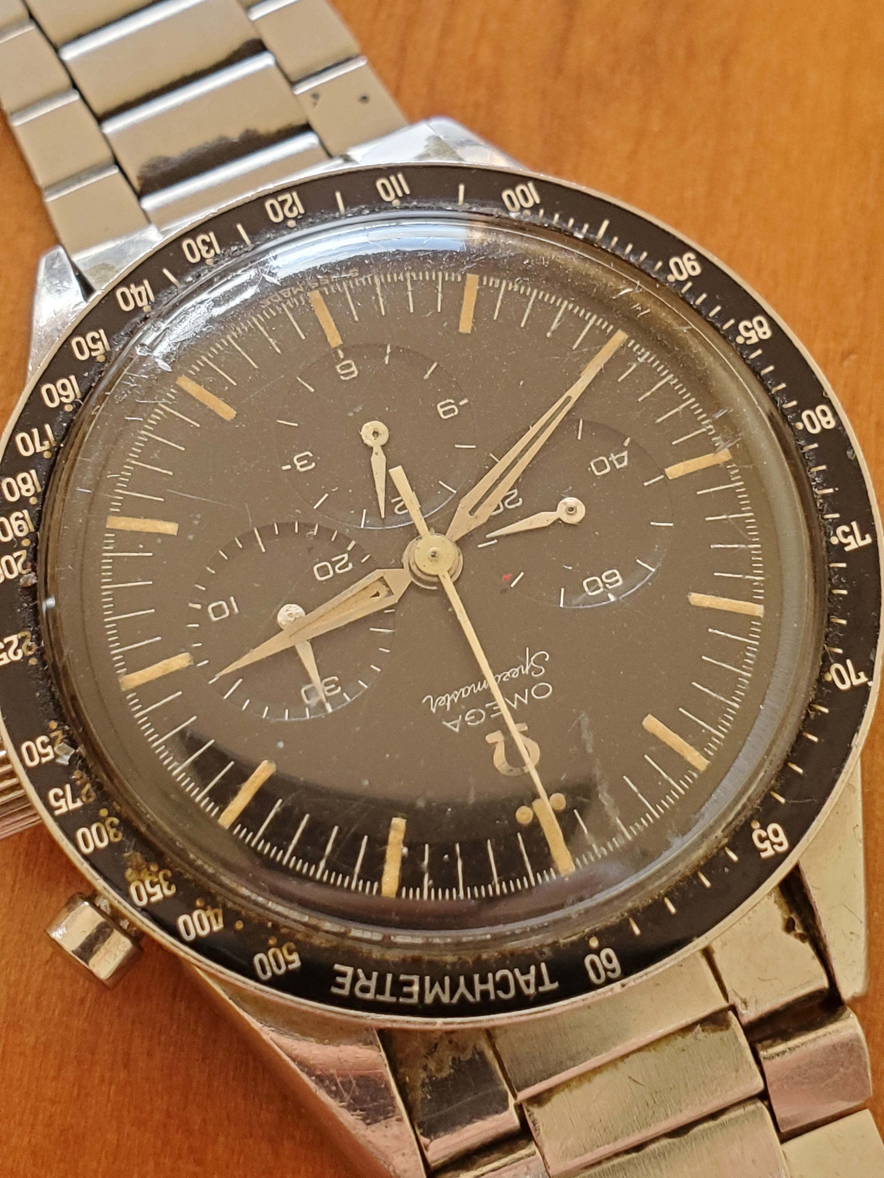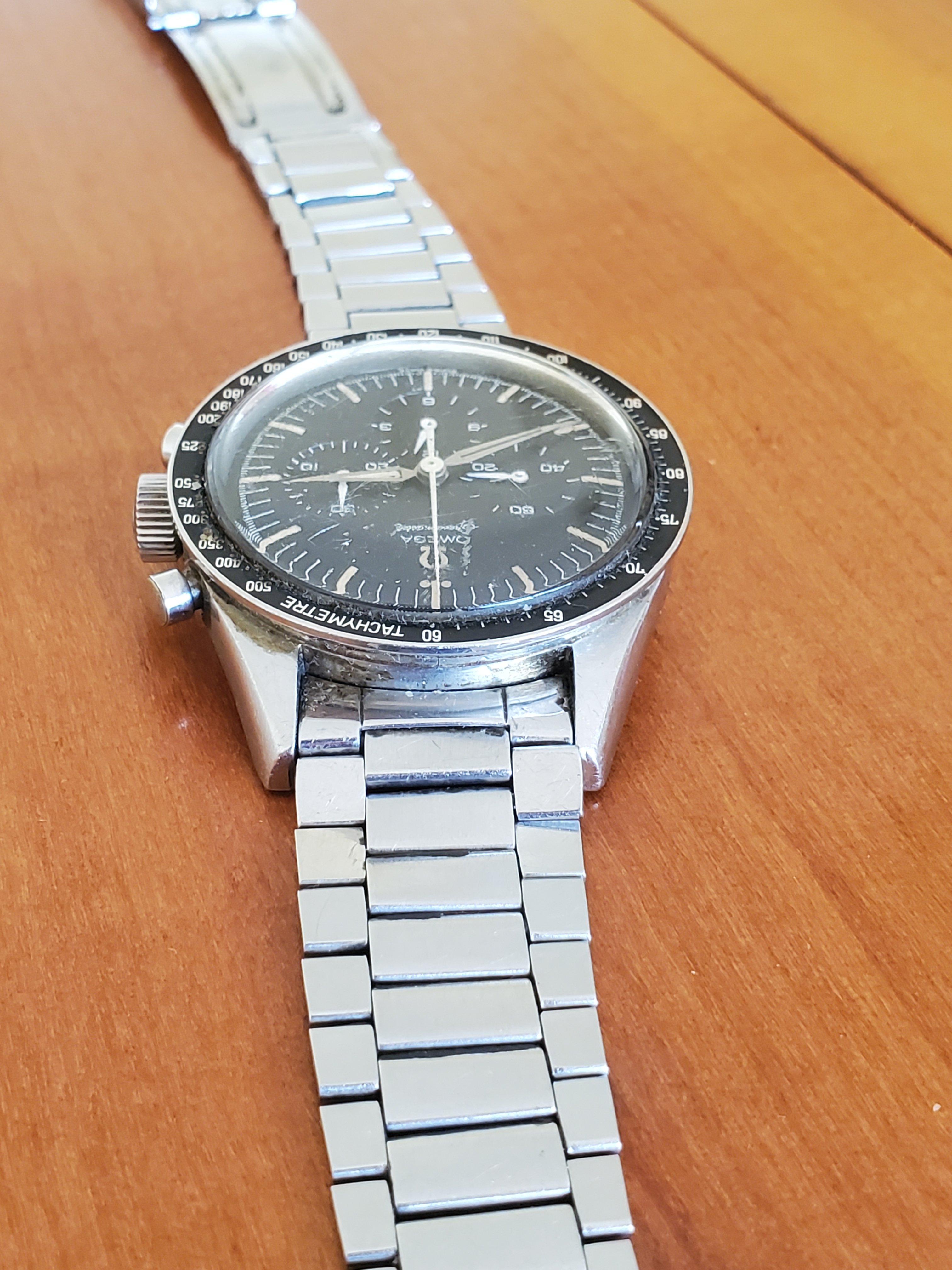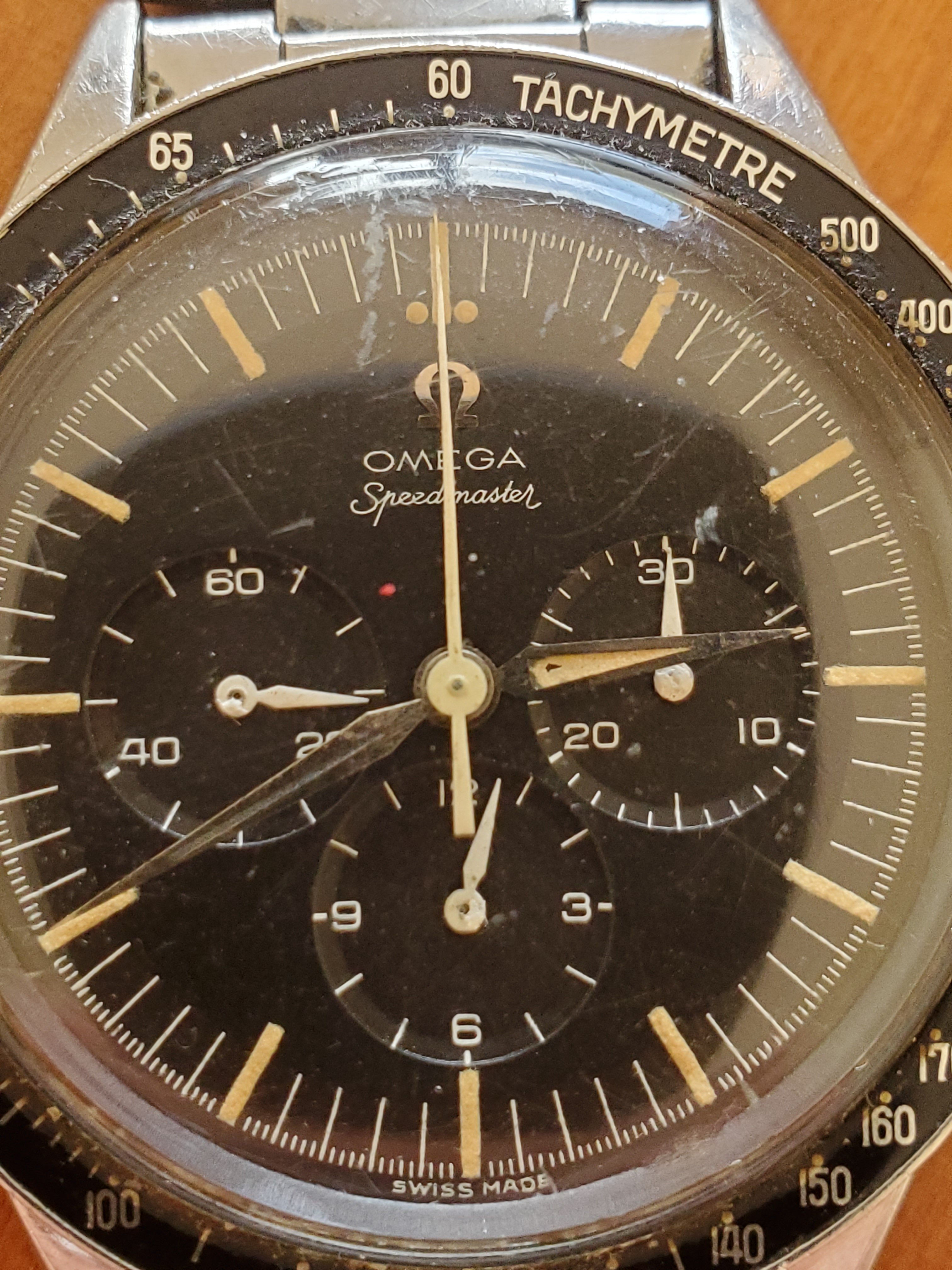 What you can help us with: Your thoughts on the lack of Base 1000 bezel, thoughts on the scratched numbers- does this indicate servicing? Thoughts on condition, rarity and possible value of this Speedmaster, and what steps we should take to ensure the value and condition of this beauty?