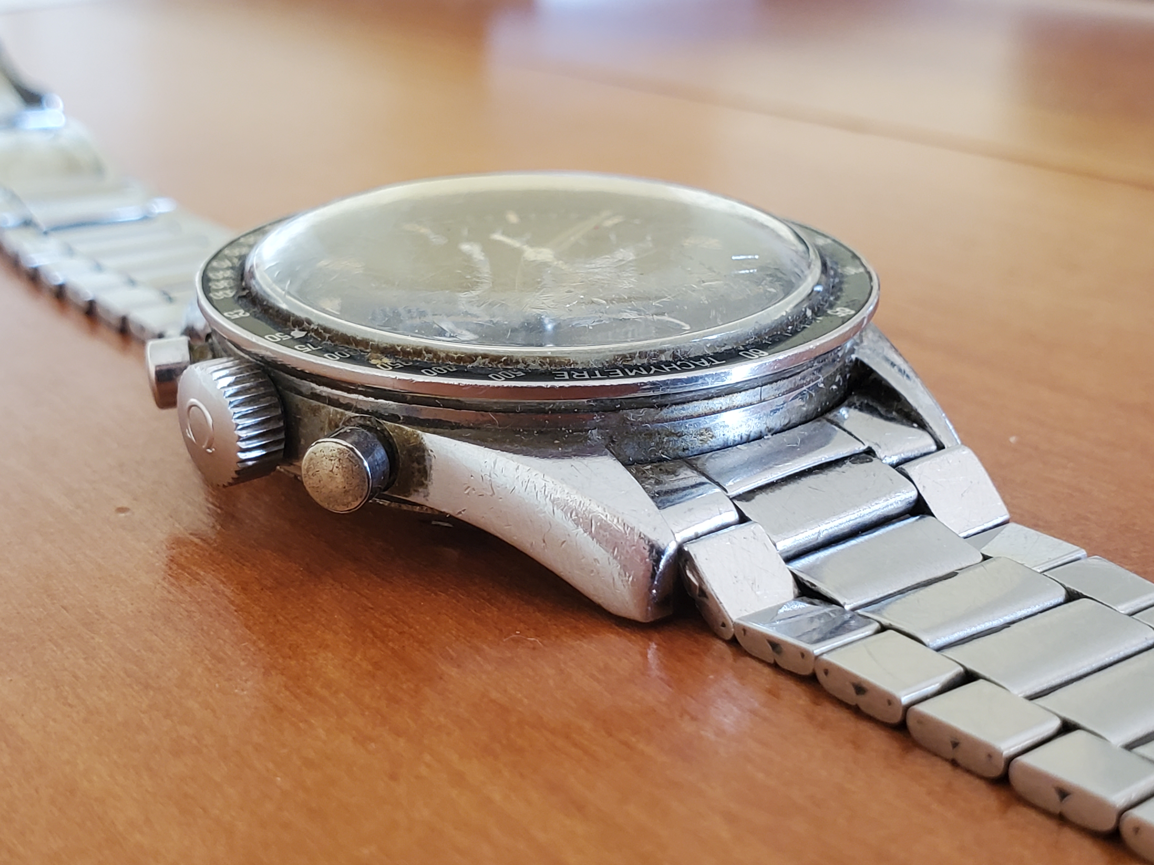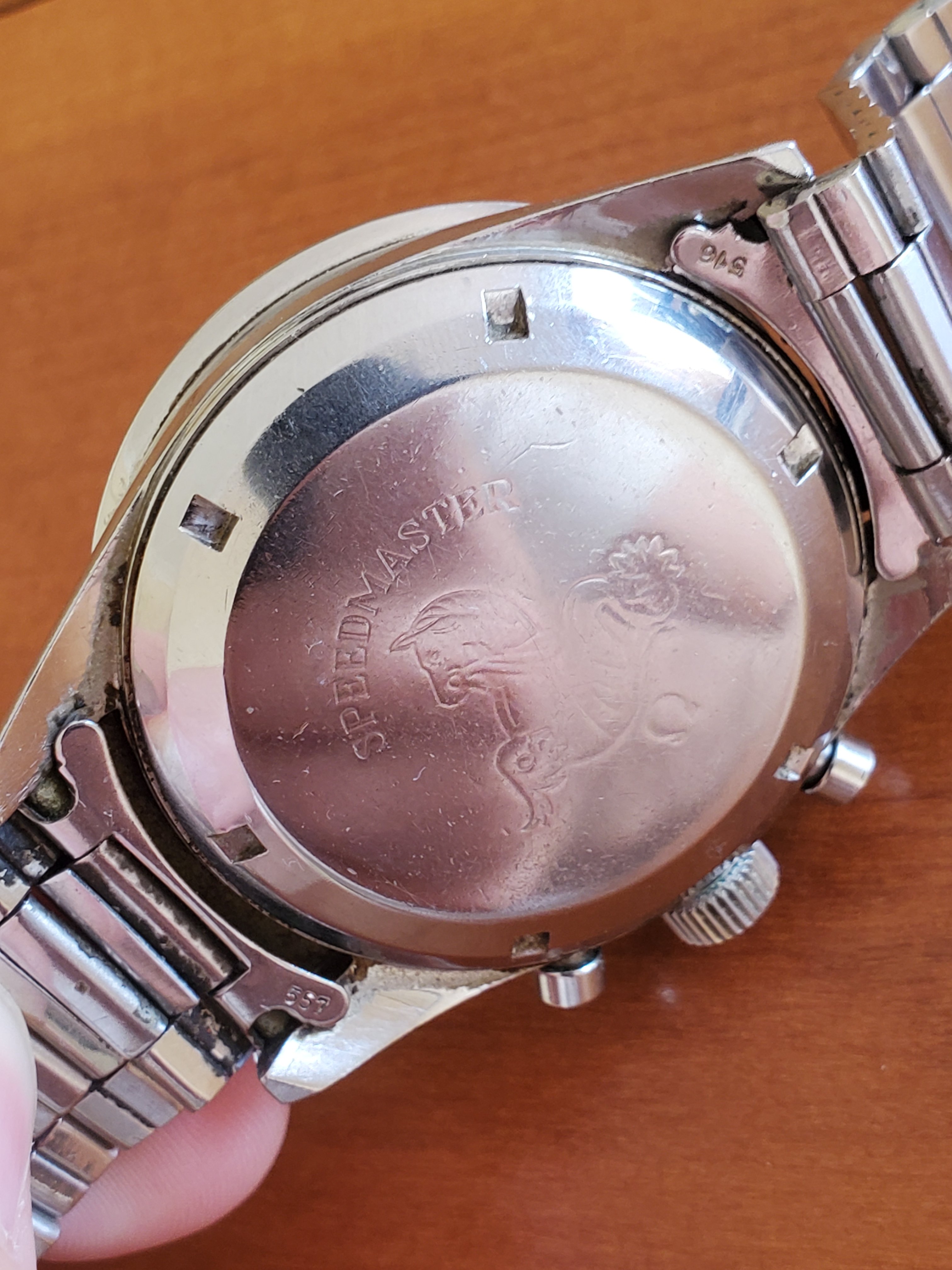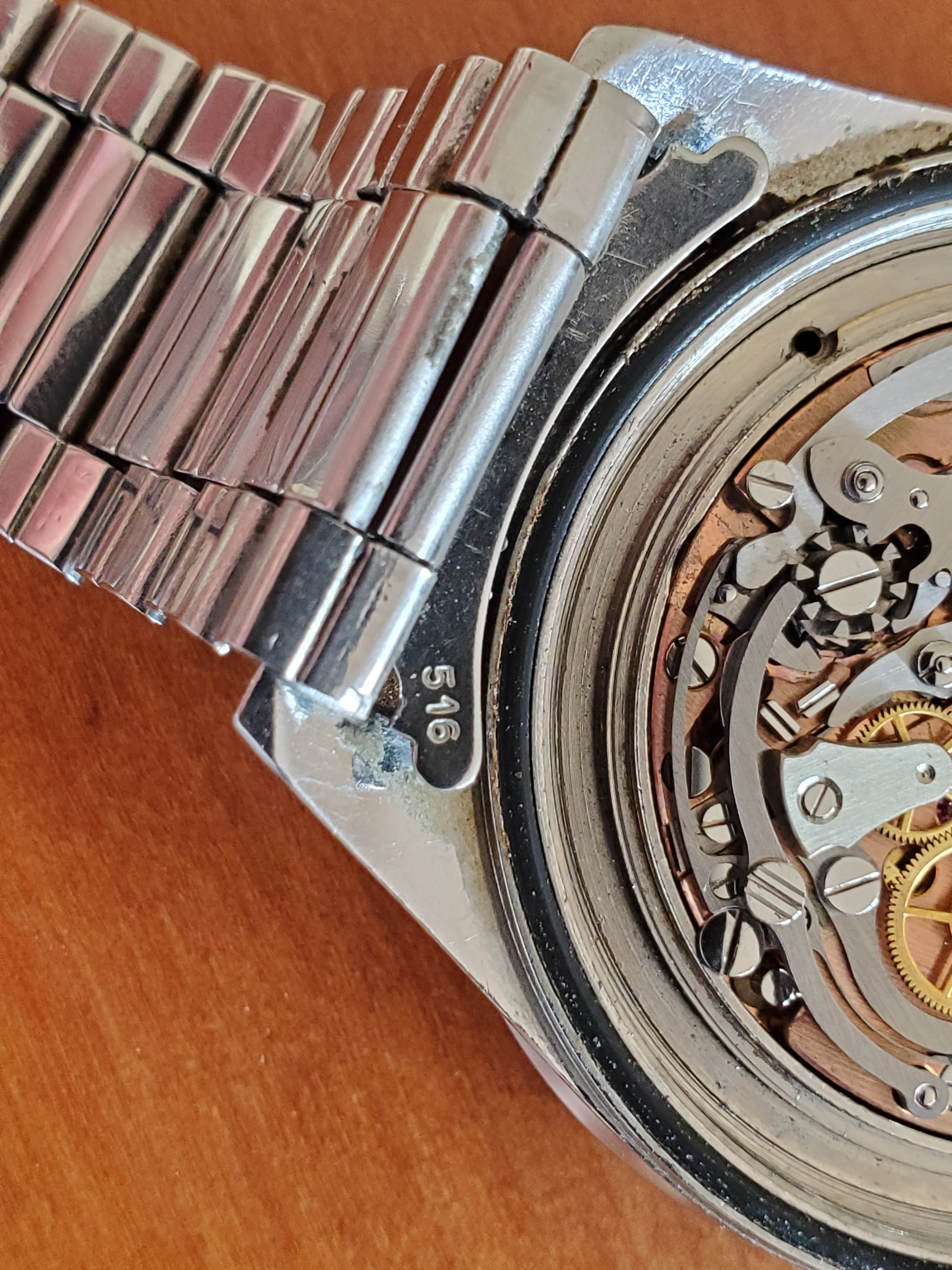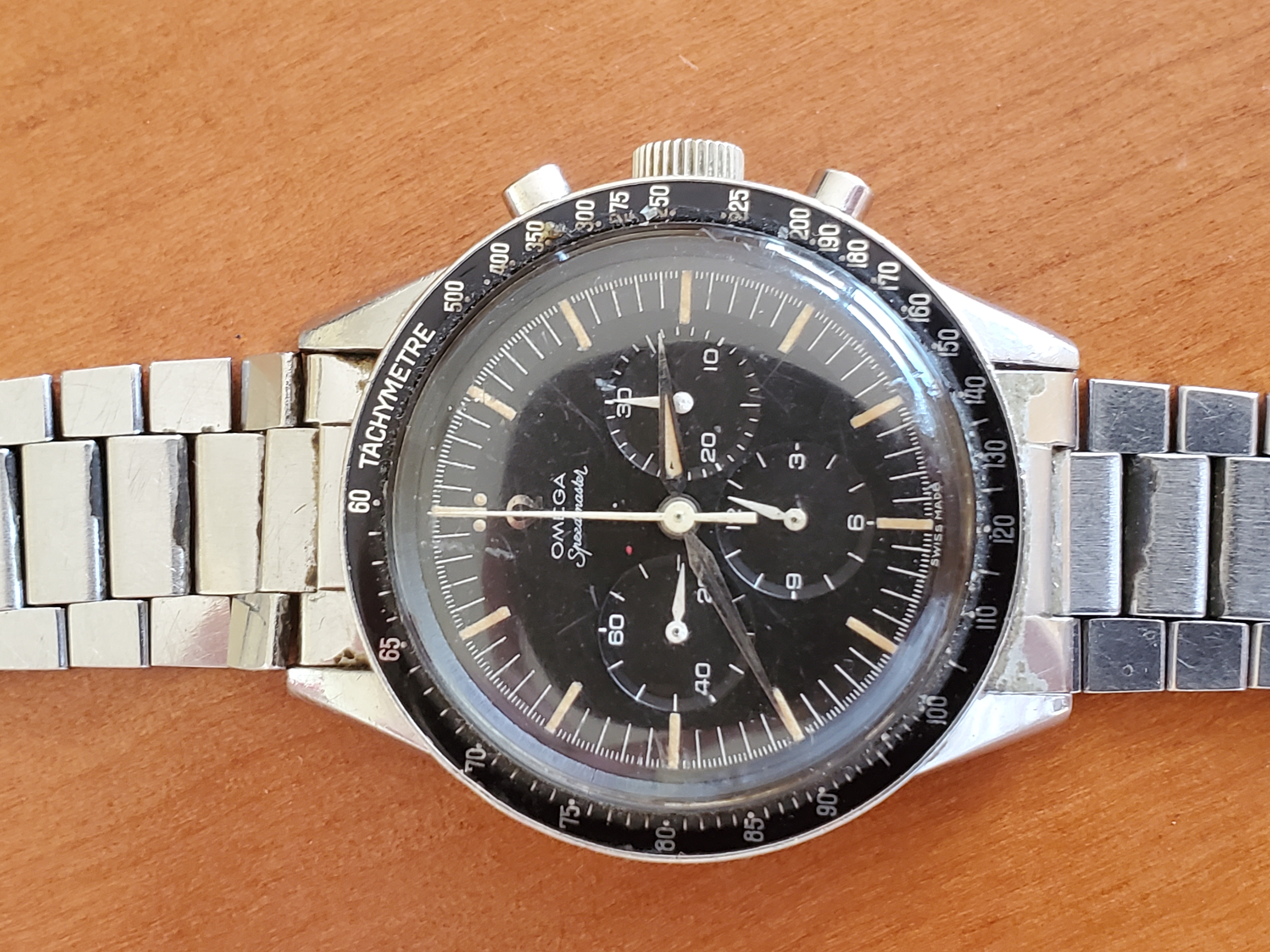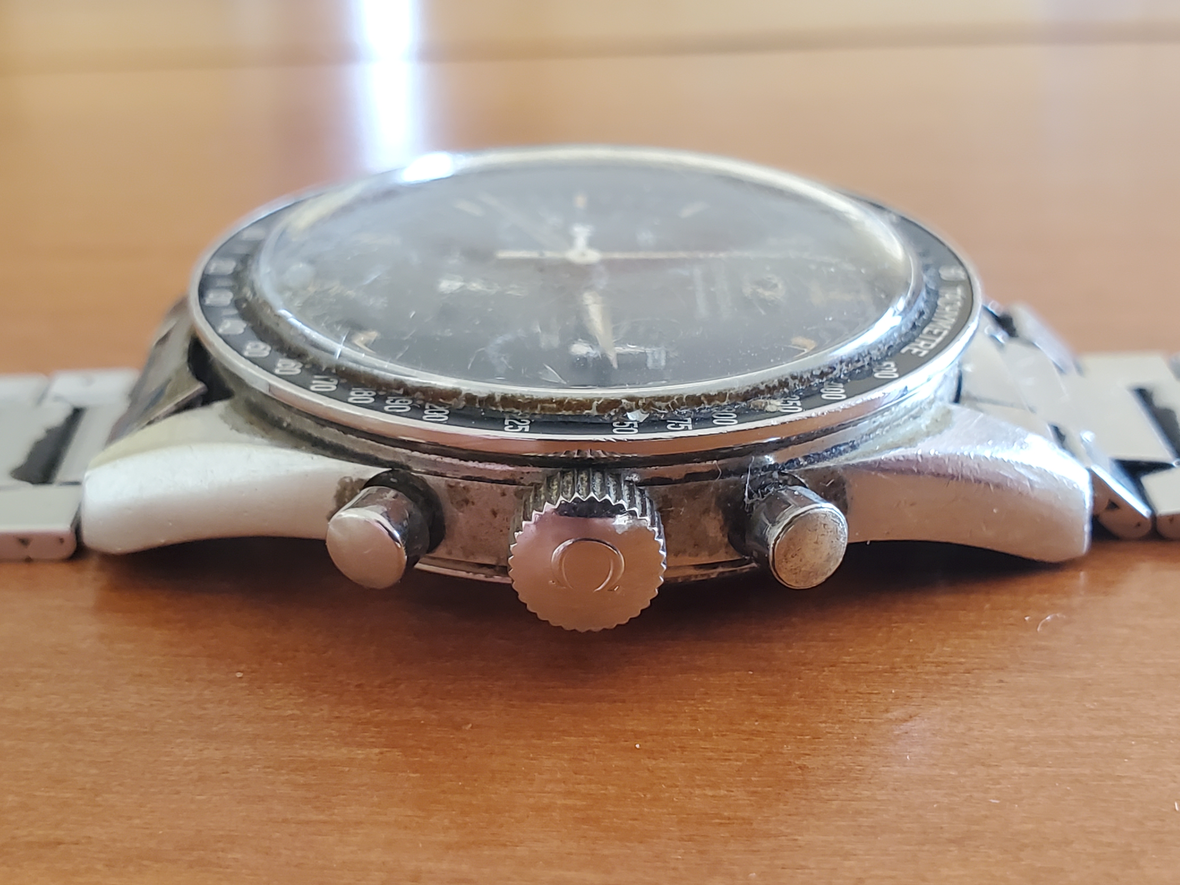 What you can help us with: Your thoughts on the lack of Base 1000 bezel, thoughts on the scratched numbers- does this indicate servicing? Thoughts on condition, rarity and possible value of this Speedmaster, and what steps we should take to ensure the value and condition of this beauty?