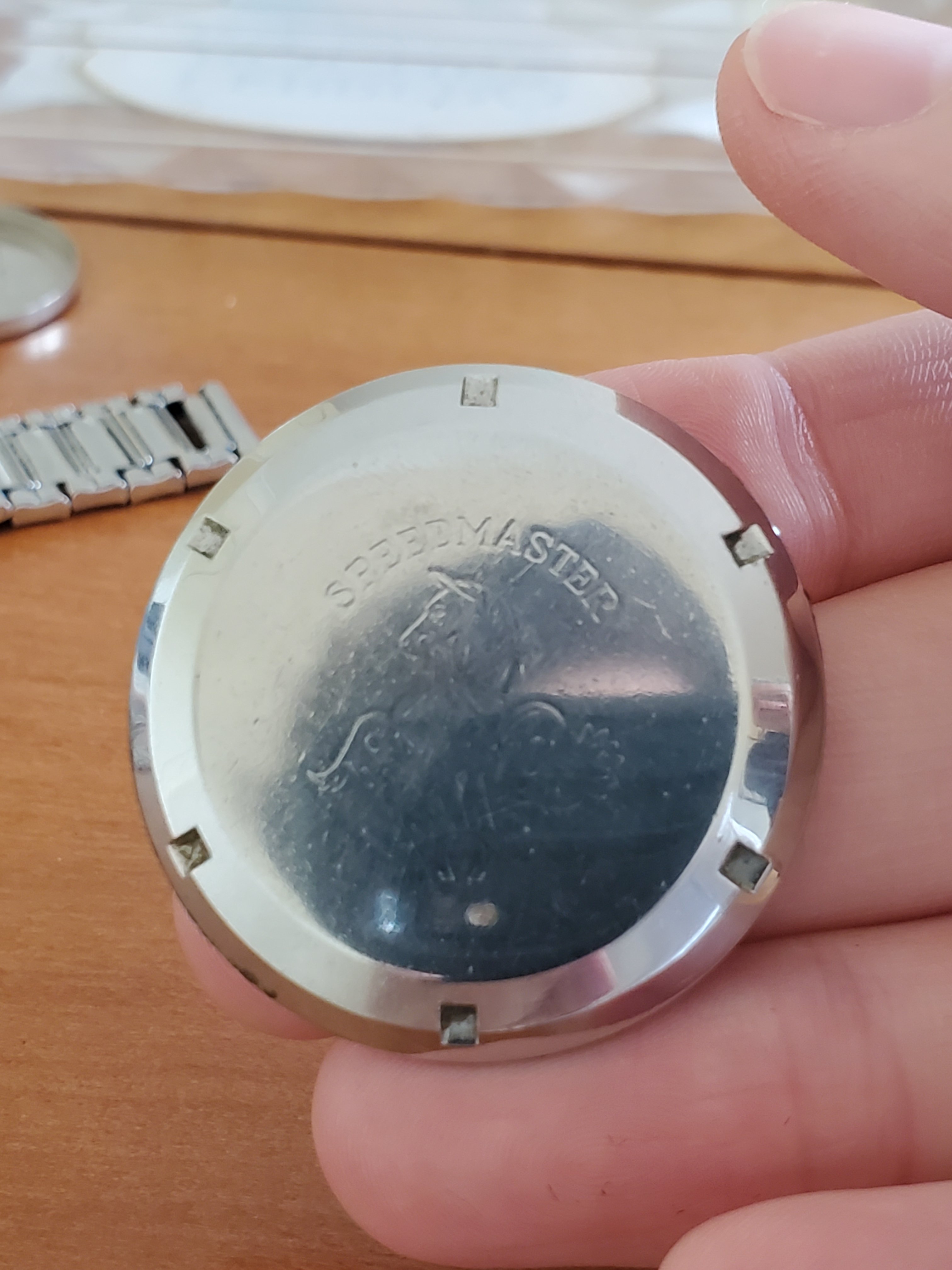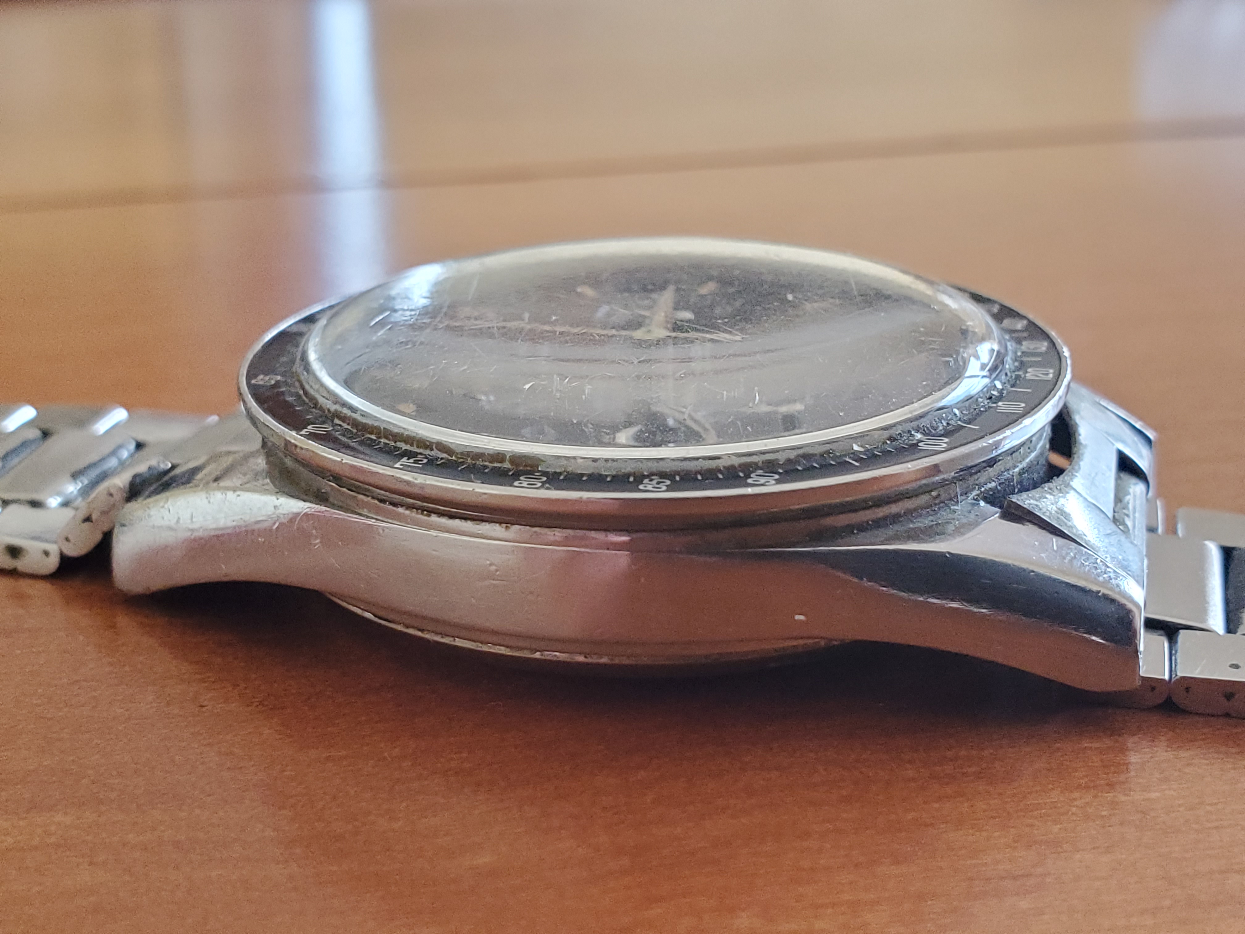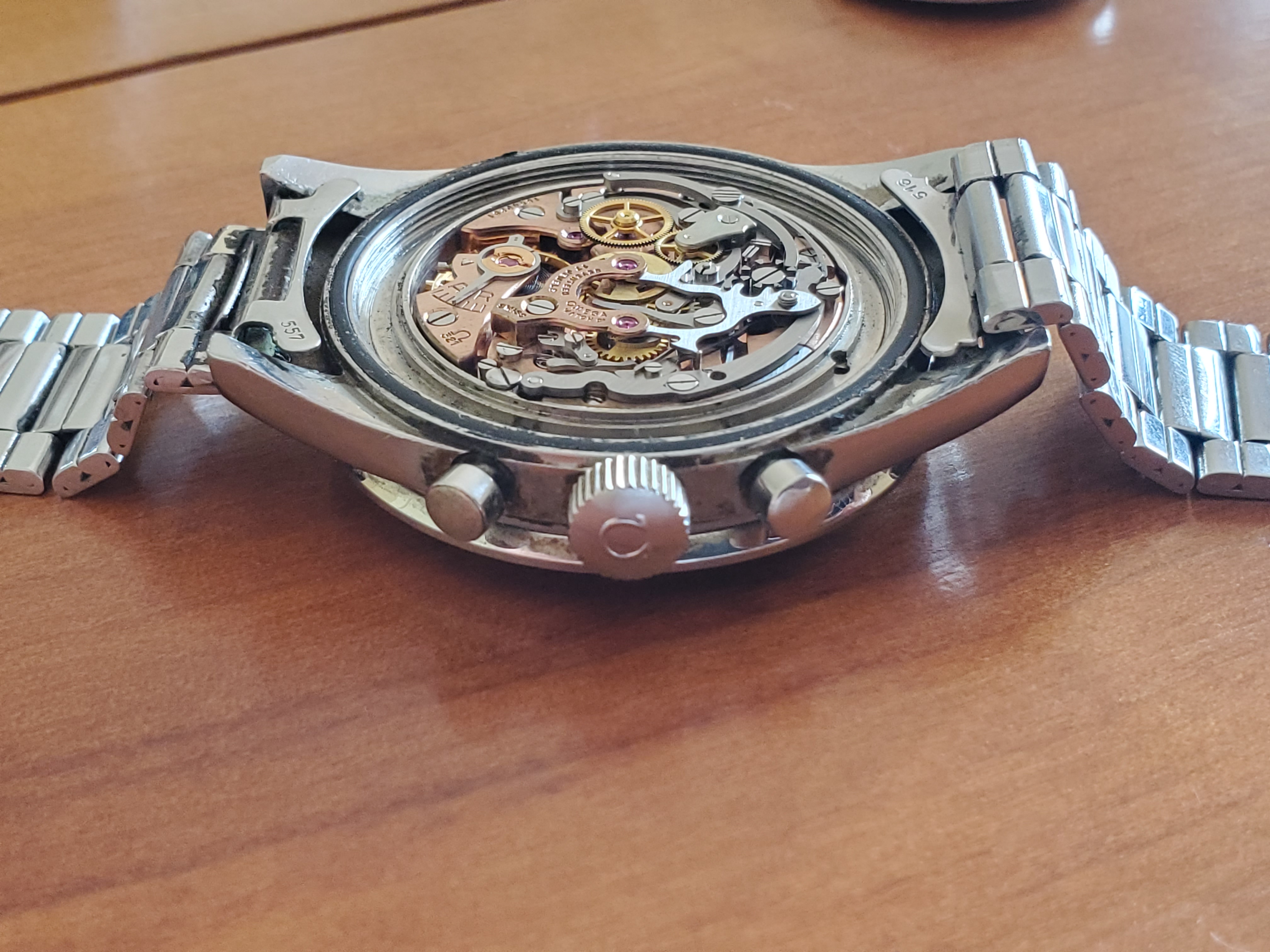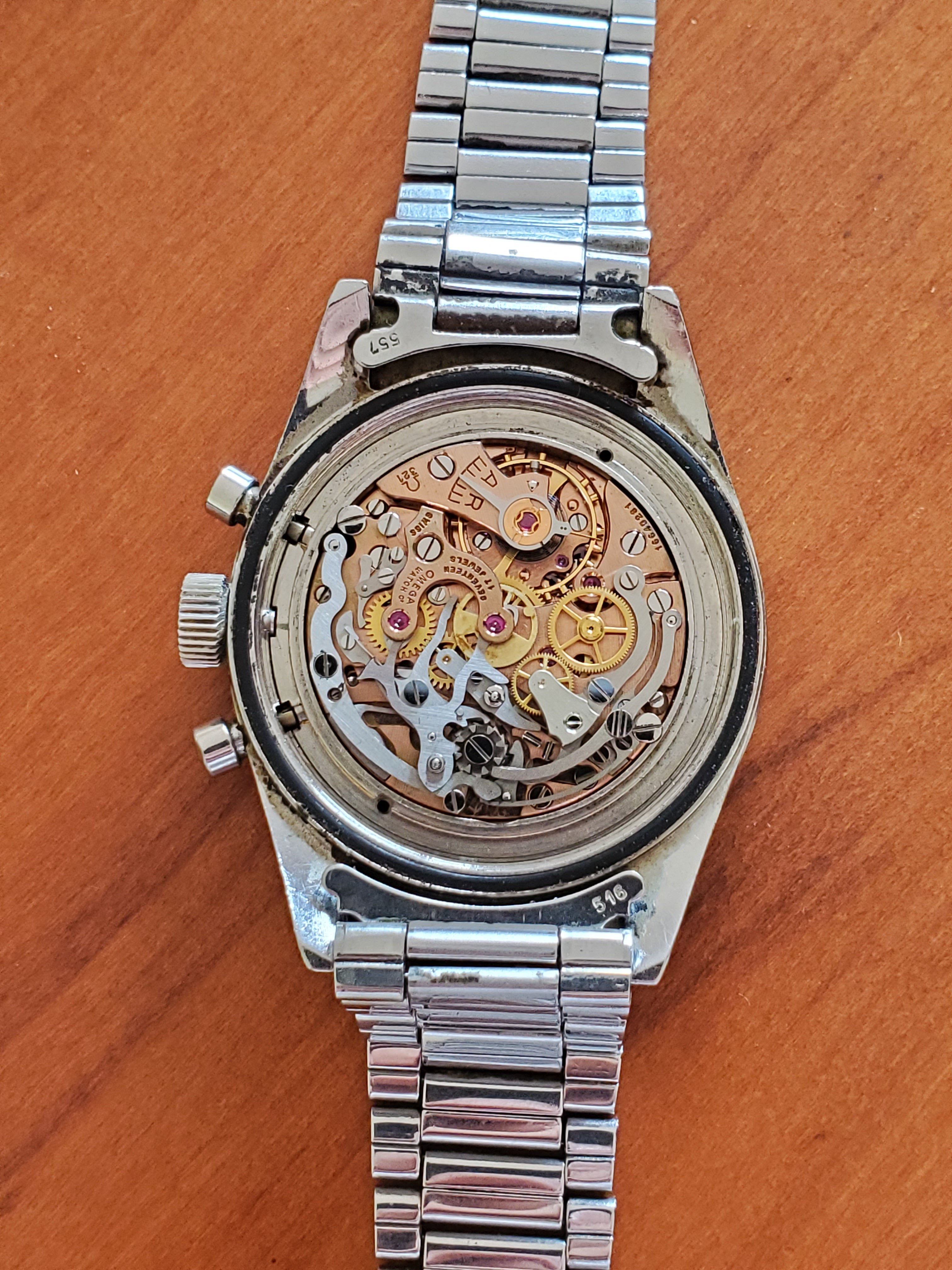 What you can help us with: Your thoughts on the lack of Base 1000 bezel, thoughts on the scratched numbers- does this indicate servicing? Thoughts on condition, rarity and possible value of this Speedmaster, and what steps we should take to ensure the value and condition of this beauty?