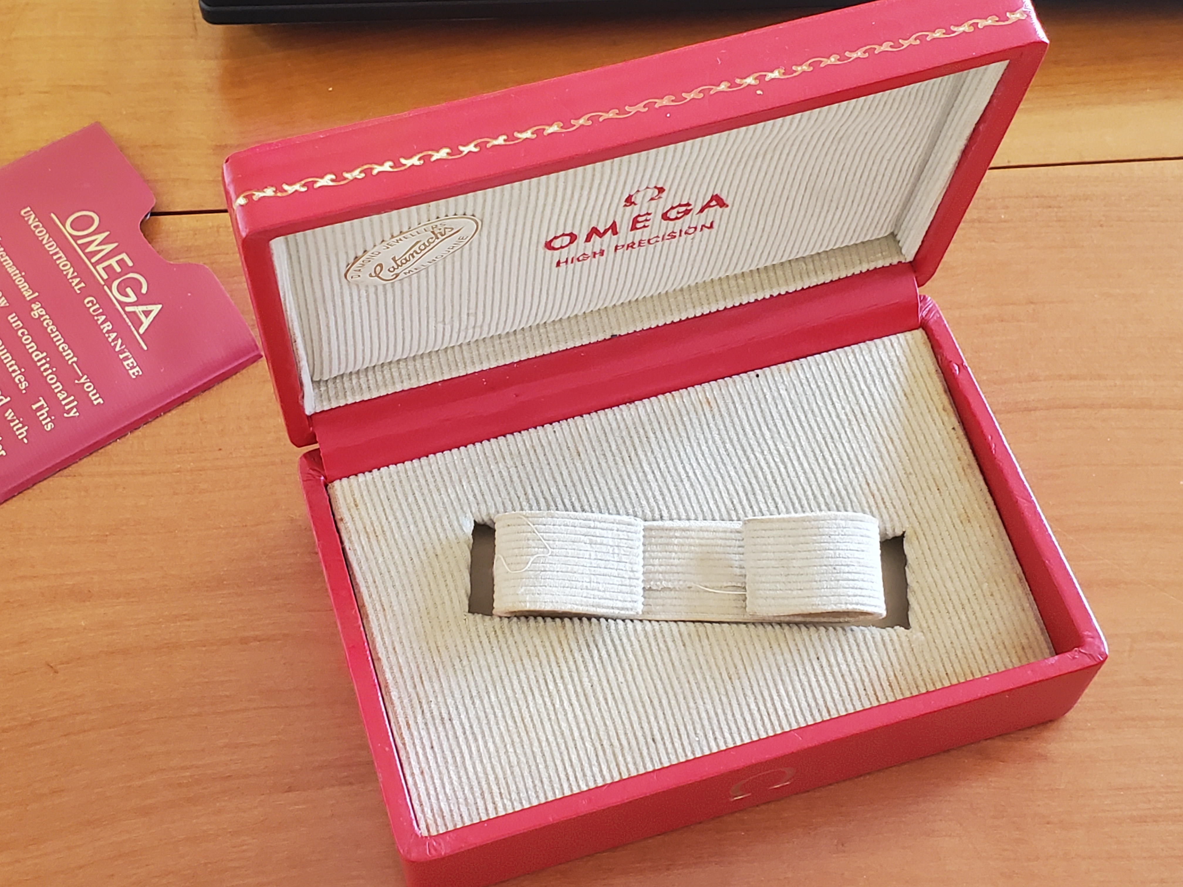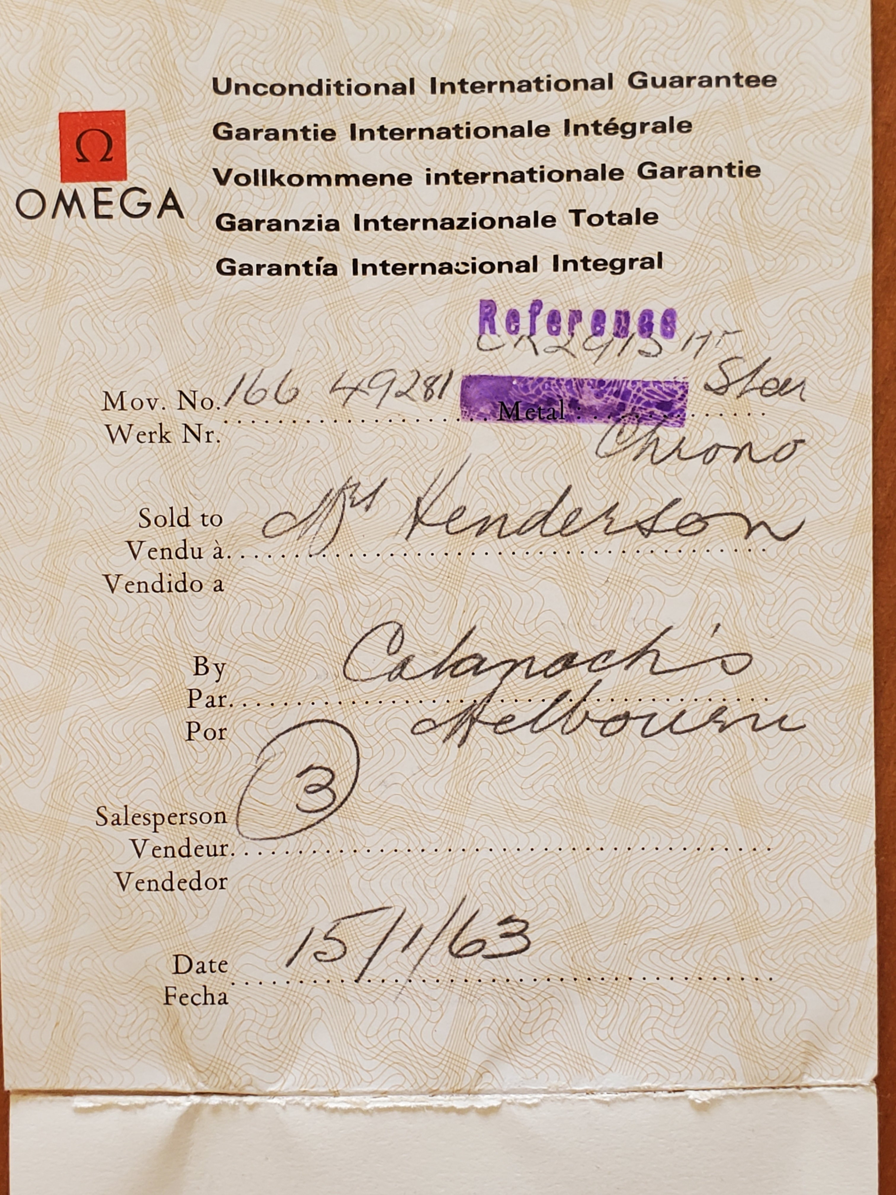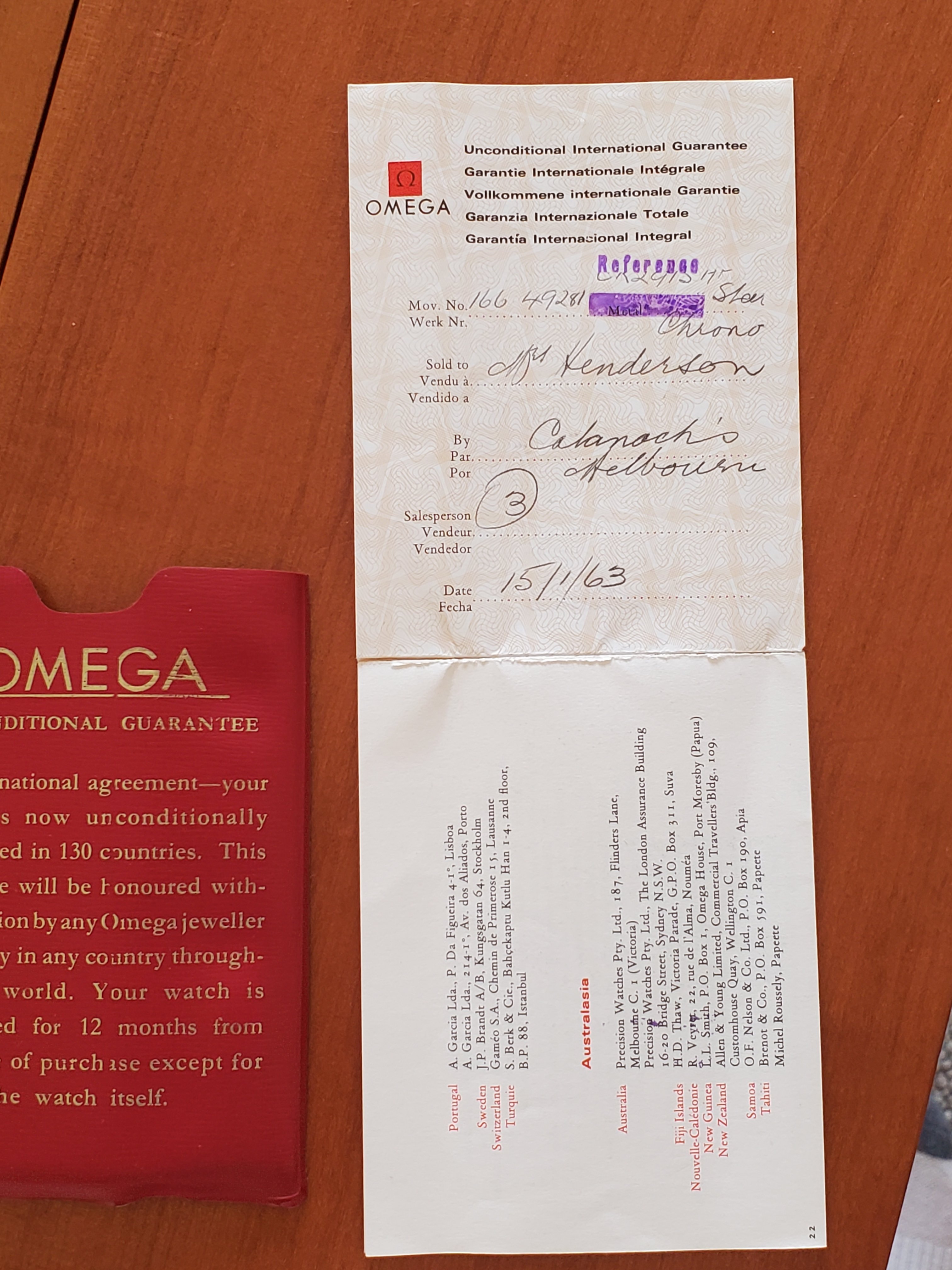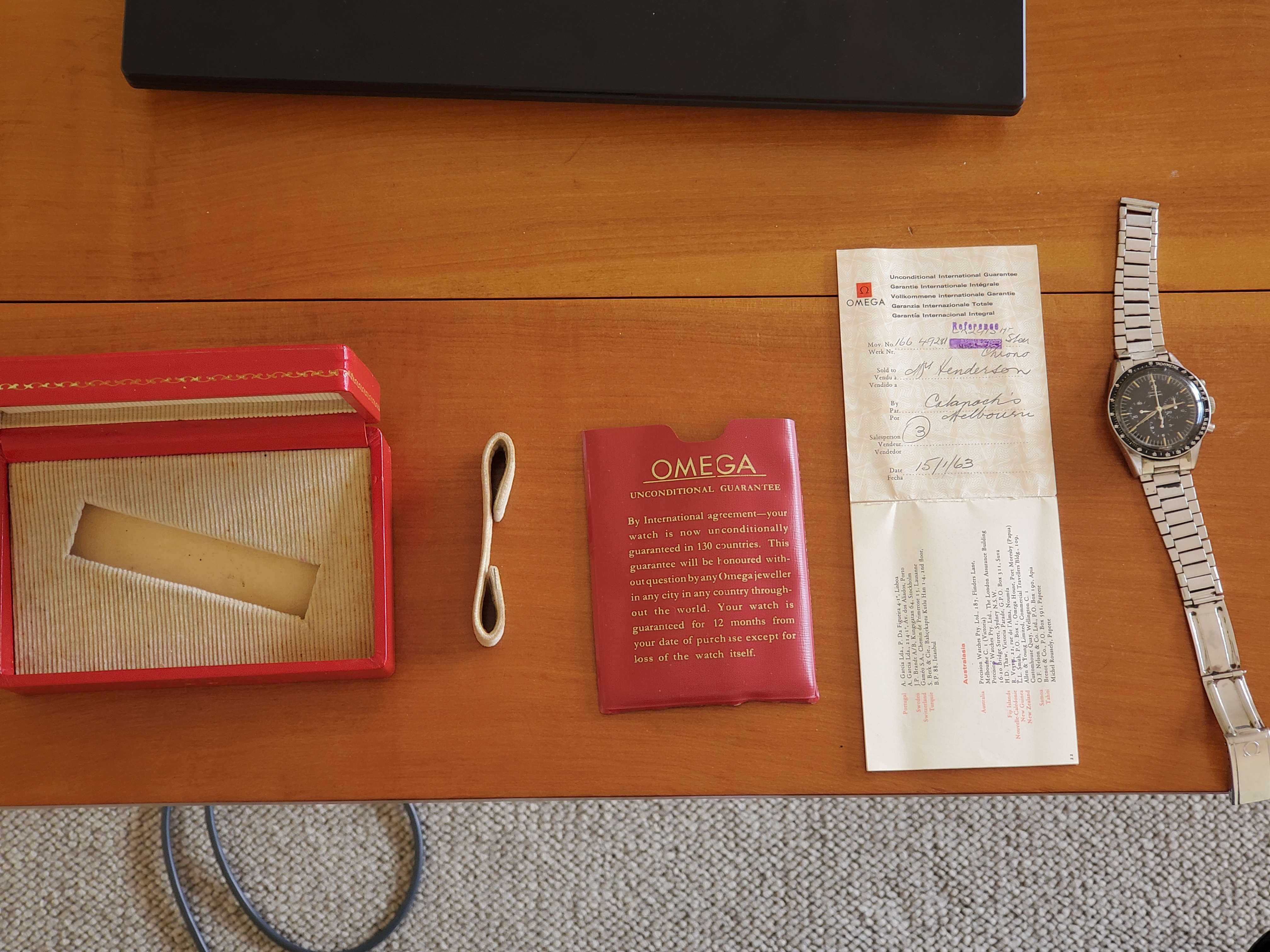 I would like to request some help from the enthusiasts here on identifying a watch inherited from my grandfather, who passed in 2017. Some initial photos will be shown below, and description and thoughts will continue in the post. The watch in question is a Speedmaster 2915-3 purchased from Catanach's Melbourne, Australia on 15th January 1963. This was a reputable jeweler of the era. Original box and paperwork is included. The watch was gifted by my grandmother and was worn by my grandfather every day in Melbourne until a debilitating stroke took hold of him in 2015. It has since been sitting in a safe for the past 8 years. My father and I are a little afraid to wear it, though it is greatly admired by us both. This was certainly a special and well-loved watch, and it is time to find out more about it. It has been wound up and is working next to me as I write (we'll see how well it keeps the time...)