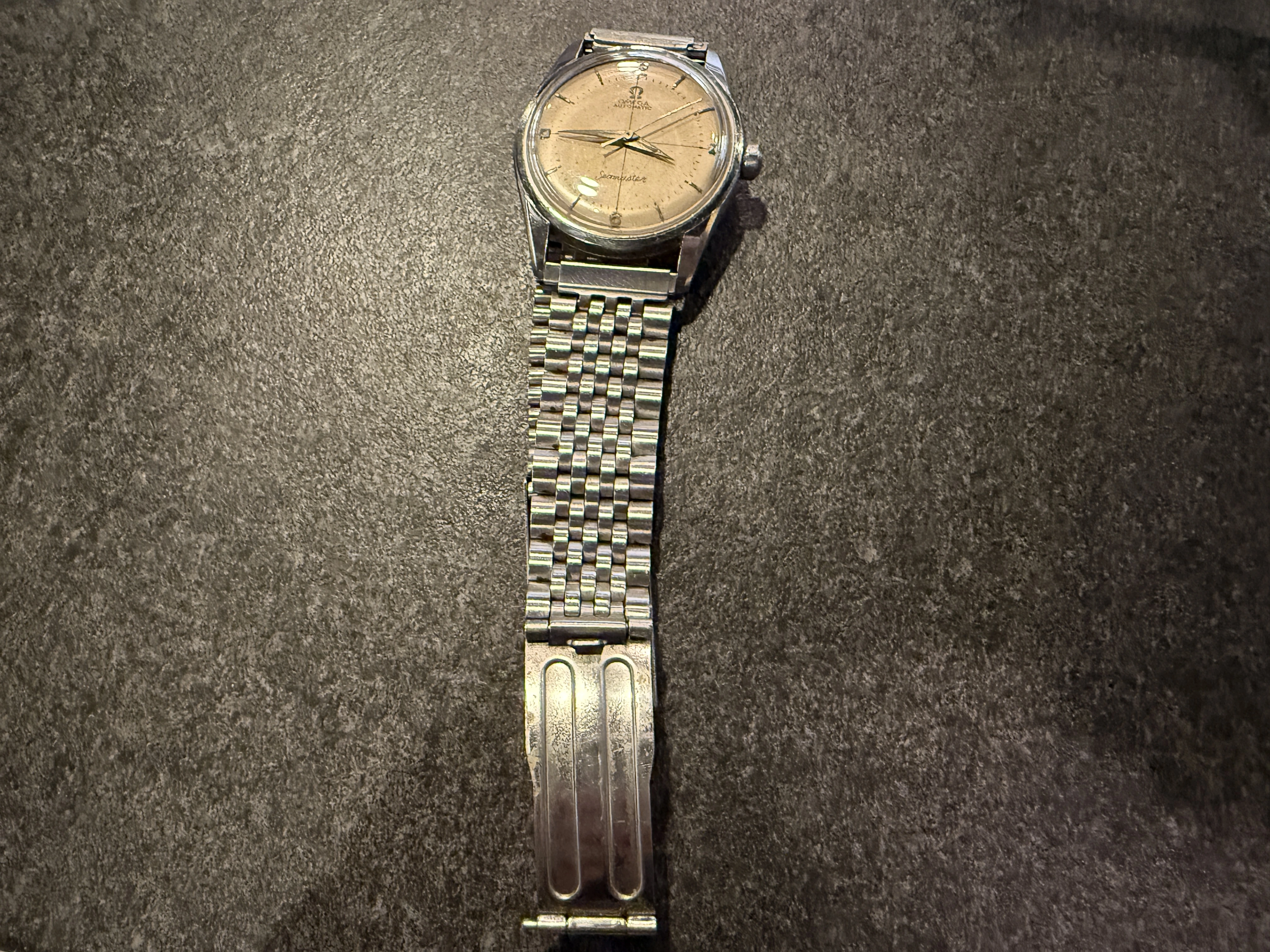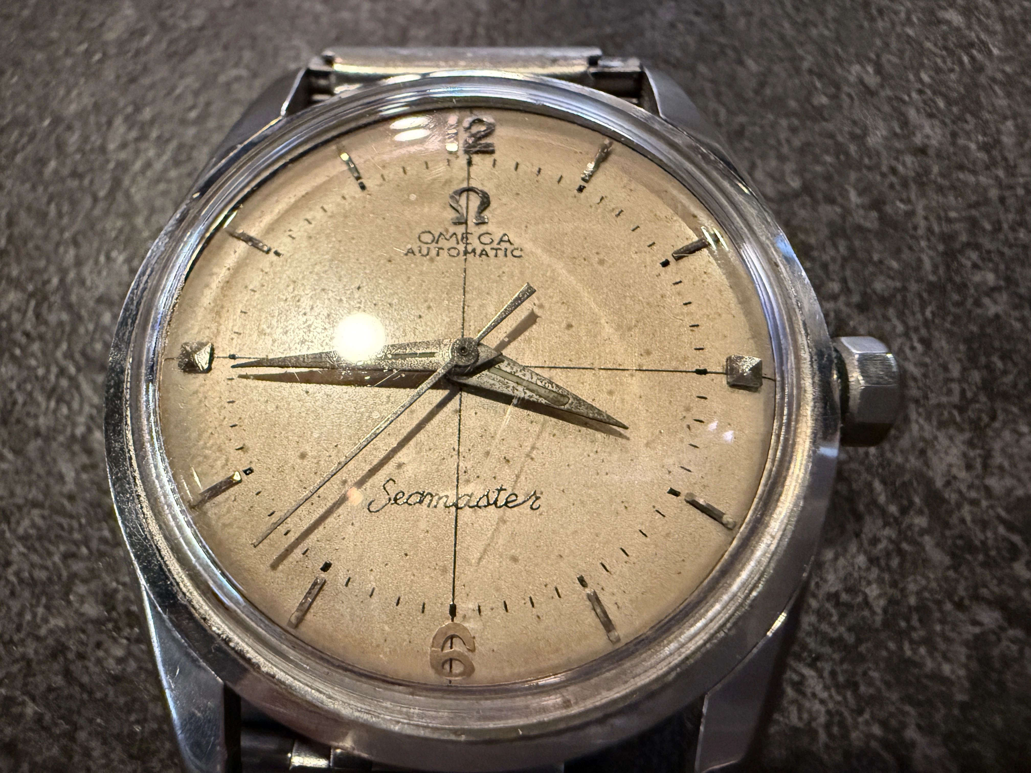 My father recently passed away and I inherited a few of his watches. I searched online but couldn't find an exact match for this Omega Seamaster. I believe the watch was given to him by his brother who bought it while he was in Europe. I'd love to know if its original (I know the band is newer and NOT original), resources of how to clean it up and whether there's places to find original bands for sale. Thanks for any help!!