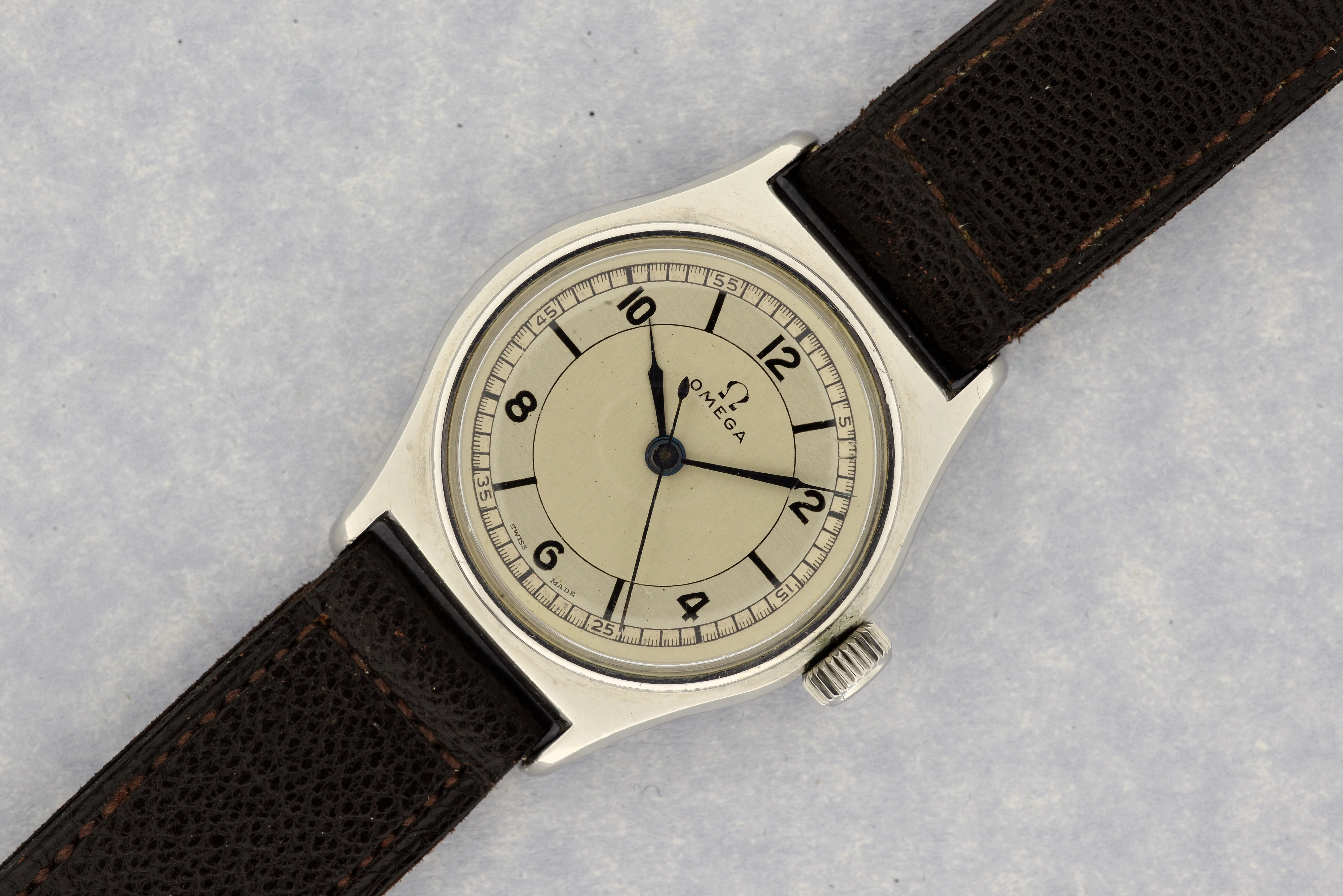 Unfortunately, the dial is not original, it has been repainted, although many years ago. There are various signs, but perhaps the most obvious is the shape of the Omega symbol. Repainting dials was a common approach to restoration of damaged or aged dials, and we even a standard service offered by watchmakers.