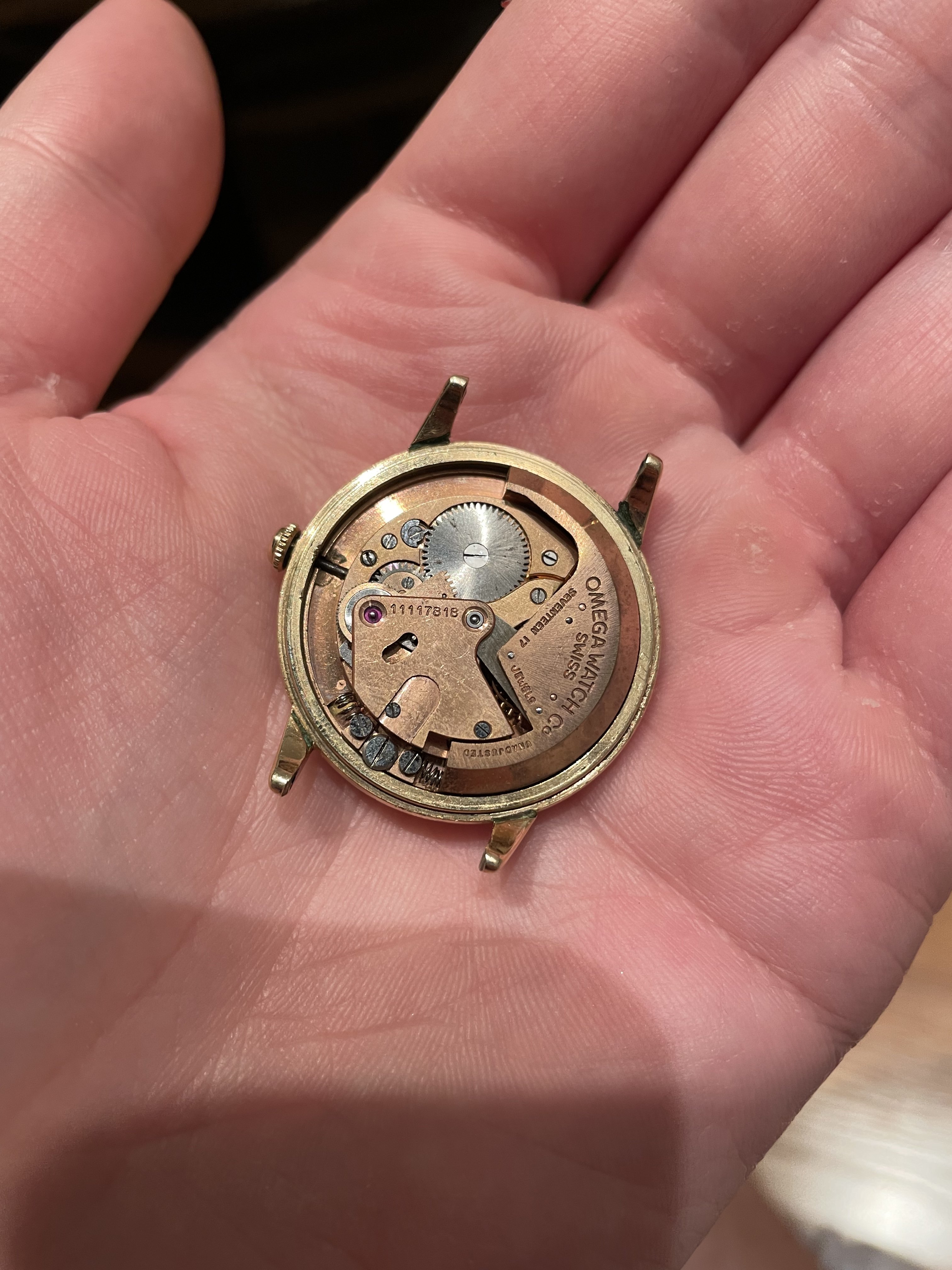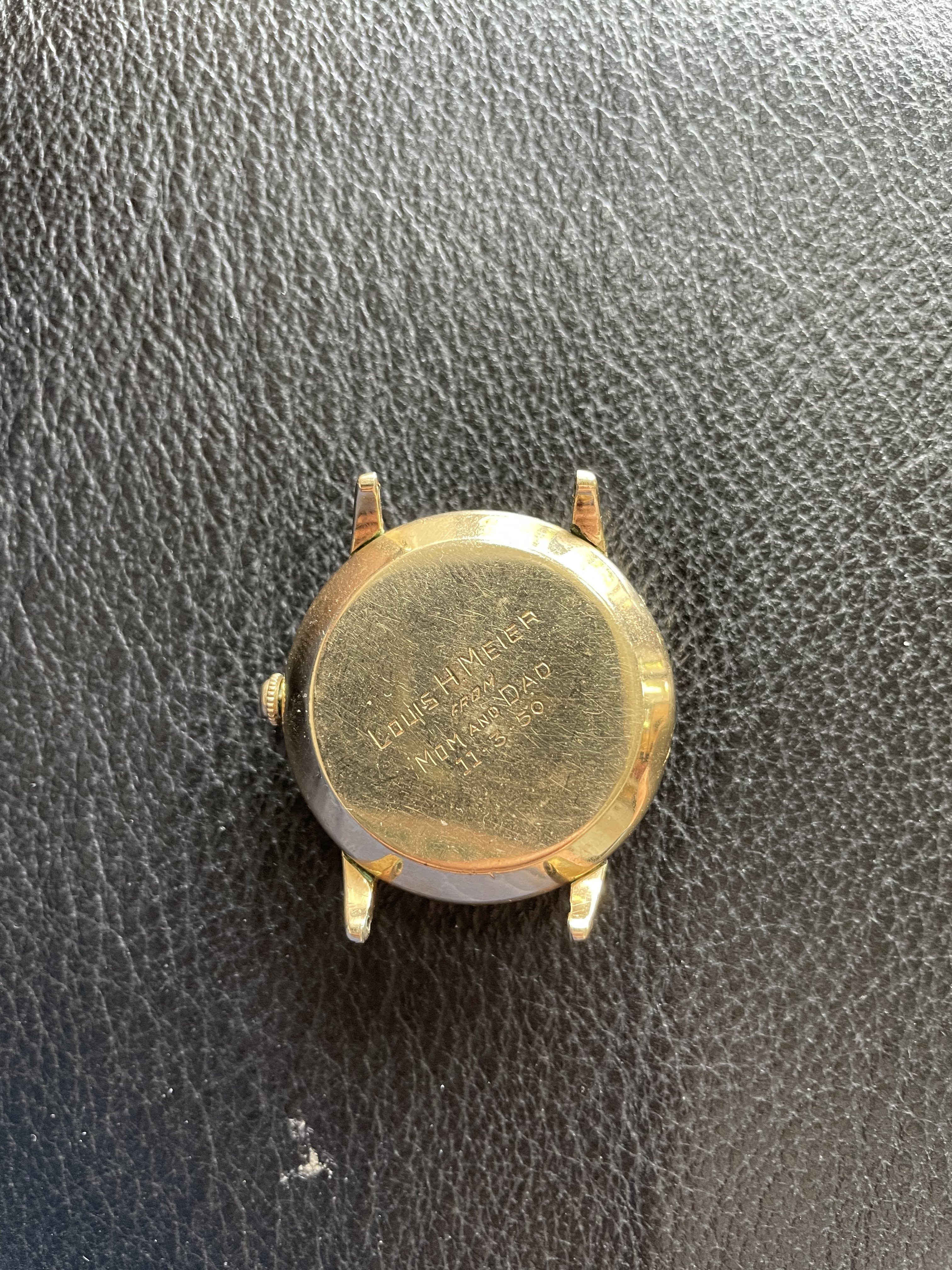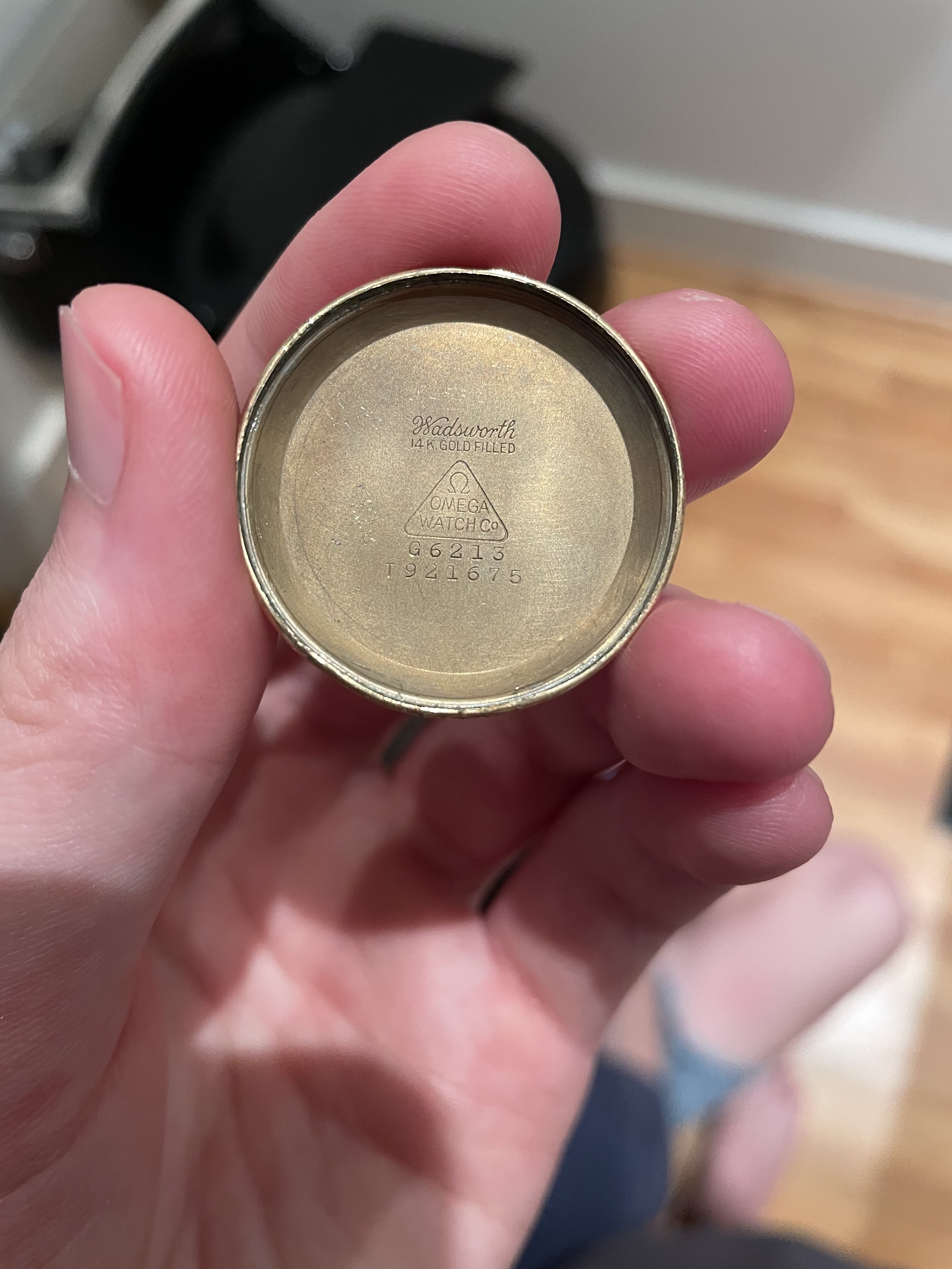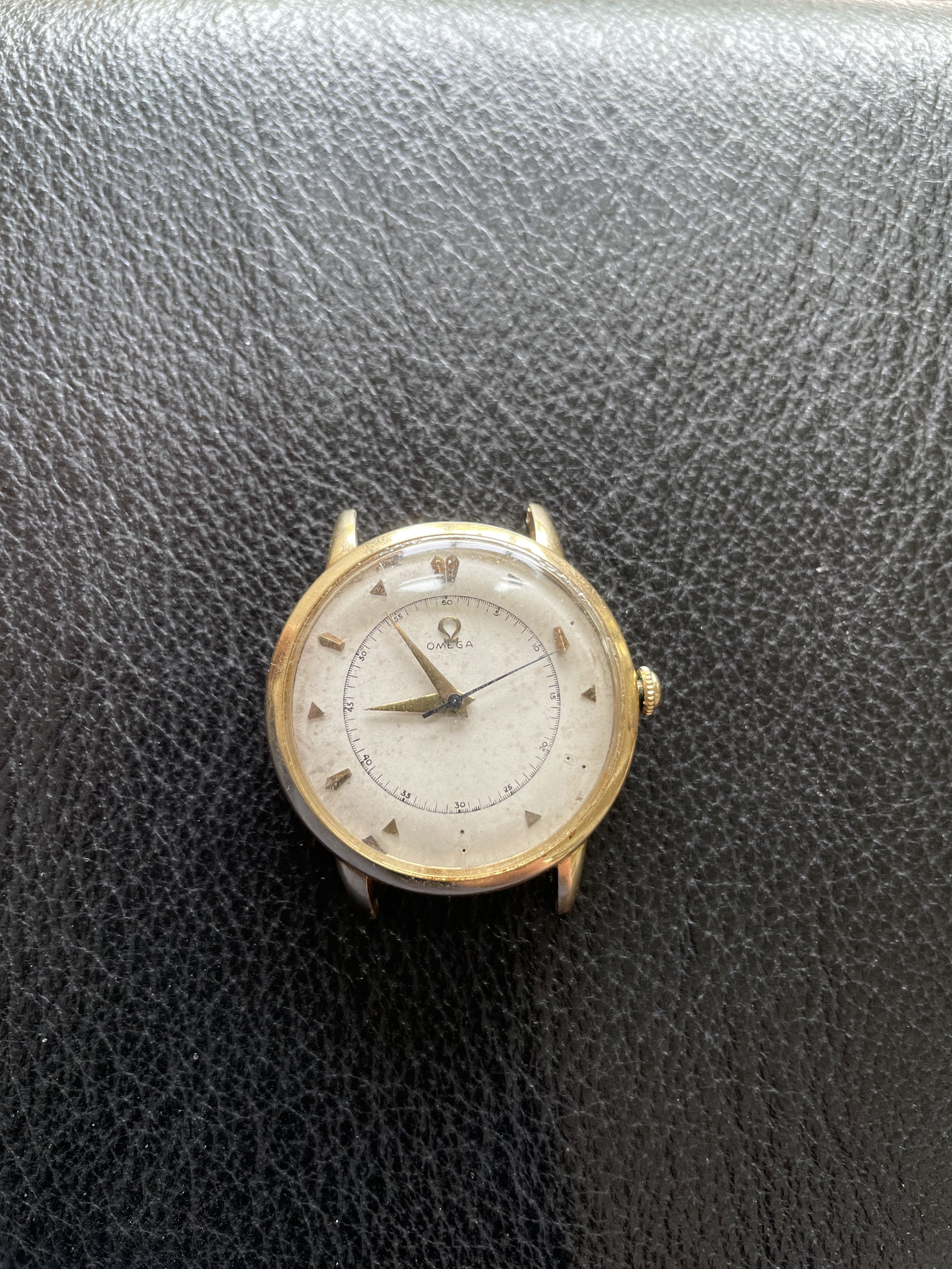This is my grandfathers watch gifted to him in 1950. In wondering if anyone can help me identify what model it is? I was questioning the authenticity because the dial looked strange but I opened the back and I think everything looked good so I’m now thinking a possible poor redial. I’ve never seen such a bent Omega logo though. Thank you in advance!