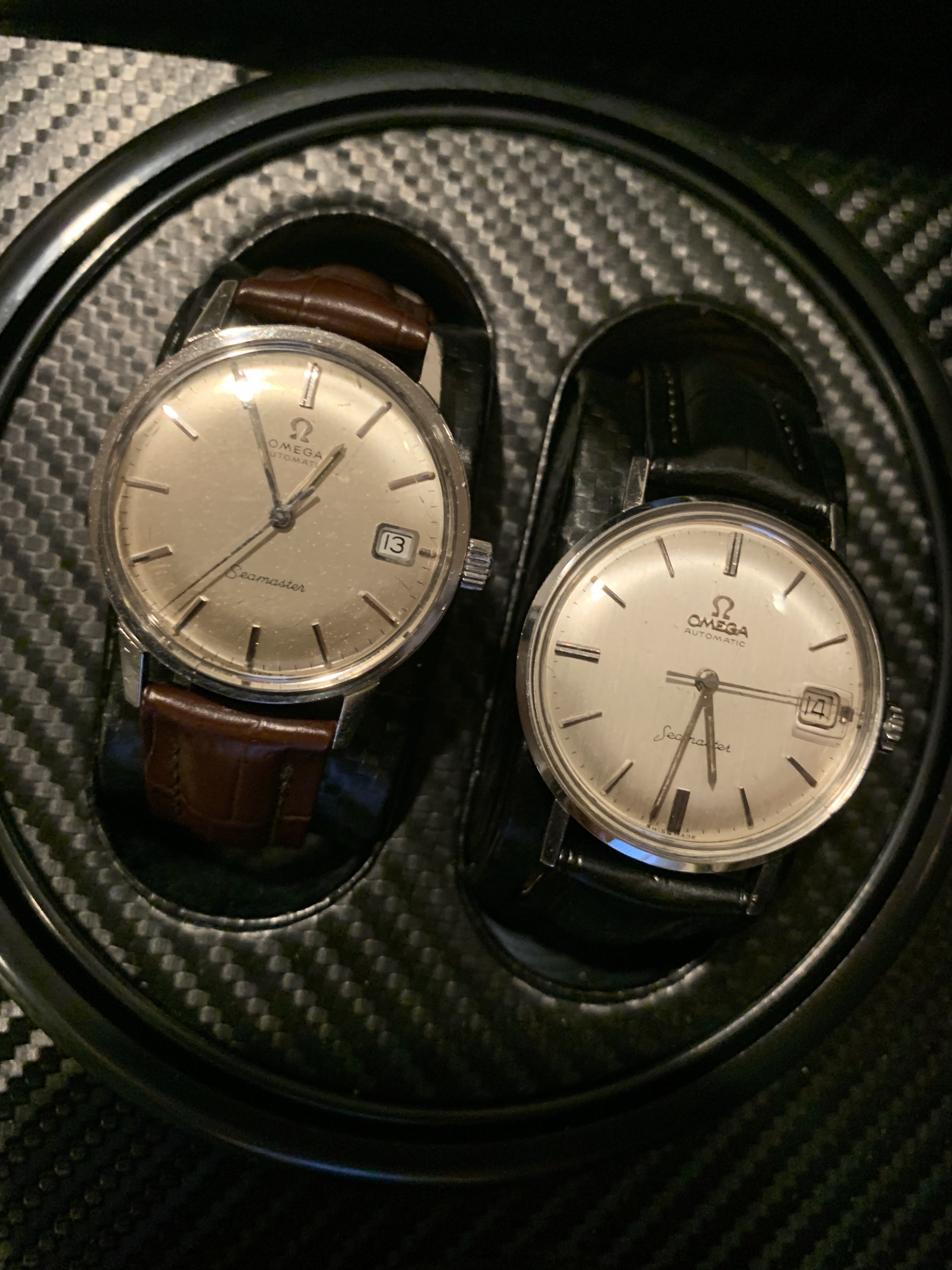 i am new to the forum and excited to learn. I was recently gifted two older Onega Seamaster dress watches from a dear friends widow. She had no information with them or knowledge of their age or anything like that and I was hoping g someone could educate me on exactly what these are, when they were made, etc. they are both marked Seamaster on the dial. The black strap watch has an internal